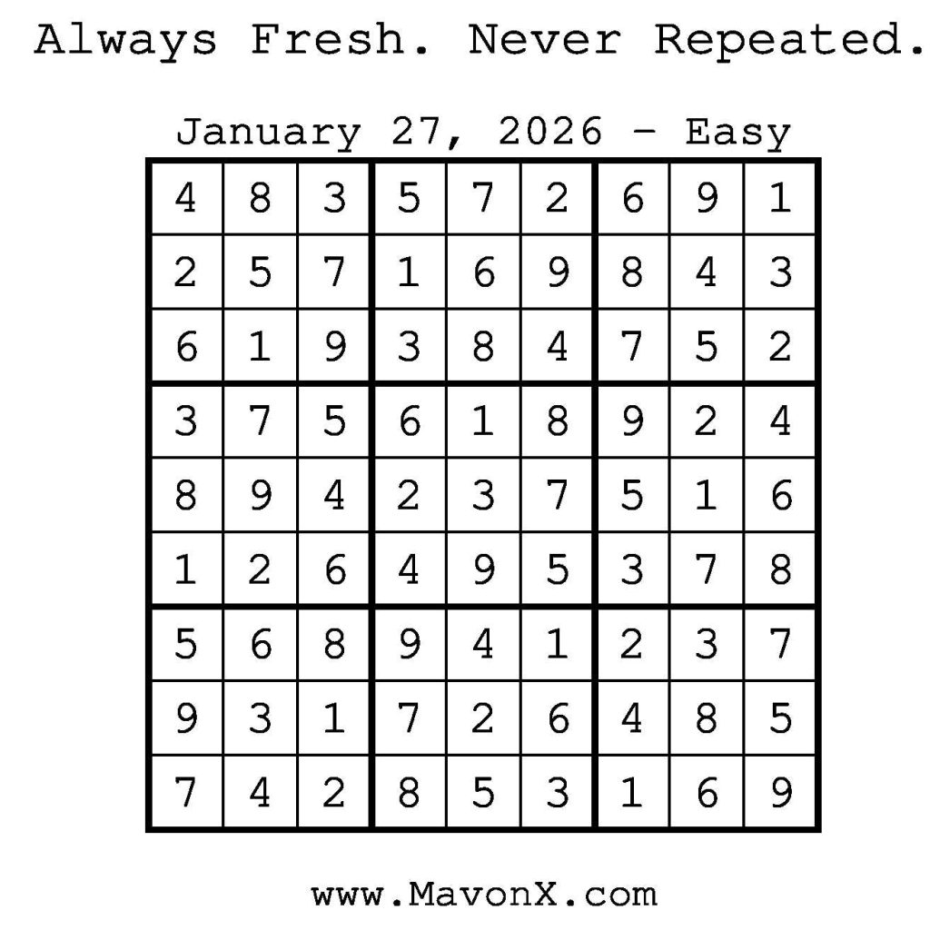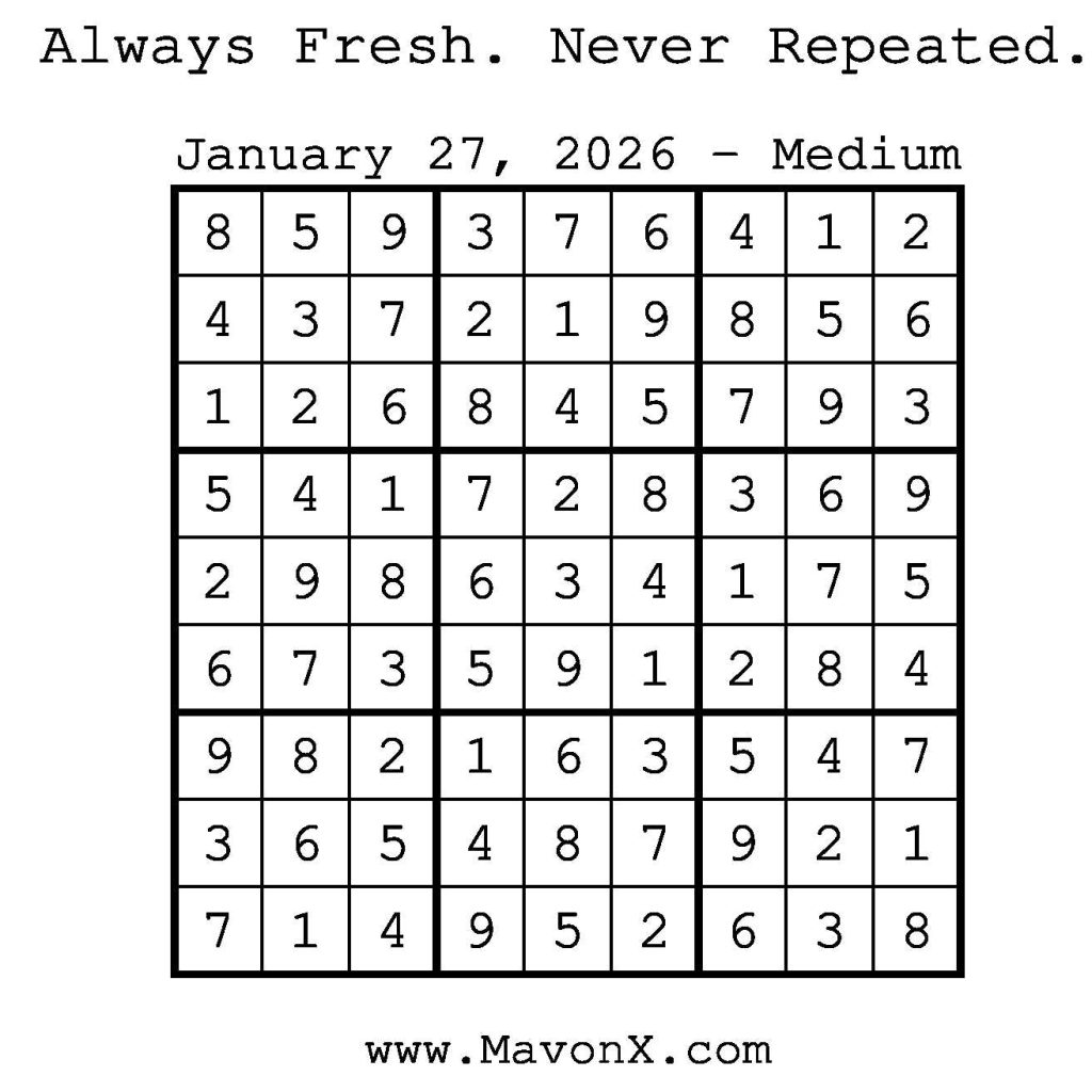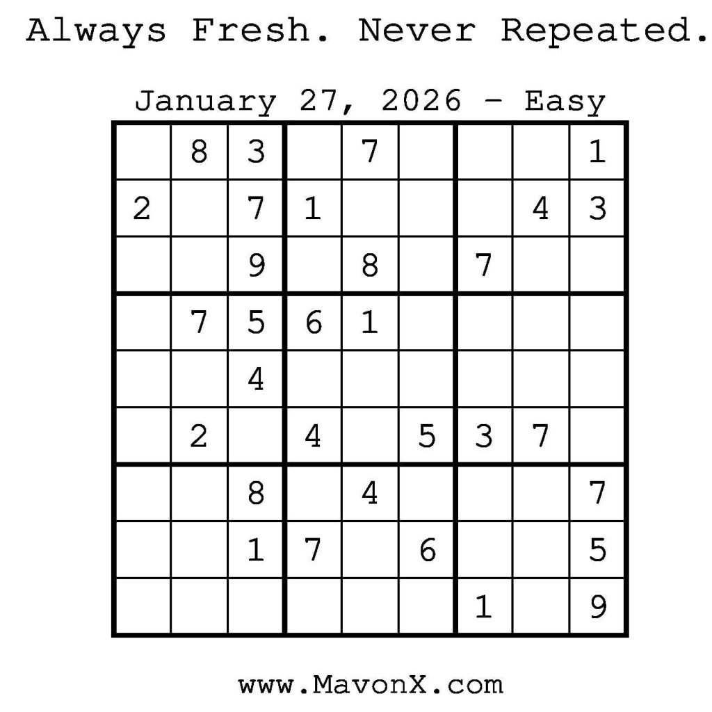 Puzzles of the Day – January 27, 2026 Post author:admin Post published:January 27, 2026 Post category:Free Stuff / Puzzle of the Day / Puzzle of the Day Solutions / Solutions Post comments:0 Comments Check out our books on Amazon! Check out our books on Barnes and Noble! Check out our books on Etsy! Easy Sudoku Coach Link Medium Sudoku Coach Link Hard Sudoku Coach Link Show Solution You Might Also Like Puzzles of the Day – June 30, 2025 July 1, 2025 Puzzles of the Day – May 24, 2025 May 24, 2025 Puzzles of the Day – January 23, 2026 January 22, 2026 Leave a Reply Cancel replyCommentEnter your name or username to comment Enter your email address to comment Enter your website URL (optional) Save my name, email, and website in this browser for the next time I comment.