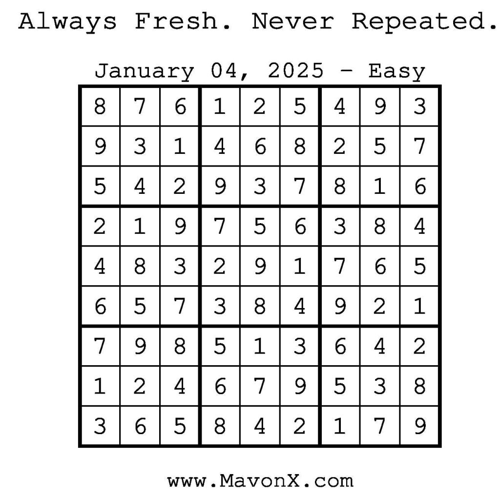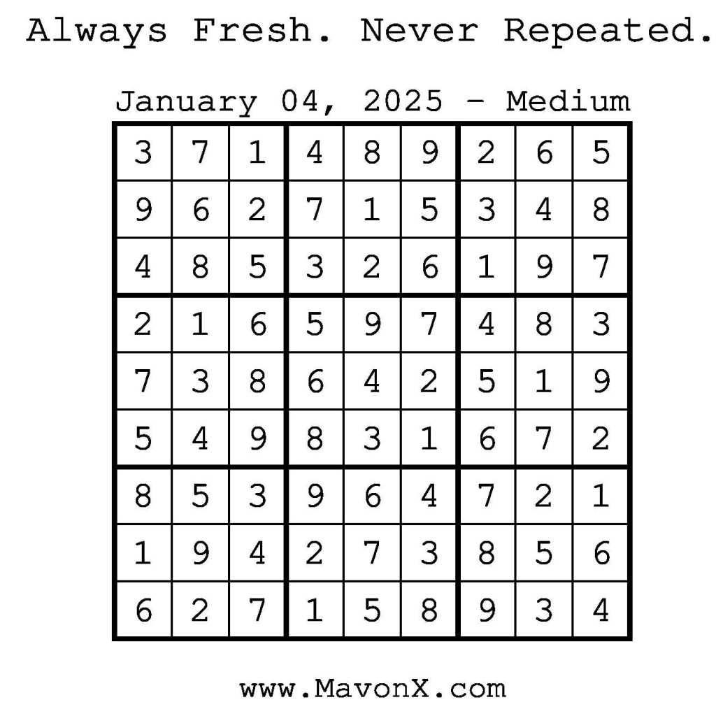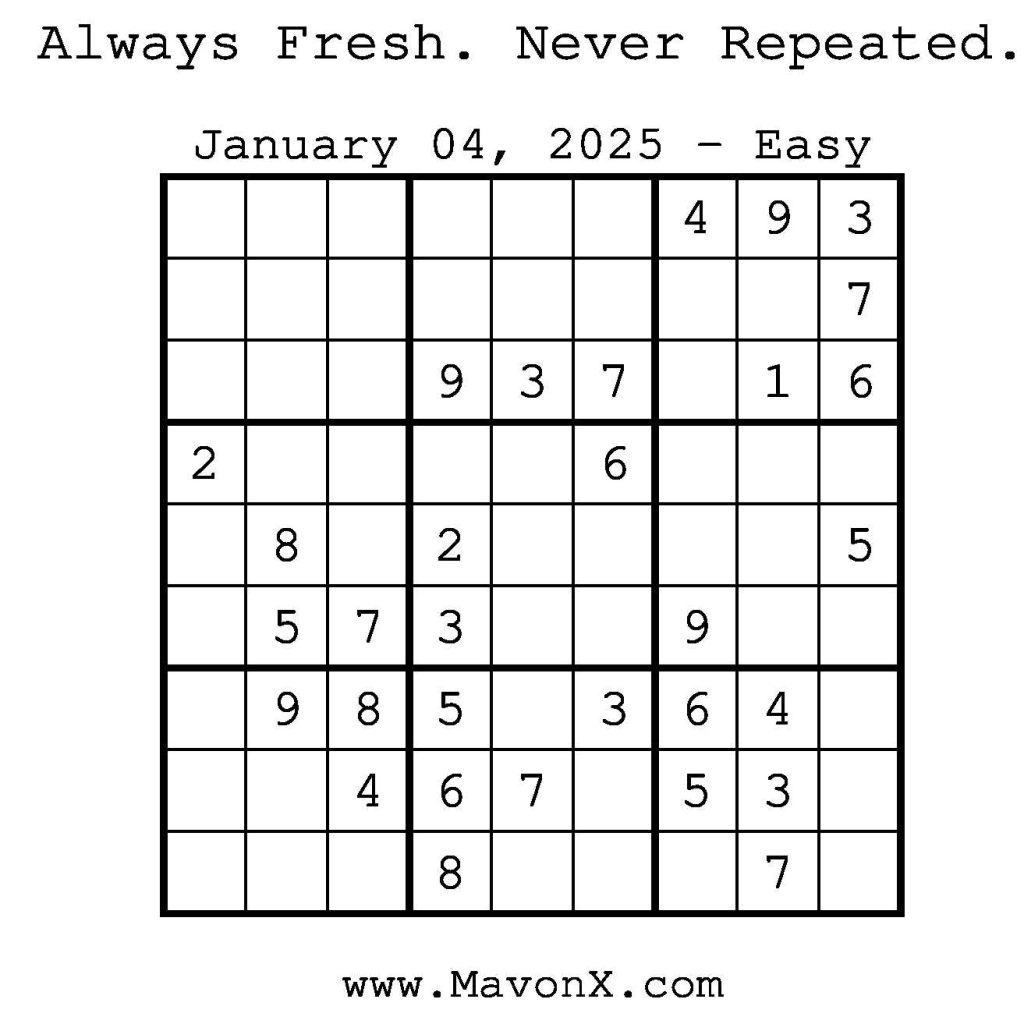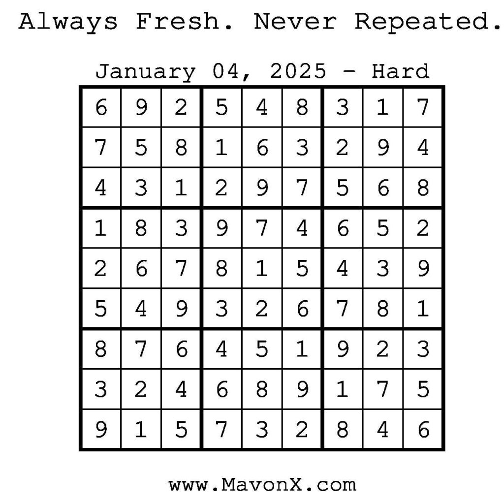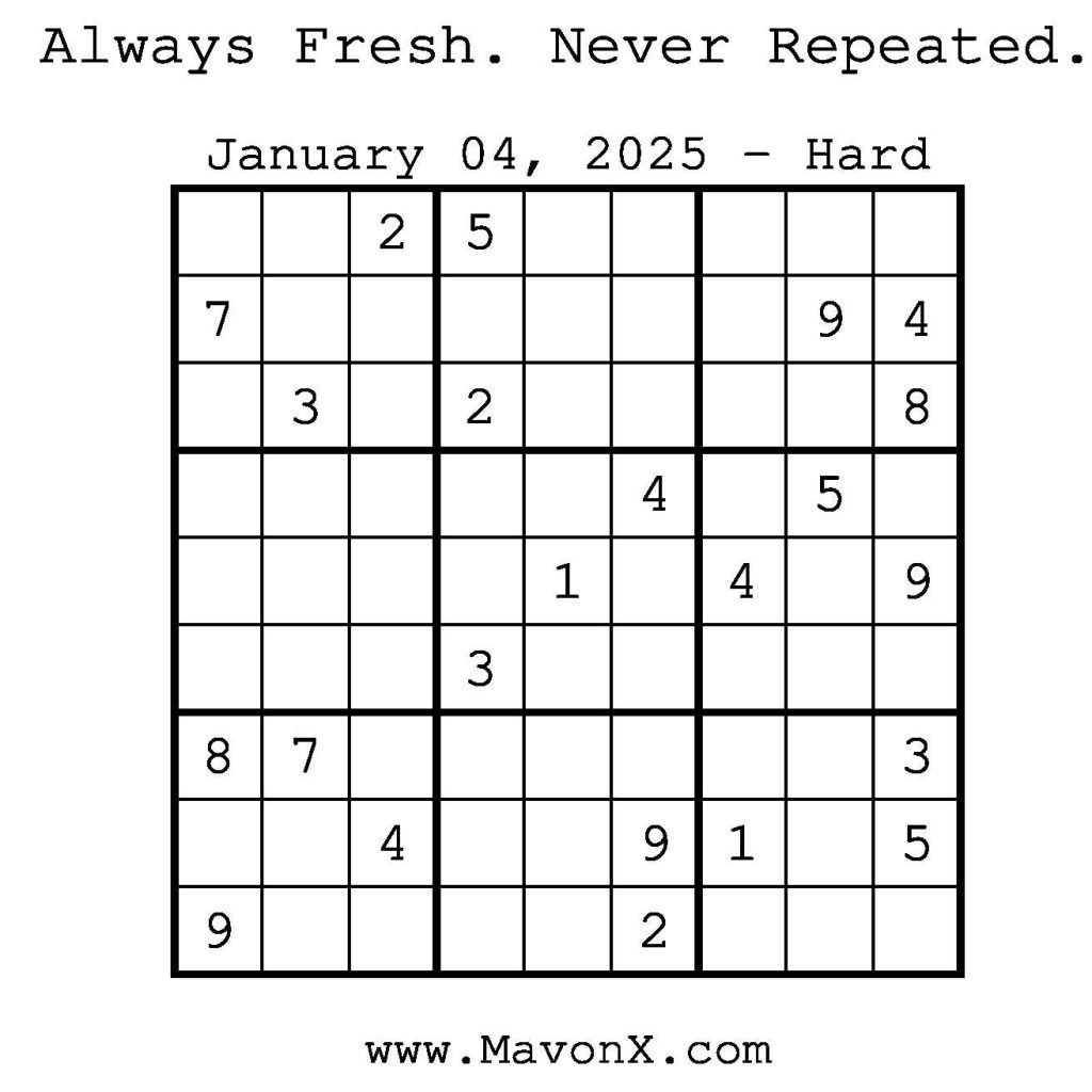 Puzzles of the Day – January 4, 2025 Post author:admin Post published:January 4, 2025 Post category:Free Stuff / Puzzle of the Day / Puzzle of the Day Solutions / Solutions Post comments:0 Comments Check out our books on Amazon! Check out our books on Barnes and Noble! Check out our books on Etsy! Easy Sudoku Coach Link Medium Sudoku Coach Link Hard Sudoku Coach Link Show Solution You Might Also Like Puzzles of the Day – January 16, 2026 January 15, 2026 Puzzles of the Day – October 18, 2025 October 17, 2025 Puzzles of the Day – November 7, 2024 November 6, 2024 Leave a Reply Cancel replyCommentEnter your name or username to comment Enter your email address to comment Enter your website URL (optional) Save my name, email, and website in this browser for the next time I comment.