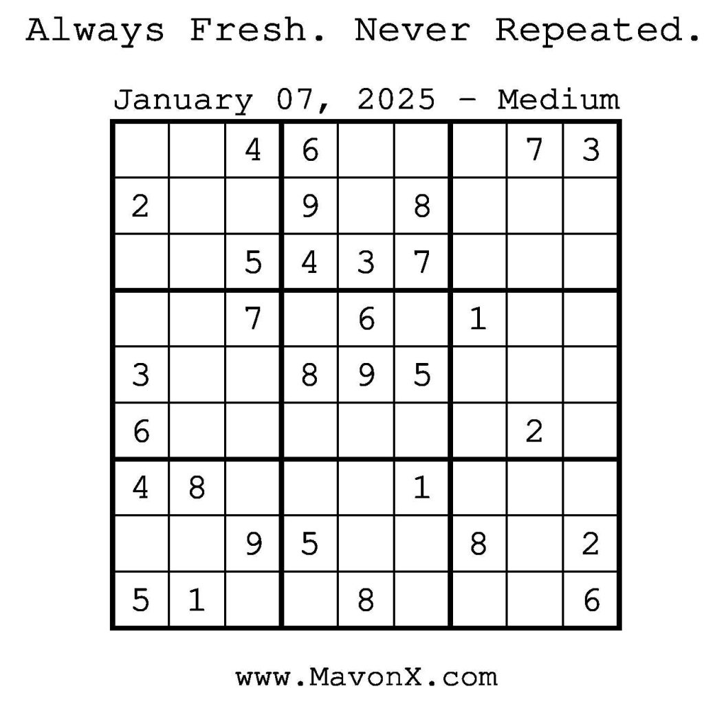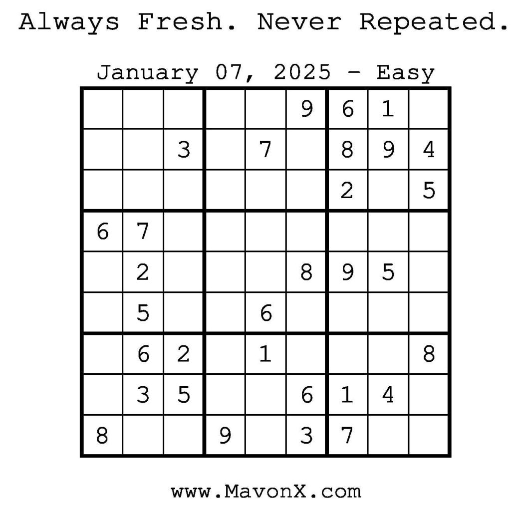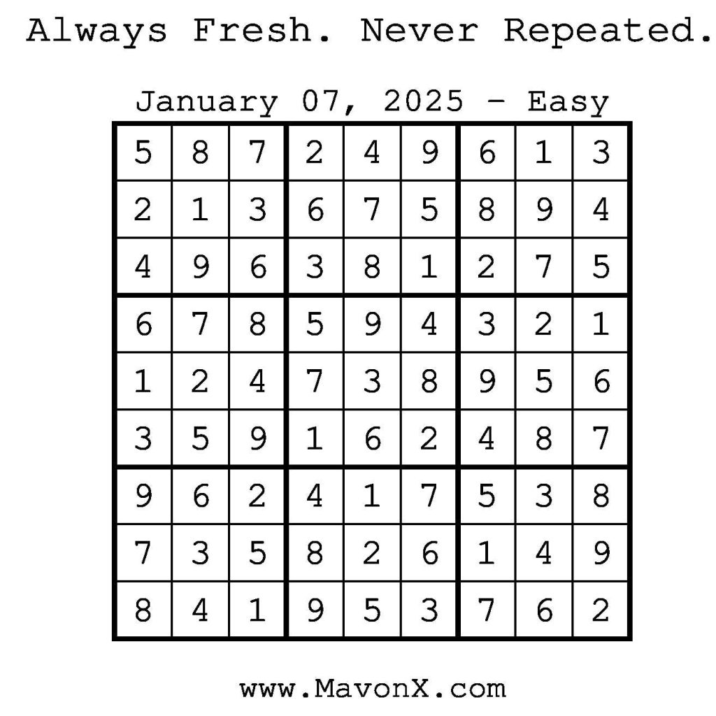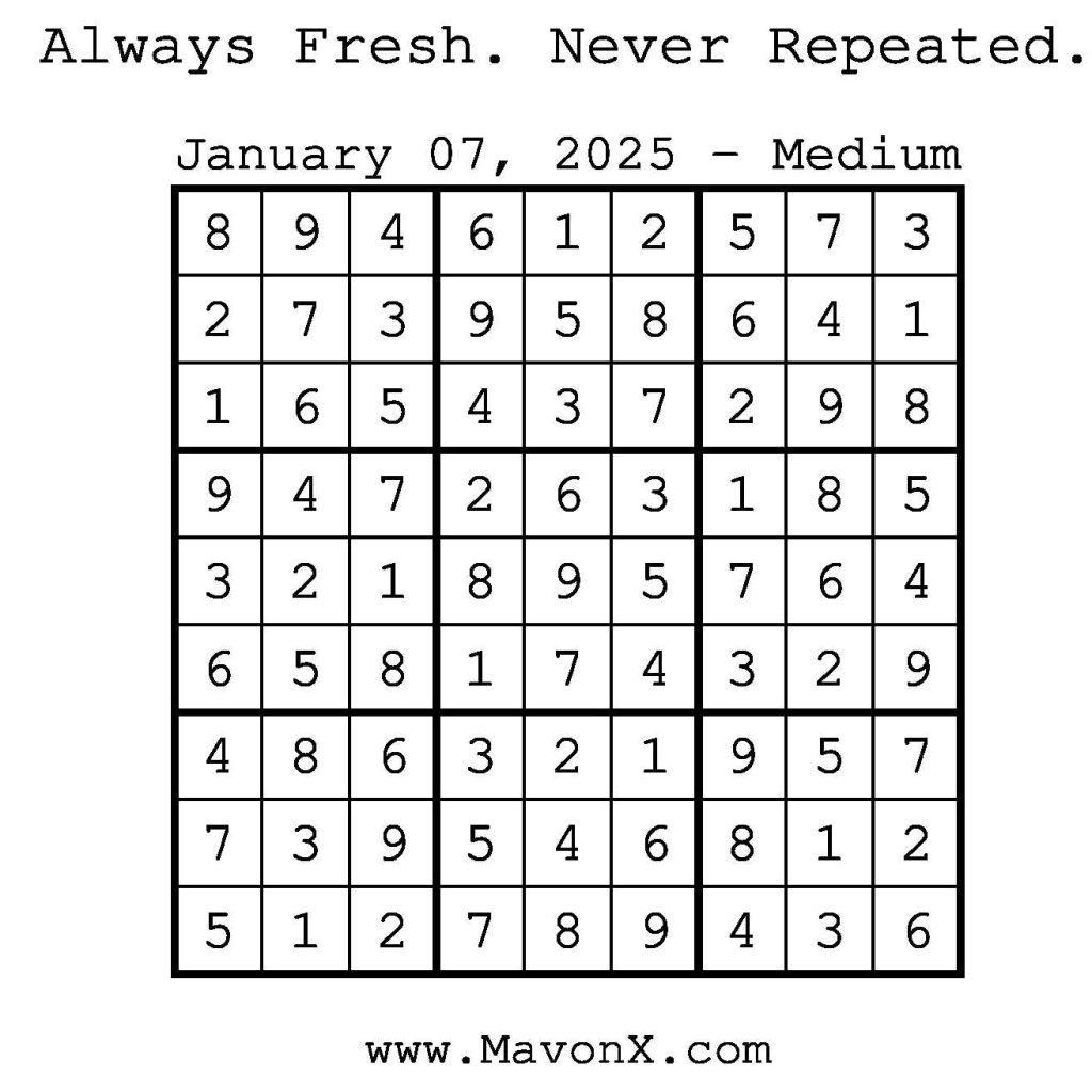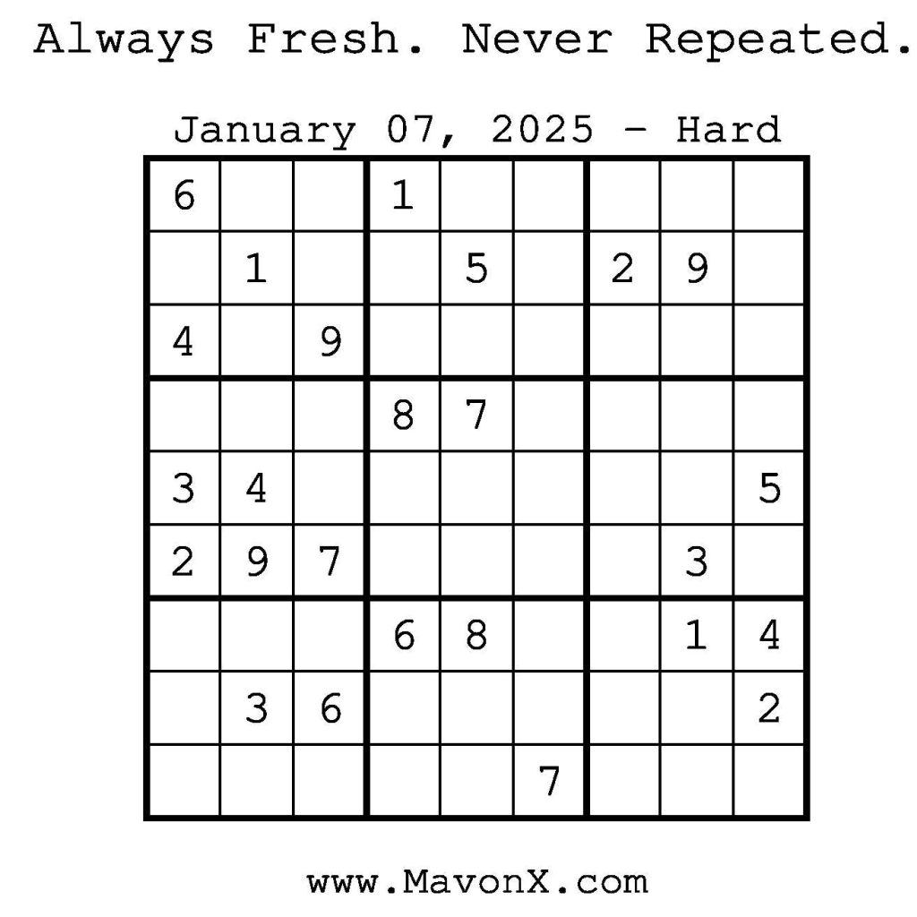 Puzzles of the Day – January 7, 2025 Post author:admin Post published:January 7, 2025 Post category:Free Stuff / Puzzle of the Day / Puzzle of the Day Solutions / Solutions Post comments:0 Comments Check out our books on Amazon! Check out our books on Barnes and Noble! Check out our books on Etsy! Easy Sudoku Coach Link Medium Sudoku Coach Link Hard Sudoku Coach Link Show Solution You Might Also Like Puzzles of the Day – February 28, 2026 February 27, 2026 Puzzles of the Day – March 30, 2026 March 31, 2026 Puzzles of the Day – March 31, 2026 March 29, 2026 Leave a Reply Cancel replyCommentEnter your name or username to comment Enter your email address to comment Enter your website URL (optional) Save my name, email, and website in this browser for the next time I comment.