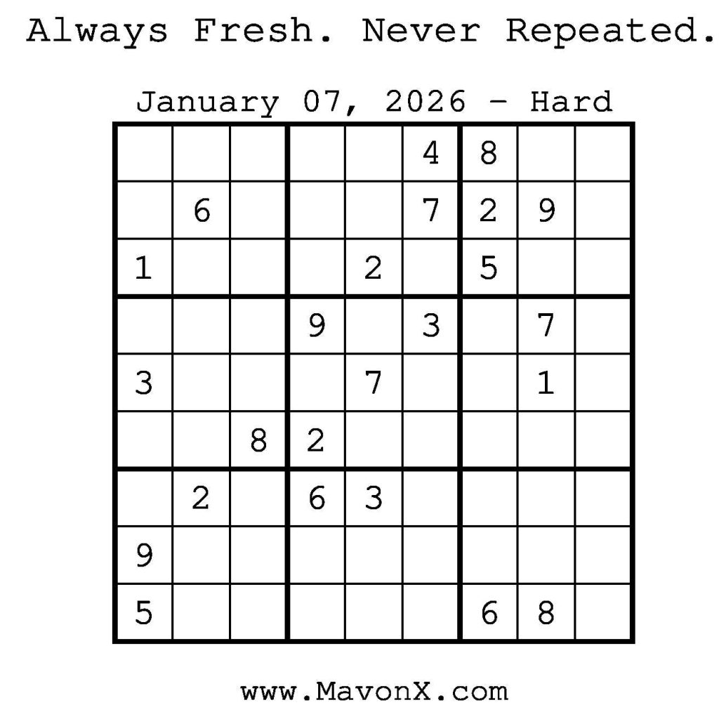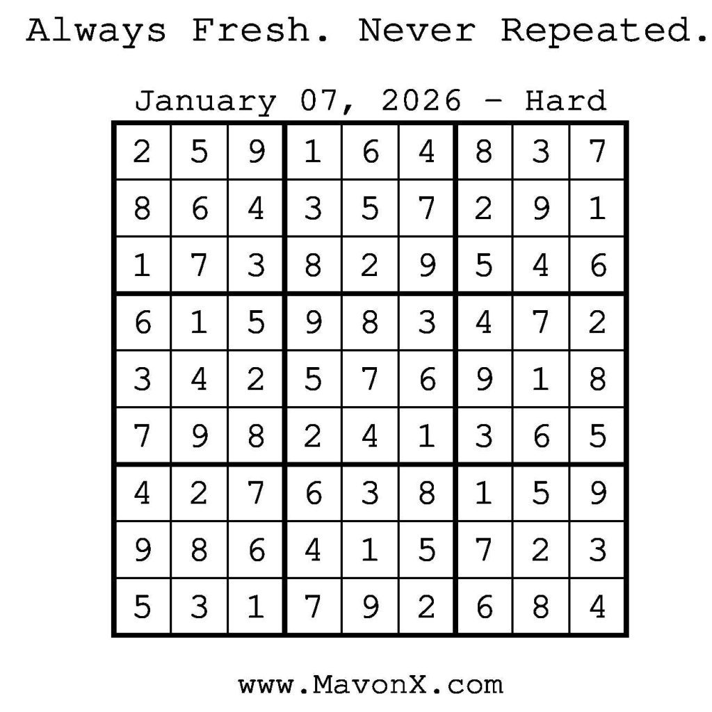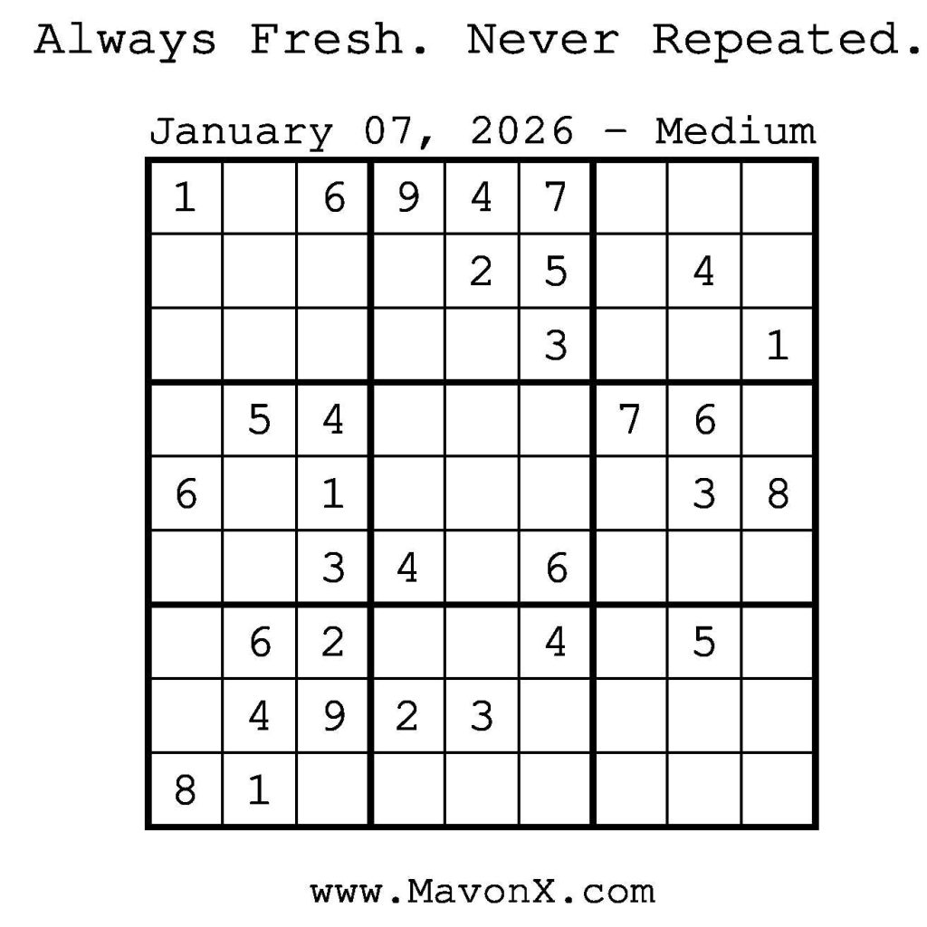Puzzles of the Day – January 7, 2026 Post author:admin Post published:January 6, 2026 Post category:Free Stuff / Puzzle of the Day / Puzzle of the Day Solutions / Solutions Post comments:0 Comments Check out our books on Amazon! Check out our books on Barnes and Noble! Check out our books on Etsy! Easy Sudoku Coach Link Medium Sudoku Coach Link Hard Sudoku Coach Link Show Solution You Might Also Like Puzzles of the Day – February 10, 2025 February 12, 2025 Puzzles of the Day – November 10, 2025 November 9, 2025 Puzzles of the Day – August 23, 2025 August 22, 2025 Leave a Reply Cancel replyCommentEnter your name or username to comment Enter your email address to comment Enter your website URL (optional) Save my name, email, and website in this browser for the next time I comment.