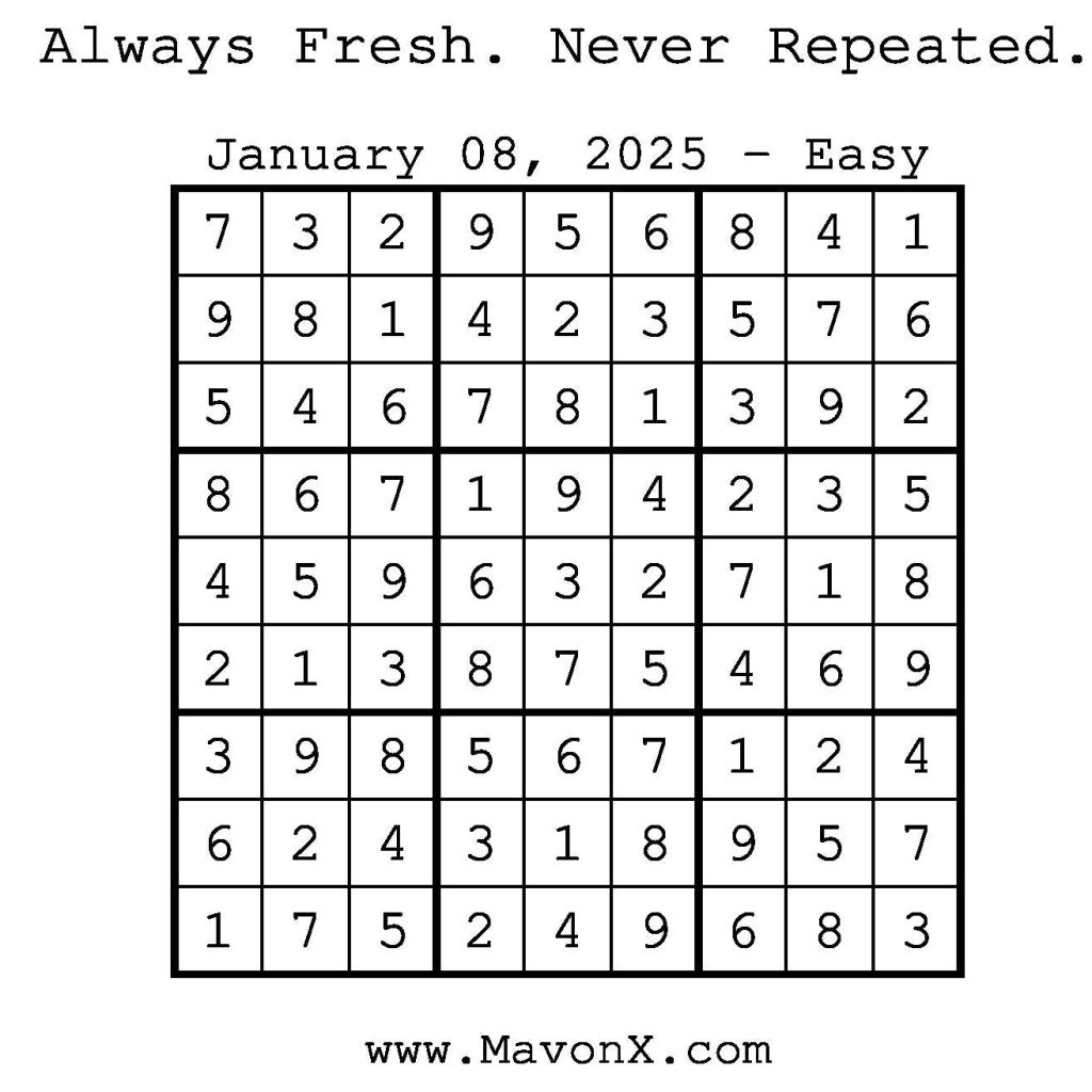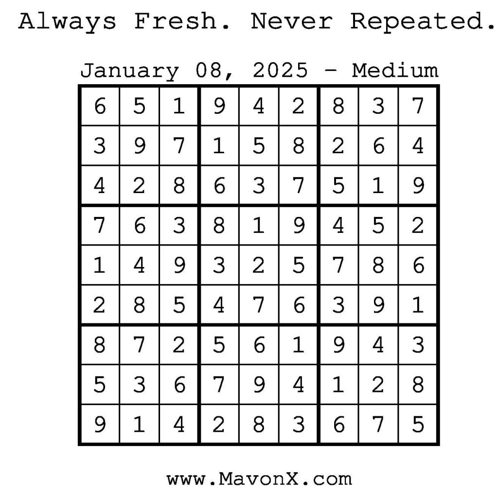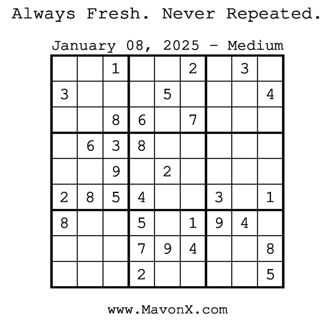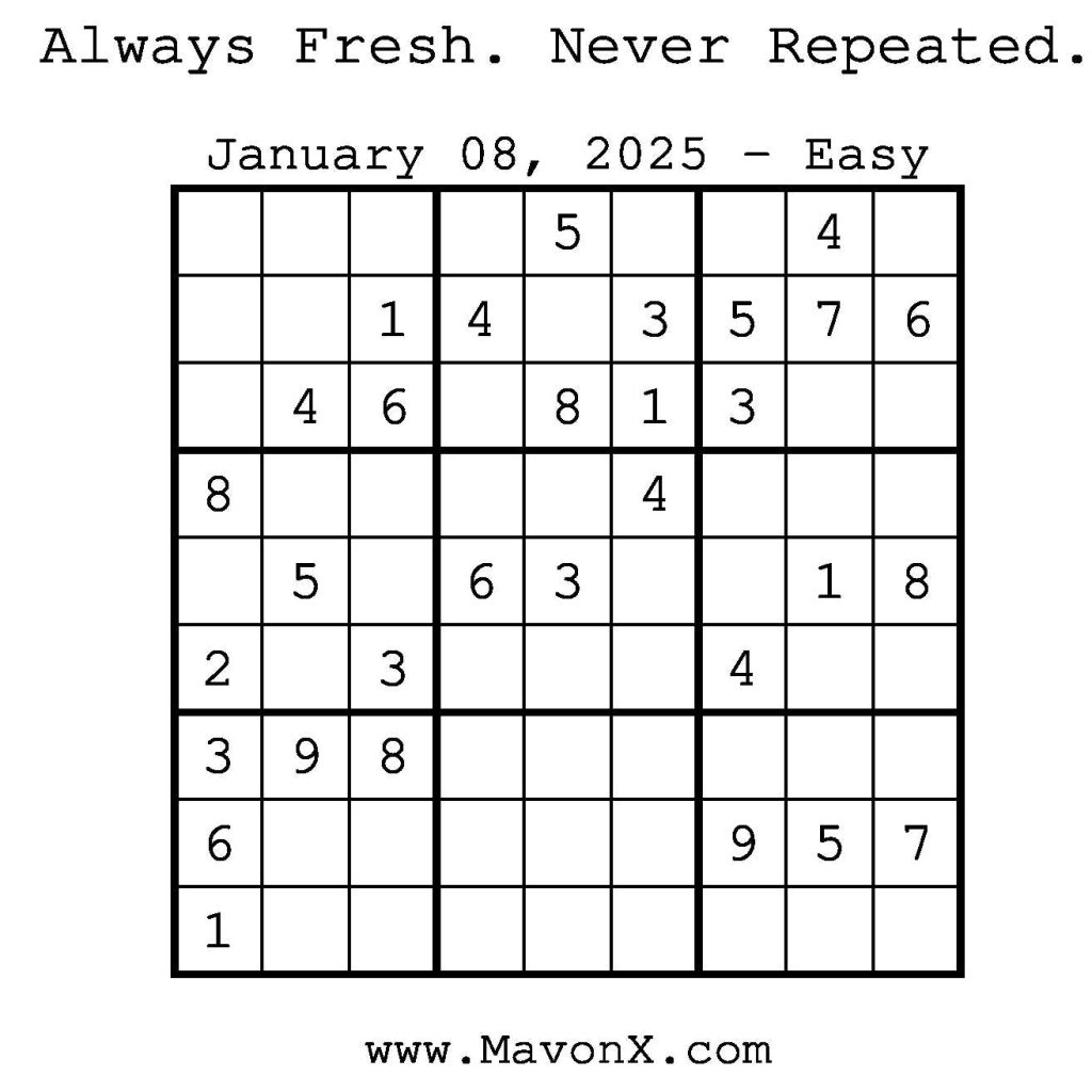 Puzzles of the Day – January 8, 2025 Post author:admin Post published:January 8, 2025 Post category:Free Stuff / Puzzle of the Day / Puzzle of the Day Solutions / Solutions Post comments:0 Comments Check out our books on Amazon! Check out our books on Barnes and Noble! Check out our books on Etsy! Easy Sudoku Coach Link Medium Sudoku Coach Link Hard Sudoku Coach Link Show Solution You Might Also Like Puzzle of the Day – July 11, 2024 July 11, 2024 Puzzles of the Day – December 9, 2024 December 8, 2024 Puzzles of the Day – February 21, 2026 February 21, 2026 Leave a Reply Cancel replyCommentEnter your name or username to comment Enter your email address to comment Enter your website URL (optional) Save my name, email, and website in this browser for the next time I comment.