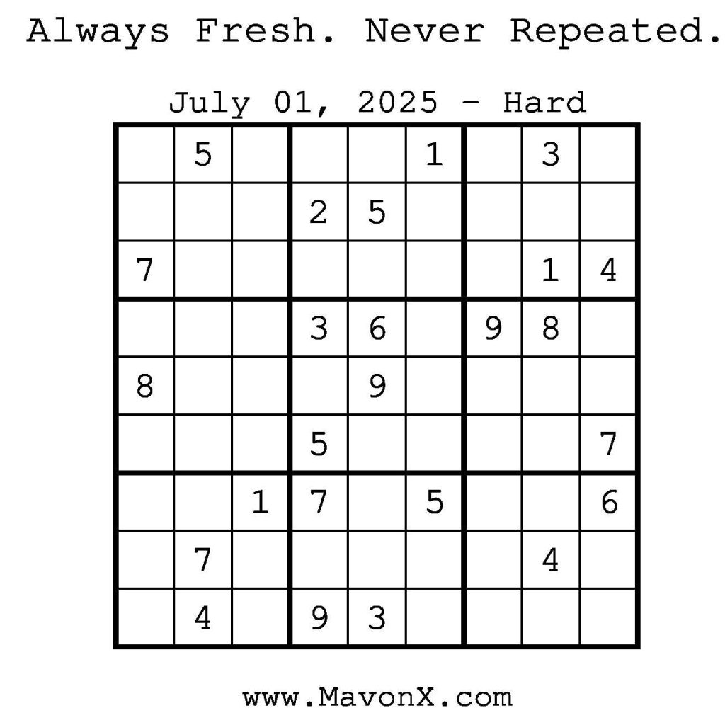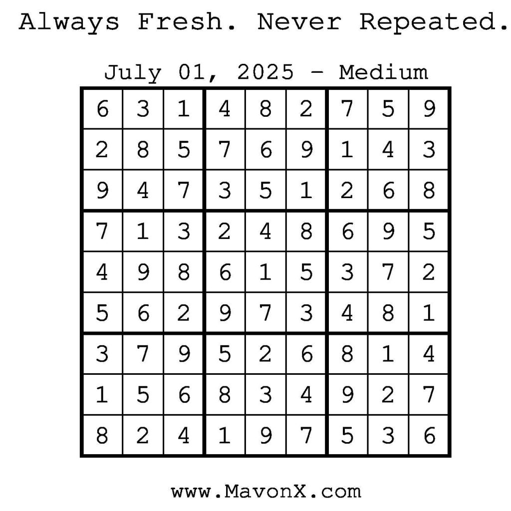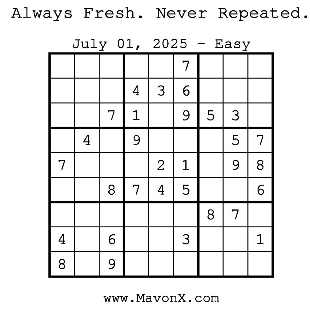 Puzzles of the Day – July 1, 2025 Post author:admin Post published:July 1, 2025 Post category:Free Stuff / Puzzle of the Day / Puzzle of the Day Solutions / Solutions Post comments:0 Comments Check out our books on Amazon! Check out our books on Barnes and Noble! Check out our books on Etsy! Easy Sudoku Coach Link Medium Sudoku Coach Link Hard Sudoku Coach Link Show Solution You Might Also Like Puzzles of the Day – November 30, 2025 November 29, 2025 Puzzles of the Day – March 9, 2026 March 9, 2026 Puzzles of the Day – March 13, 2026 March 13, 2026 Leave a Reply Cancel replyCommentEnter your name or username to comment Enter your email address to comment Enter your website URL (optional) Save my name, email, and website in this browser for the next time I comment.
