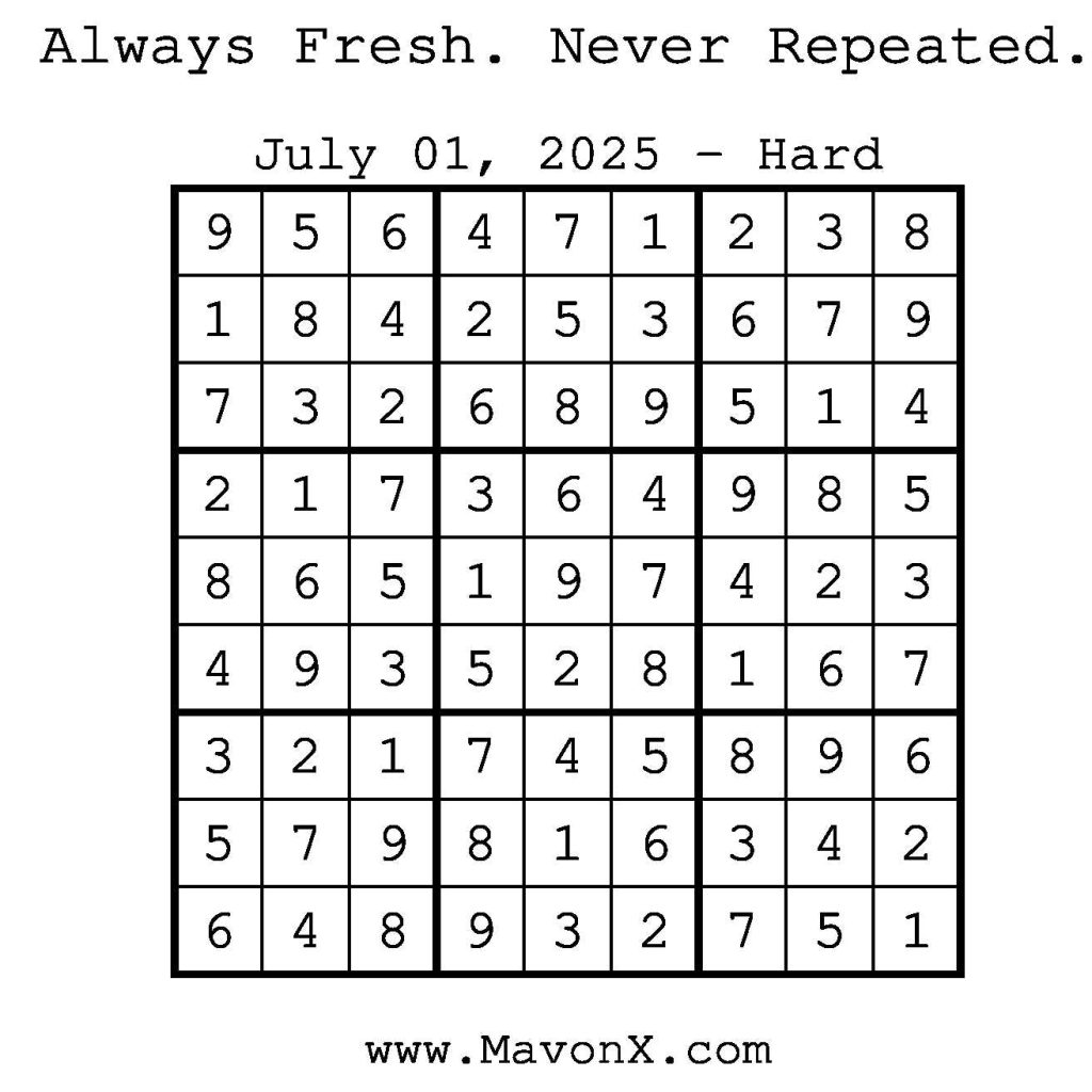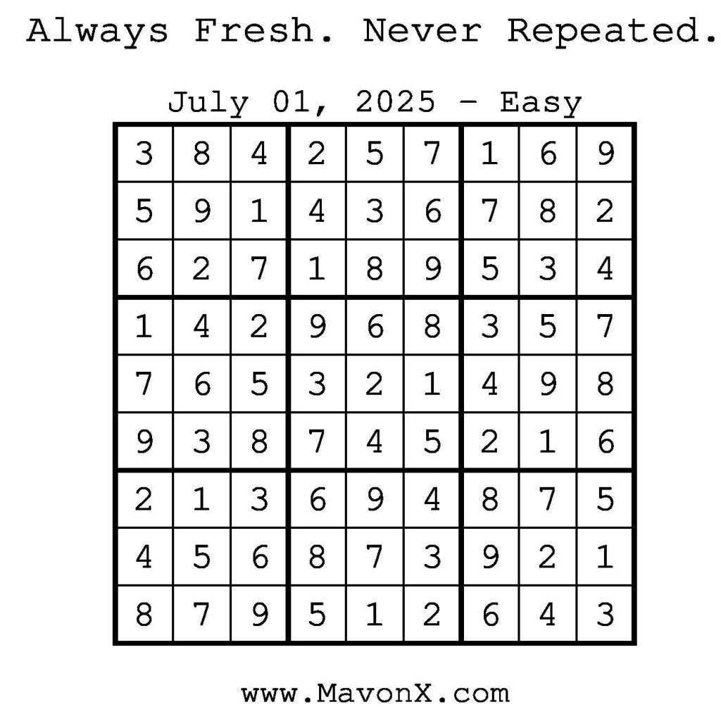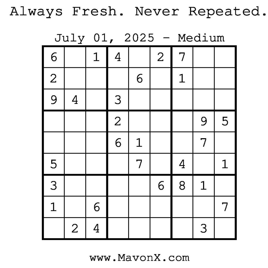 Puzzles of the Day – July 1, 2025 Post author:admin Post published:July 1, 2025 Post category:Free Stuff / Puzzle of the Day / Puzzle of the Day Solutions / Solutions Post comments:0 Comments Check out our books on Amazon! Check out our books on Barnes and Noble! Check out our books on Etsy! Easy Sudoku Coach Link Medium Sudoku Coach Link Hard Sudoku Coach Link Show Solution You Might Also Like Puzzles of the Day – November 30, 2025 November 29, 2025 Puzzles of the Day – March 9, 2026 March 9, 2026 Puzzles of the Day – March 13, 2026 March 13, 2026 Leave a Reply Cancel replyCommentEnter your name or username to comment Enter your email address to comment Enter your website URL (optional) Save my name, email, and website in this browser for the next time I comment.