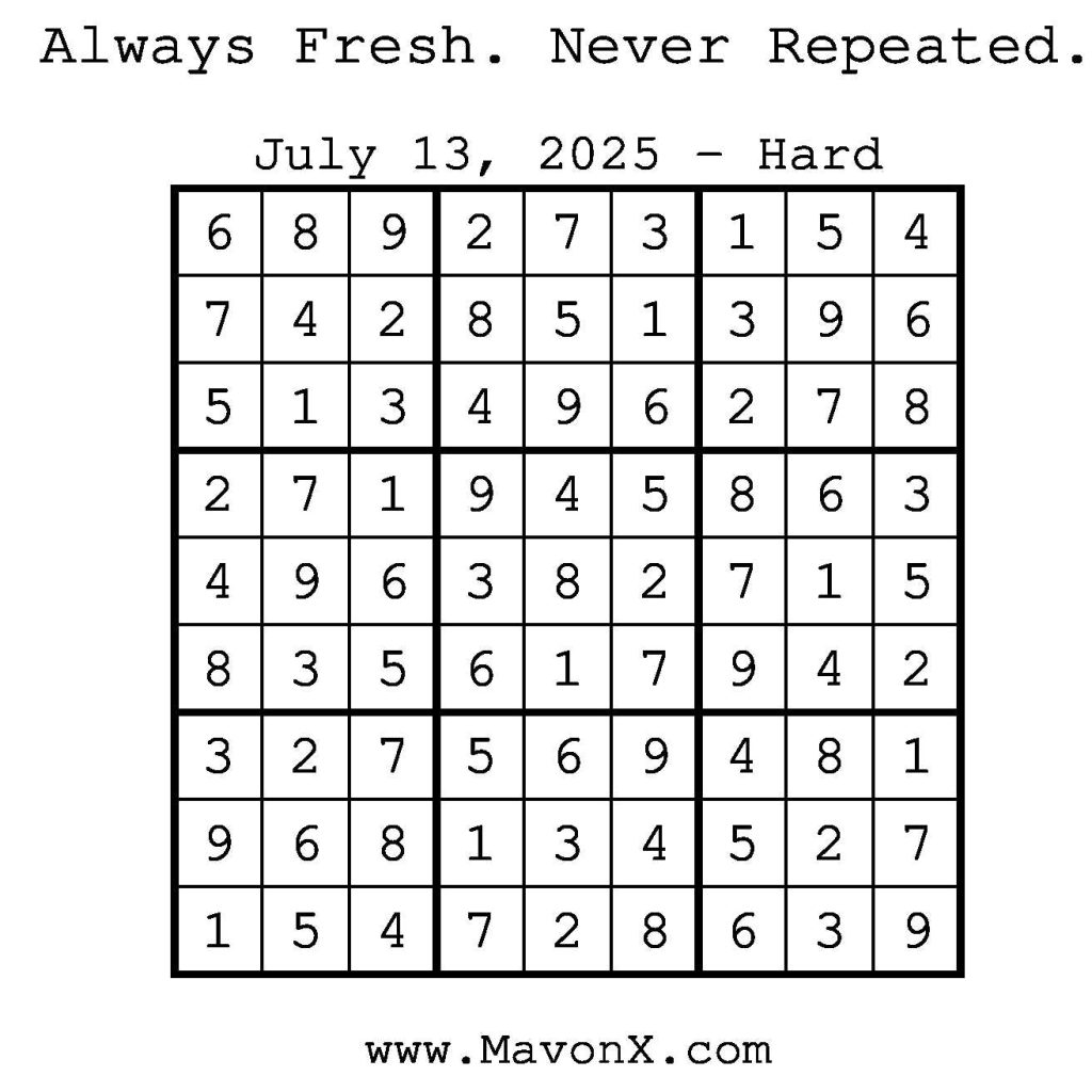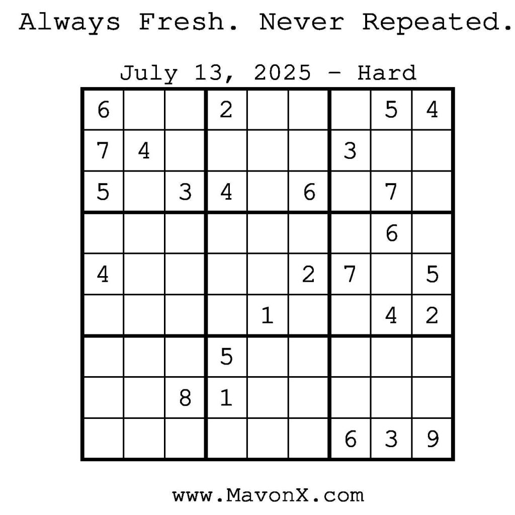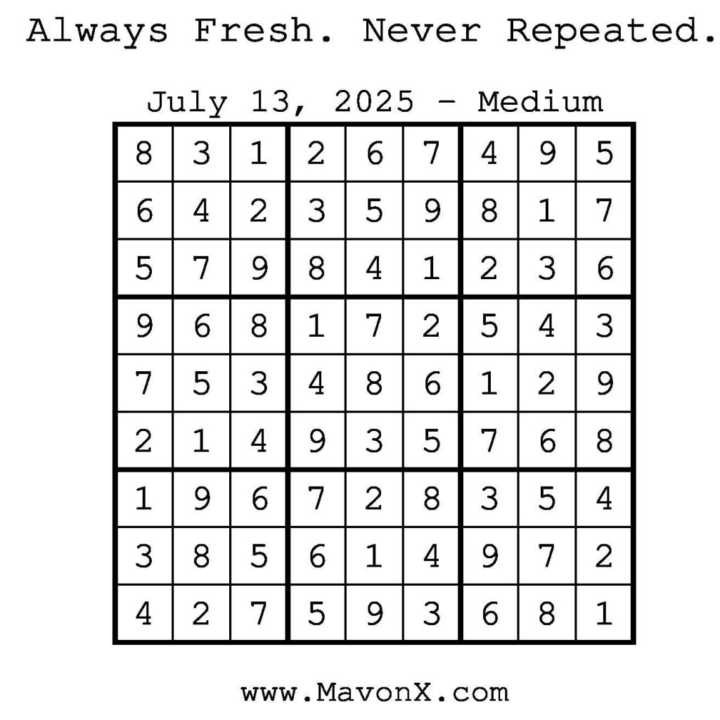 Puzzles of the Day – July 13, 2025 Post author:admin Post published:July 12, 2025 Post category:Free Stuff / Puzzle of the Day / Puzzle of the Day Solutions / Solutions Post comments:0 Comments Check out our books on Amazon! Check out our books on Barnes and Noble! Check out our books on Etsy! Easy Sudoku Coach Link Medium Sudoku Coach Link Hard Sudoku Coach Link Show Solution You Might Also Like Puzzles of the Day – December 16, 2024 December 15, 2024 Puzzles of the Day – October 28, 2024 October 28, 2024 Puzzles of the Day – July 4, 2025 July 3, 2025 Leave a Reply Cancel replyCommentEnter your name or username to comment Enter your email address to comment Enter your website URL (optional) Save my name, email, and website in this browser for the next time I comment.