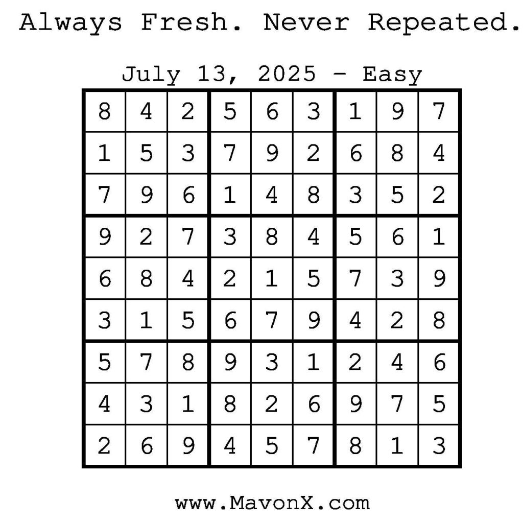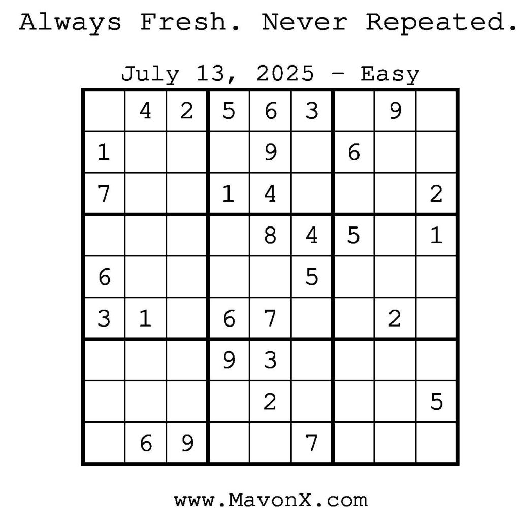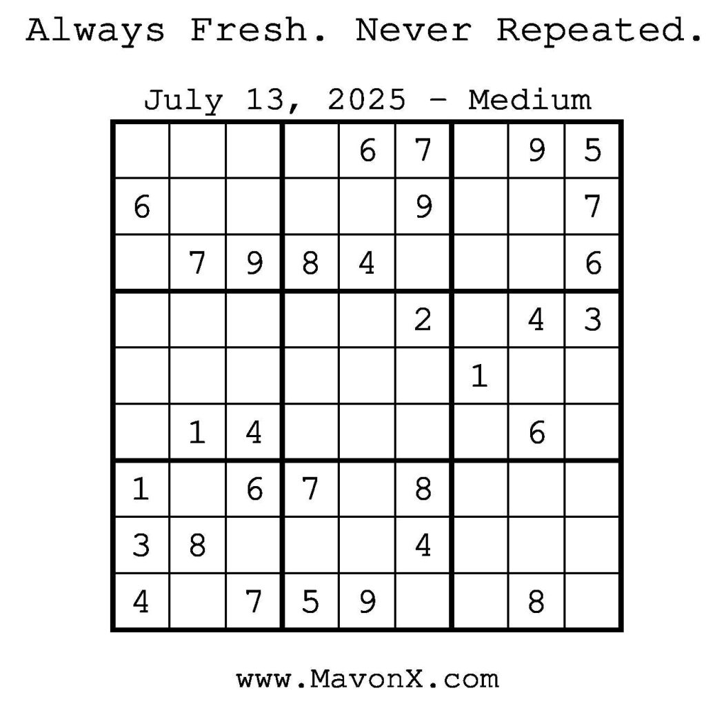 Puzzles of the Day – July 13, 2025 Post author:admin Post published:July 12, 2025 Post category:Free Stuff / Puzzle of the Day / Puzzle of the Day Solutions / Solutions Post comments:0 Comments Check out our books on Amazon! Check out our books on Barnes and Noble! Check out our books on Etsy! Easy Sudoku Coach Link Medium Sudoku Coach Link Hard Sudoku Coach Link Show Solution You Might Also Like Puzzles of the Day – December 16, 2024 December 15, 2024 Puzzles of the Day – October 28, 2024 October 28, 2024 Puzzles of the Day – July 4, 2025 July 3, 2025 Leave a Reply Cancel replyCommentEnter your name or username to comment Enter your email address to comment Enter your website URL (optional) Save my name, email, and website in this browser for the next time I comment.