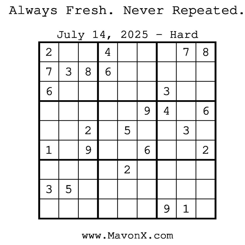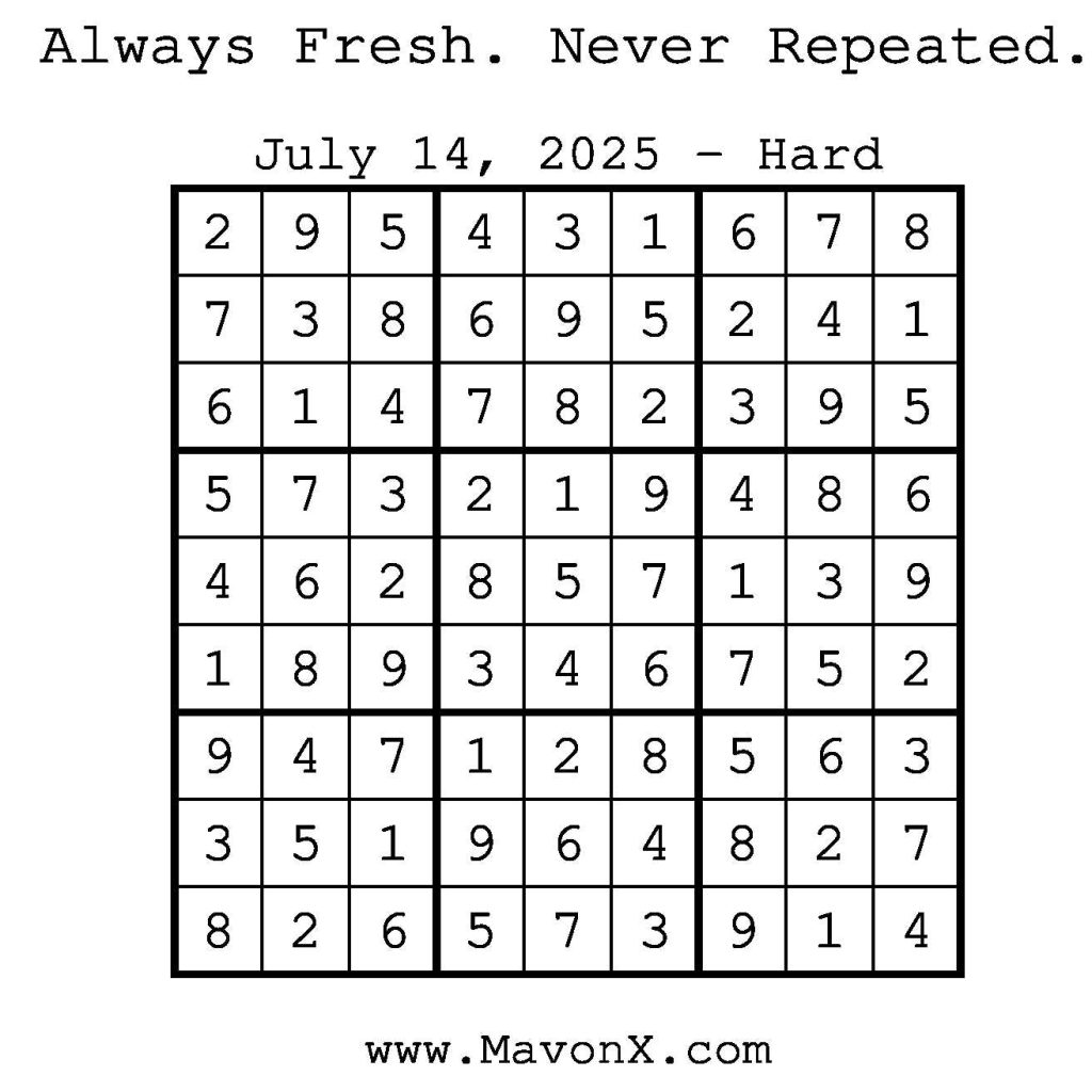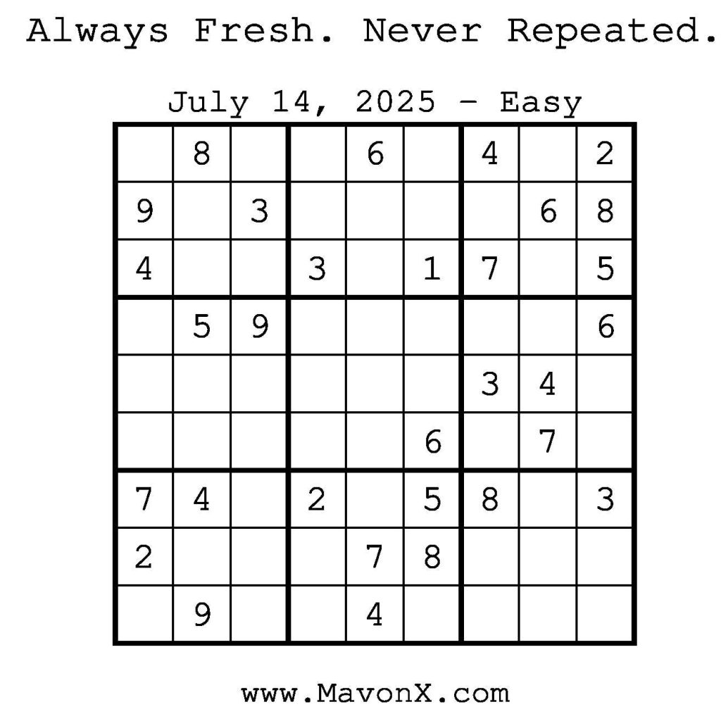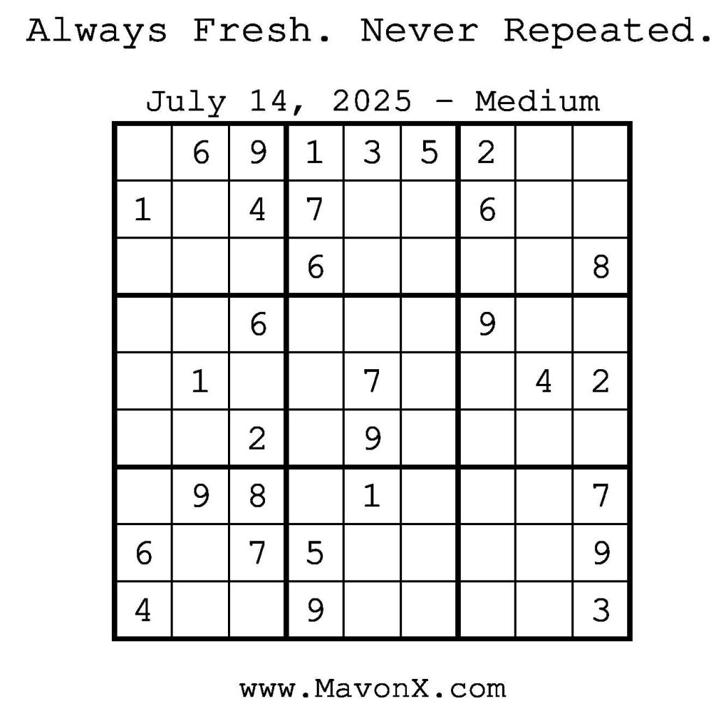 Puzzles of the Day – July 14, 2025 Post author:admin Post published:July 14, 2025 Post category:Free Stuff / Puzzle of the Day / Puzzle of the Day Solutions / Solutions Post comments:0 Comments Check out our books on Amazon! Check out our books on Barnes and Noble! Check out our books on Etsy! Easy Sudoku Coach Link Medium Sudoku Coach Link Hard Sudoku Coach Link Show Solution You Might Also Like Puzzles of the Day – April 12, 2026 April 12, 2026 Puzzles of the Day – April 10, 2025 April 10, 2025 Puzzles of the Day – June 21, 2025 June 22, 2025 Leave a Reply Cancel replyCommentEnter your name or username to comment Enter your email address to comment Enter your website URL (optional) Save my name, email, and website in this browser for the next time I comment.