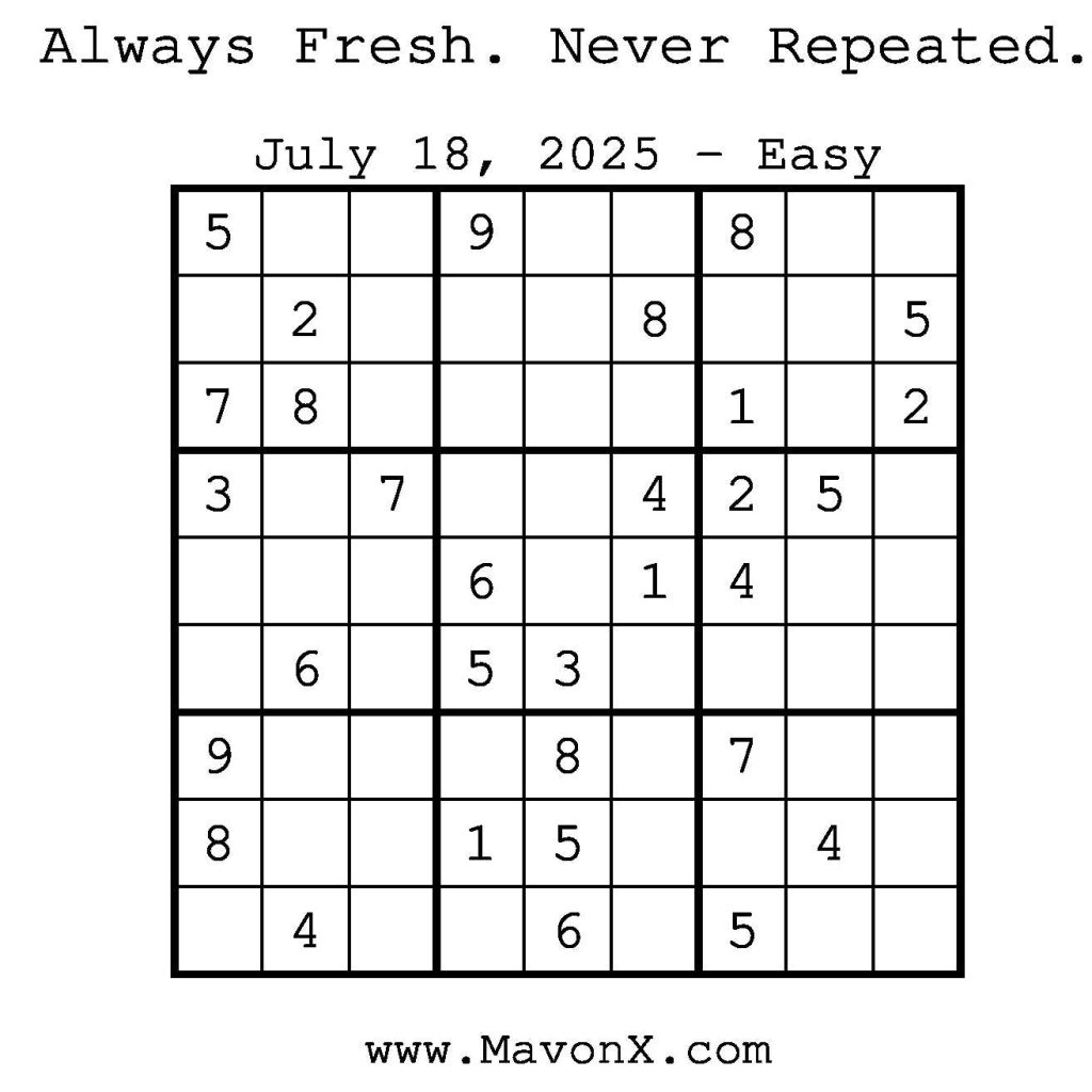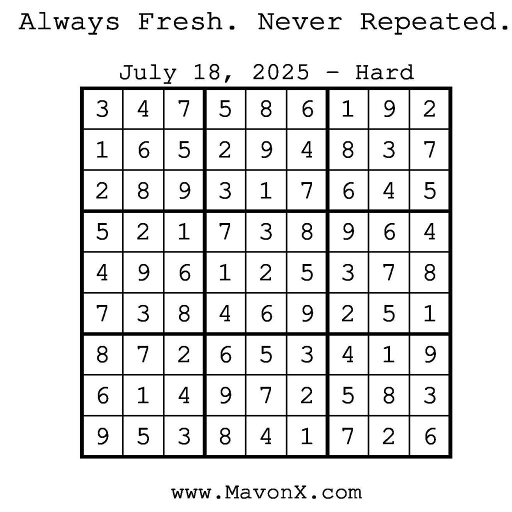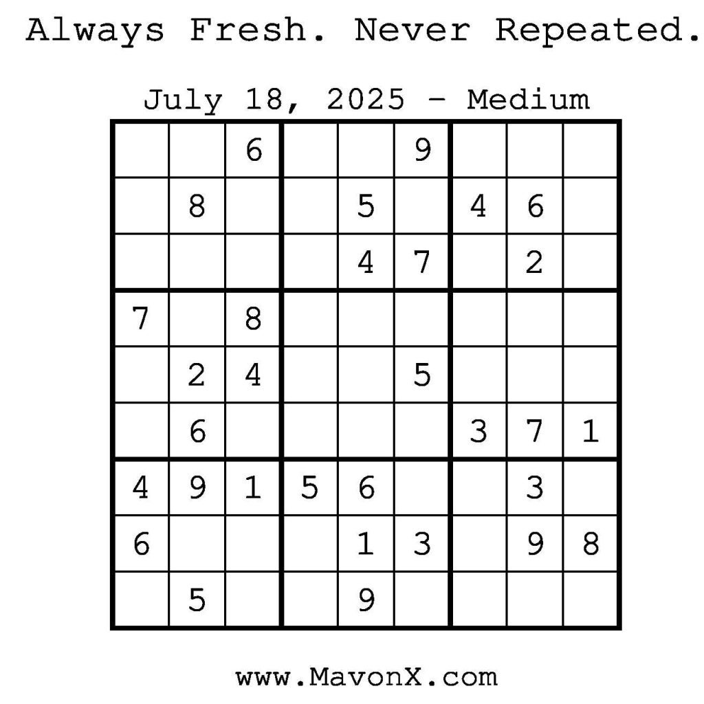 Puzzles of the Day – July 18, 2025 Post author:admin Post published:July 18, 2025 Post category:Free Stuff / Puzzle of the Day / Puzzle of the Day Solutions / Solutions Post comments:0 Comments Check out our books on Amazon! Check out our books on Barnes and Noble! Check out our books on Etsy! Easy Sudoku Coach Link Medium Sudoku Coach Link Hard Sudoku Coach Link Show Solution You Might Also Like Puzzles of the Day – December 03, 2025 December 3, 2025 Puzzles of the Day – January 9, 2025 January 8, 2025 Puzzles of the Day – August 9, 2025 August 8, 2025 Leave a Reply Cancel replyCommentEnter your name or username to comment Enter your email address to comment Enter your website URL (optional) Save my name, email, and website in this browser for the next time I comment.