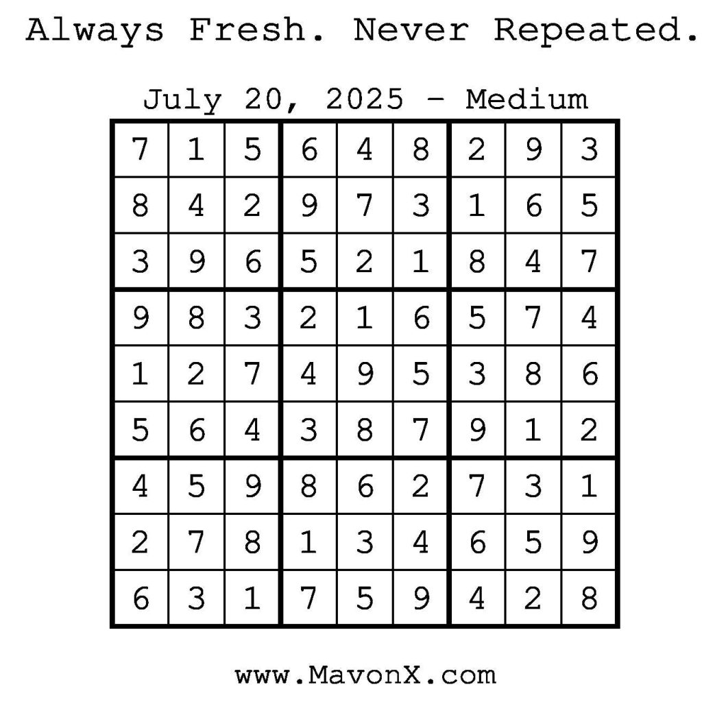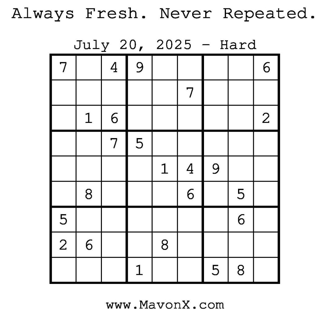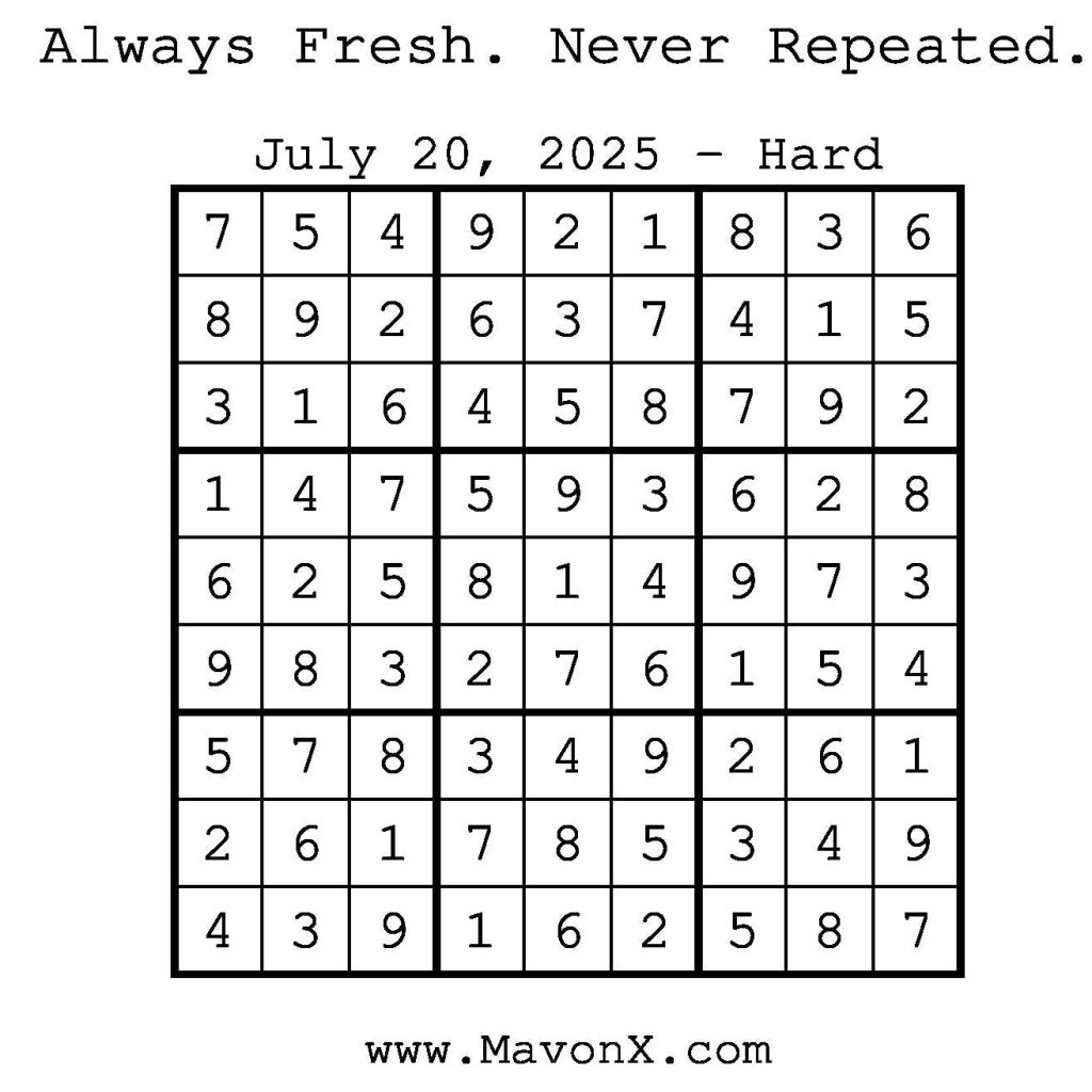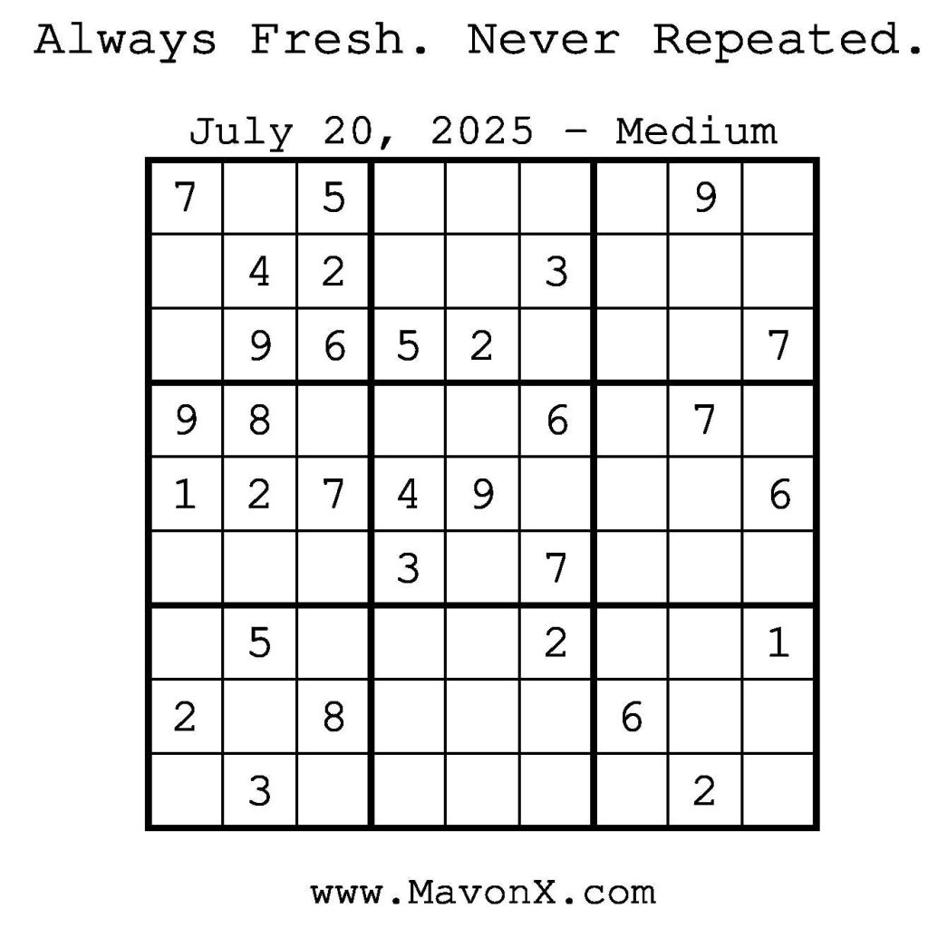 Puzzles of the Day – July 20, 2025 Post author:admin Post published:July 20, 2025 Post category:Free Stuff / Puzzle of the Day / Puzzle of the Day Solutions / Solutions Post comments:0 Comments Check out our books on Amazon! Check out our books on Barnes and Noble! Check out our books on Etsy! Easy Sudoku Coach Link Medium Sudoku Coach Link Hard Sudoku Coach Link Show Solution You Might Also Like Puzzles of the Day – October 2, 2025 October 2, 2025 Puzzles of the Day – June 9, 2025 June 9, 2025 Puzzles of the Day – January 7, 2025 January 7, 2025 Leave a Reply Cancel replyCommentEnter your name or username to comment Enter your email address to comment Enter your website URL (optional) Save my name, email, and website in this browser for the next time I comment.