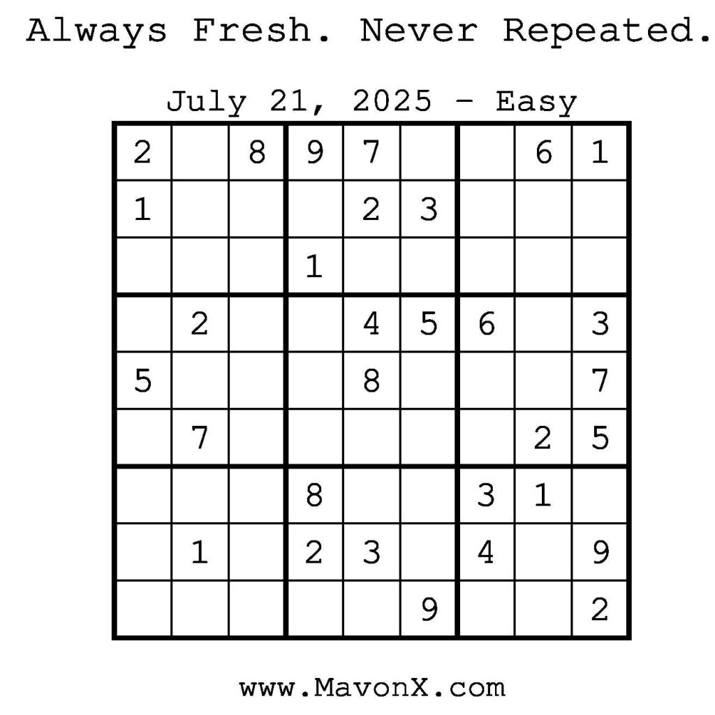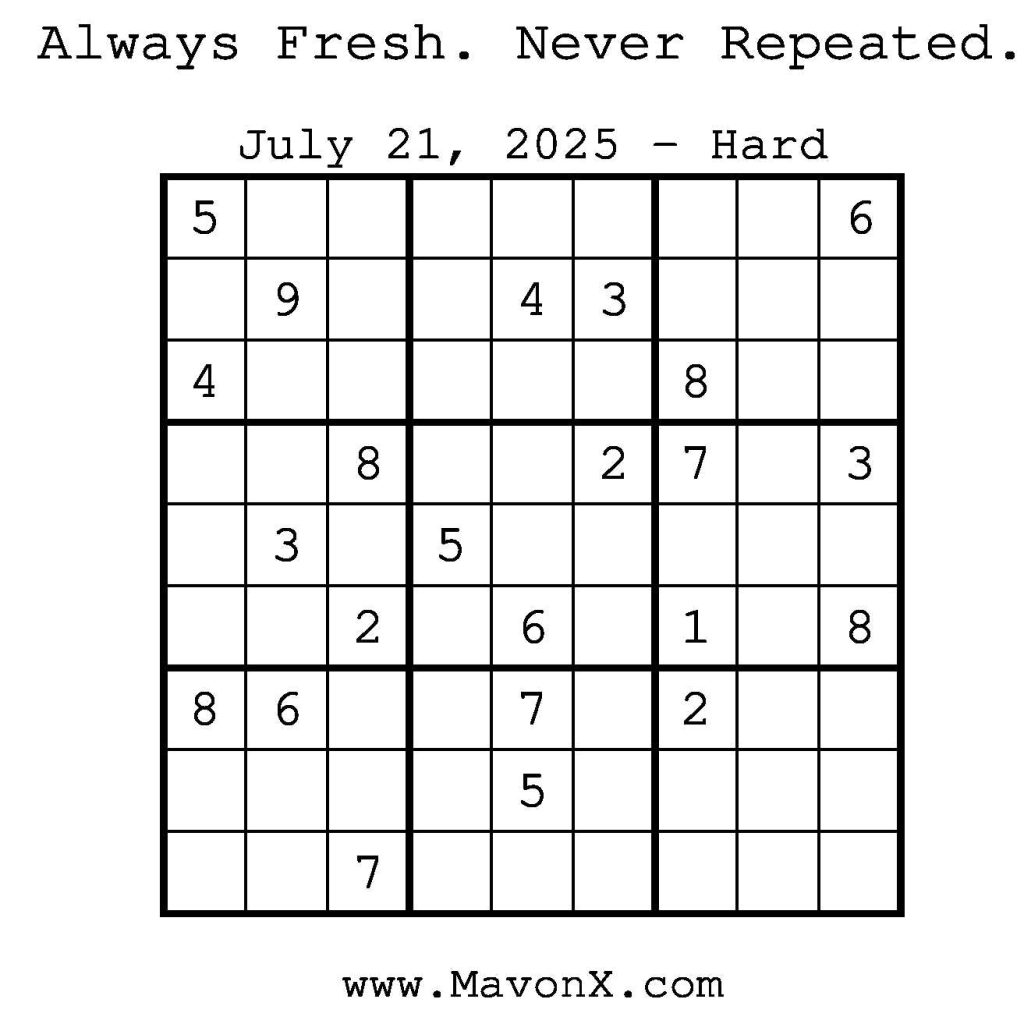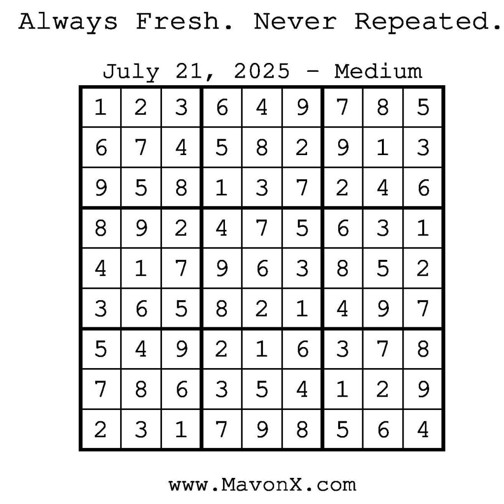 Puzzles of the Day – July 21, 2025 Post author:admin Post published:July 21, 2025 Post category:Free Stuff / Puzzle of the Day / Puzzle of the Day Solutions / Solutions Post comments:0 Comments Check out our books on Amazon! Check out our books on Barnes and Noble! Check out our books on Etsy! Easy Sudoku Coach Link Medium Sudoku Coach Link Hard Sudoku Coach Link Show Solution You Might Also Like Puzzles of the Day – February 28, 2025 February 28, 2025 Puzzles of the Day – October 16, 2025 October 15, 2025 Puzzles of the Day – April 17, 2025 April 16, 2025 Leave a Reply Cancel replyCommentEnter your name or username to comment Enter your email address to comment Enter your website URL (optional) Save my name, email, and website in this browser for the next time I comment.