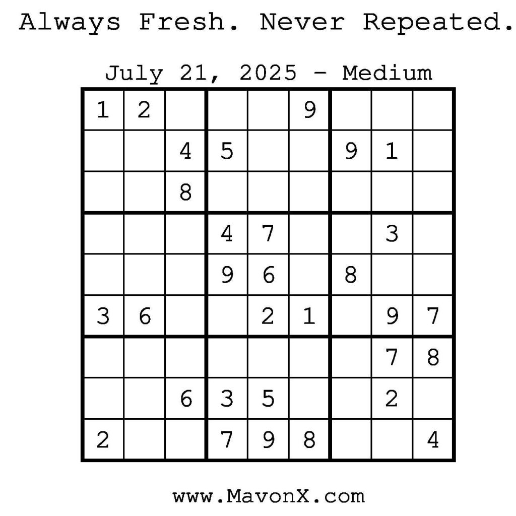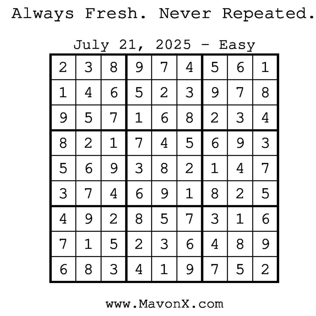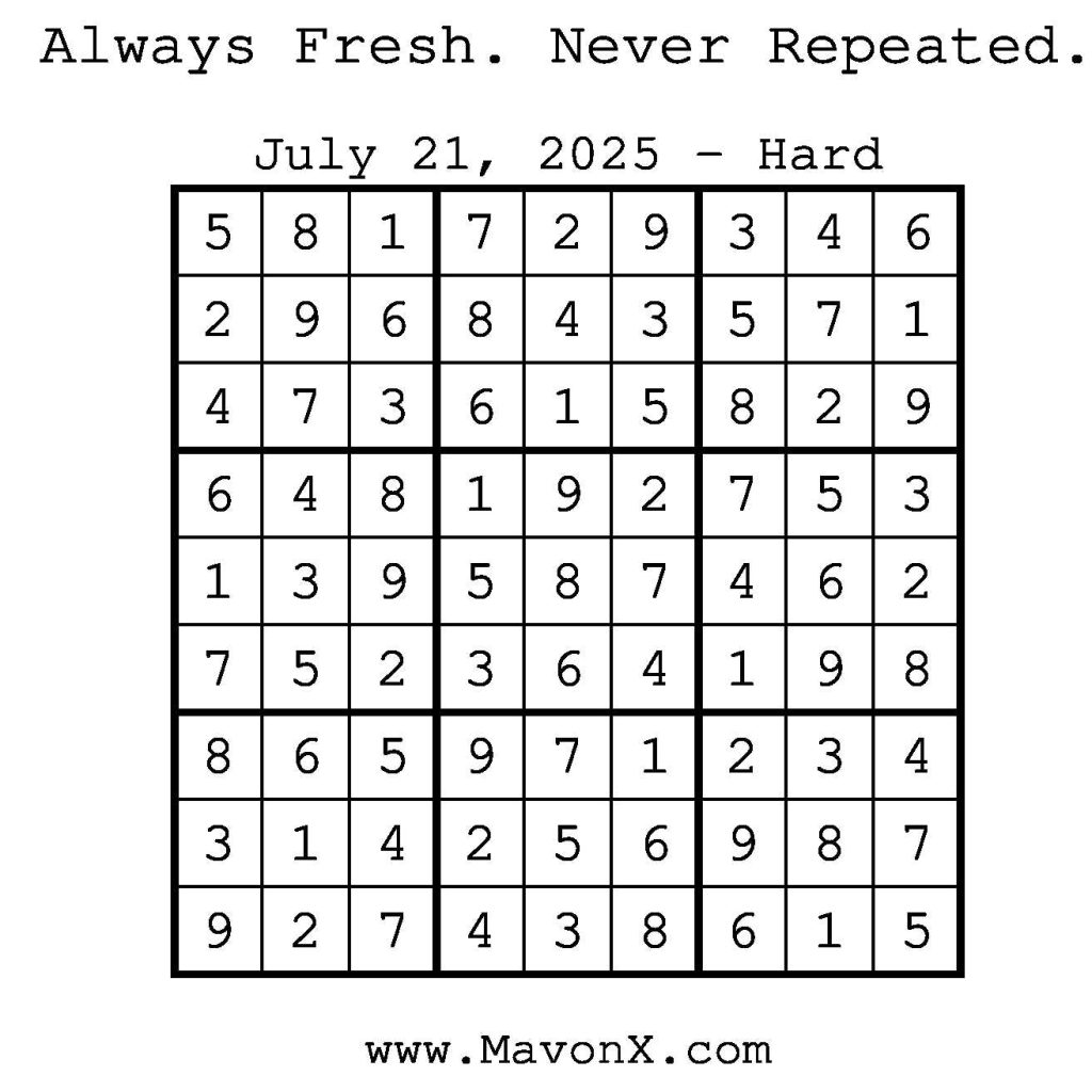 Puzzles of the Day – July 21, 2025 Post author:admin Post published:July 21, 2025 Post category:Free Stuff / Puzzle of the Day / Puzzle of the Day Solutions / Solutions Post comments:0 Comments Check out our books on Amazon! Check out our books on Barnes and Noble! Check out our books on Etsy! Easy Sudoku Coach Link Medium Sudoku Coach Link Hard Sudoku Coach Link Show Solution You Might Also Like Puzzles of the Day – February 28, 2025 February 28, 2025 Puzzles of the Day – October 16, 2025 October 15, 2025 Puzzles of the Day – April 17, 2025 April 16, 2025 Leave a Reply Cancel replyCommentEnter your name or username to comment Enter your email address to comment Enter your website URL (optional) Save my name, email, and website in this browser for the next time I comment.