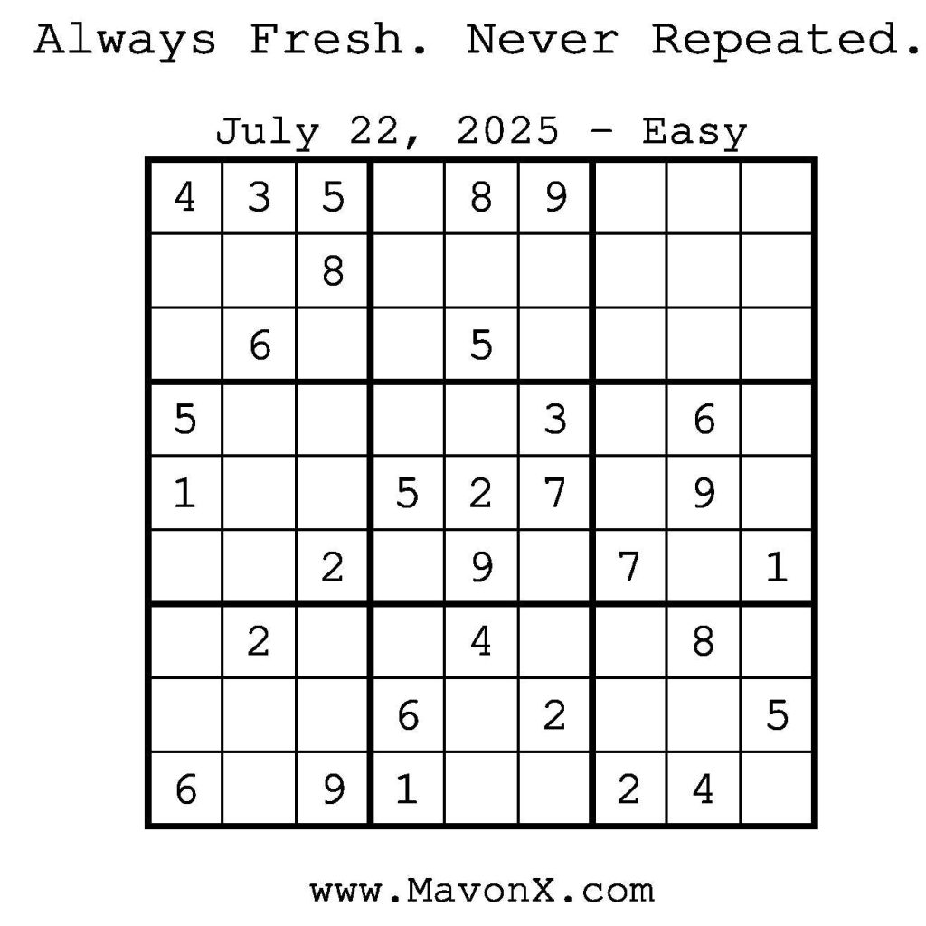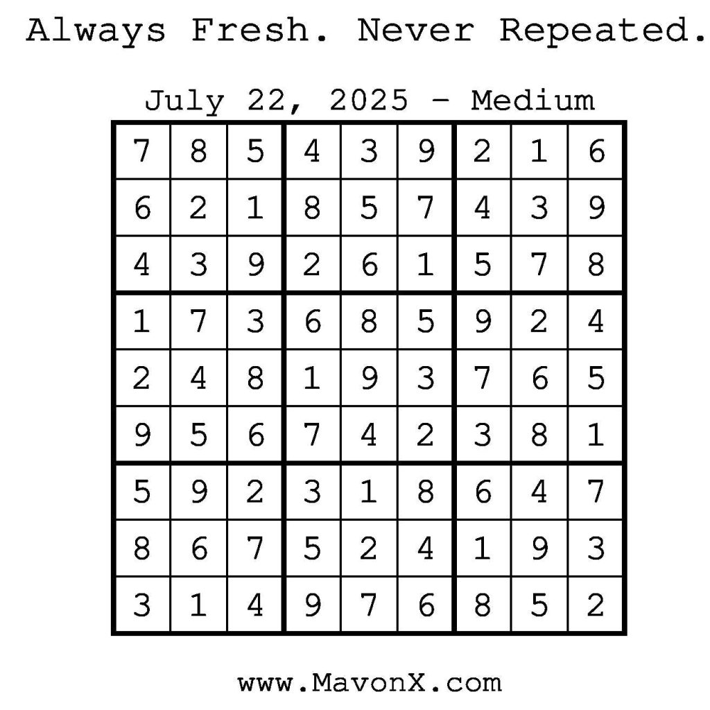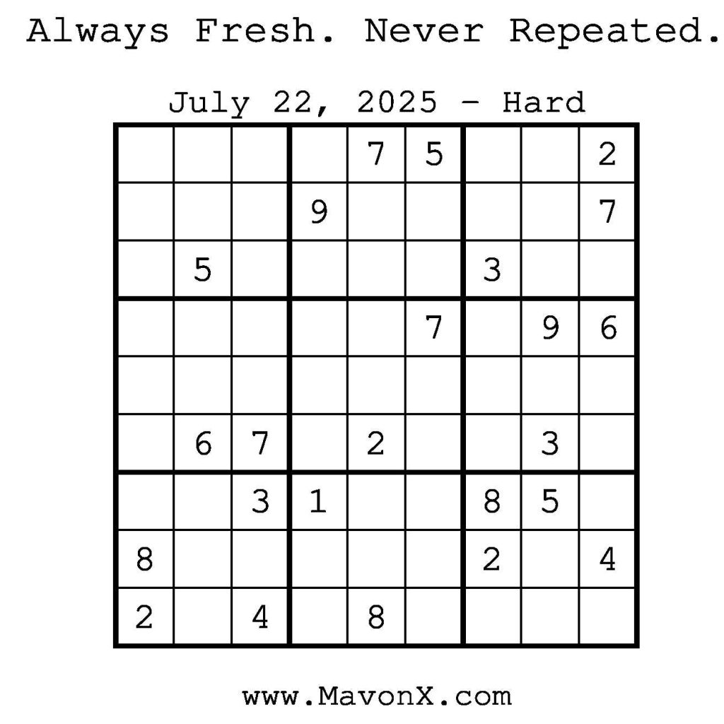 Puzzles of the Day – July 22, 2025 Post author:admin Post published:July 22, 2025 Post category:Free Stuff / Puzzle of the Day / Puzzle of the Day Solutions / Solutions Post comments:0 Comments Check out our books on Amazon! Check out our books on Barnes and Noble! Check out our books on Etsy! Easy Sudoku Coach Link Medium Sudoku Coach Link Hard Sudoku Coach Link Show Solution You Might Also Like Puzzles of the Day – October 20, 2024 October 19, 2024 Puzzles of the Day – July 3, 2025 July 3, 2025 Puzzles of the Day – March 17, 2025 March 17, 2025 Leave a Reply Cancel replyCommentEnter your name or username to comment Enter your email address to comment Enter your website URL (optional) Save my name, email, and website in this browser for the next time I comment.