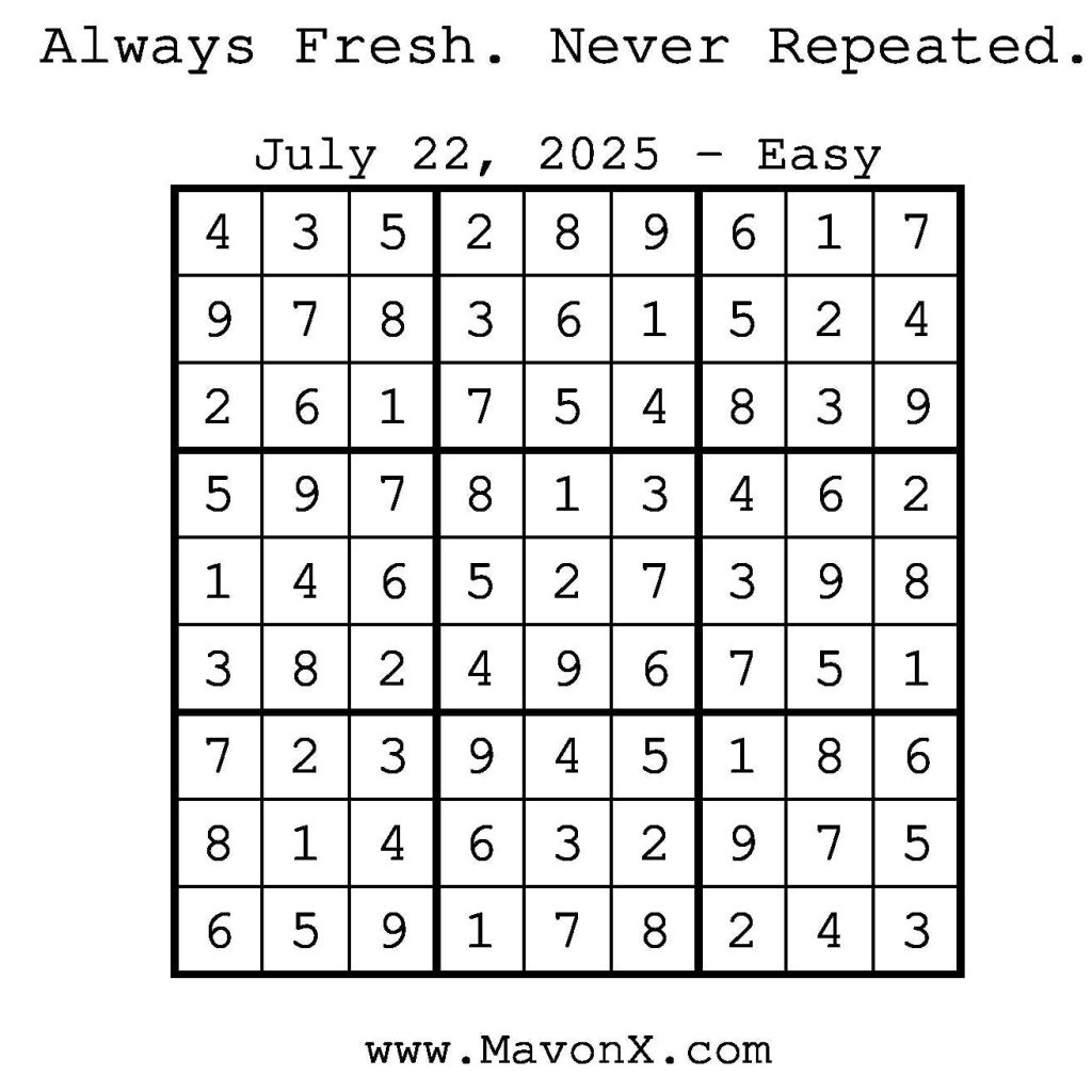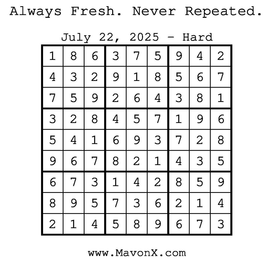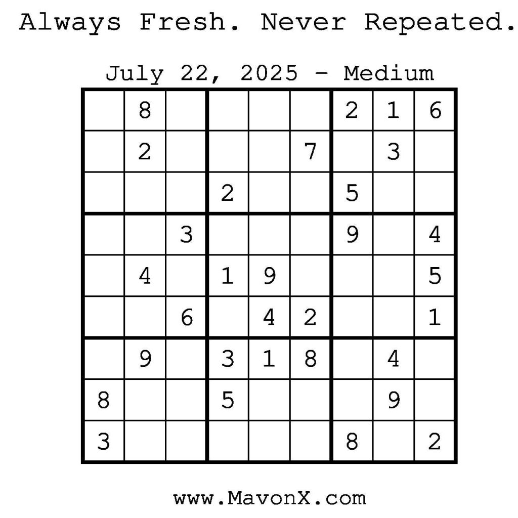 Puzzles of the Day – July 22, 2025 Post author:admin Post published:July 22, 2025 Post category:Free Stuff / Puzzle of the Day / Puzzle of the Day Solutions / Solutions Post comments:0 Comments Check out our books on Amazon! Check out our books on Barnes and Noble! Check out our books on Etsy! Easy Sudoku Coach Link Medium Sudoku Coach Link Hard Sudoku Coach Link Show Solution You Might Also Like Puzzles of the Day – October 20, 2024 October 19, 2024 Puzzles of the Day – July 3, 2025 July 3, 2025 Puzzles of the Day – March 17, 2025 March 17, 2025 Leave a Reply Cancel replyCommentEnter your name or username to comment Enter your email address to comment Enter your website URL (optional) Save my name, email, and website in this browser for the next time I comment.