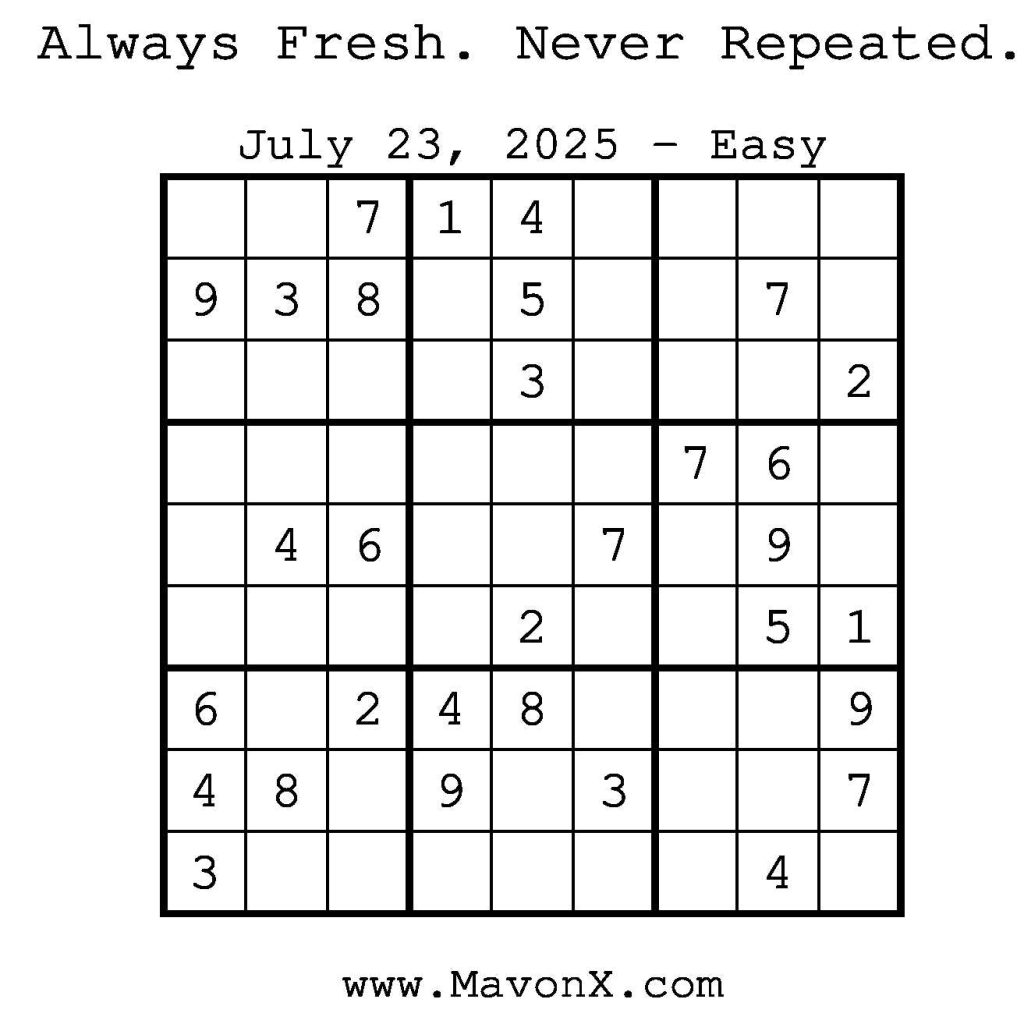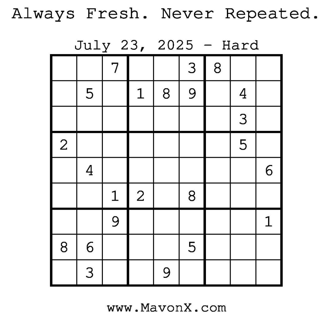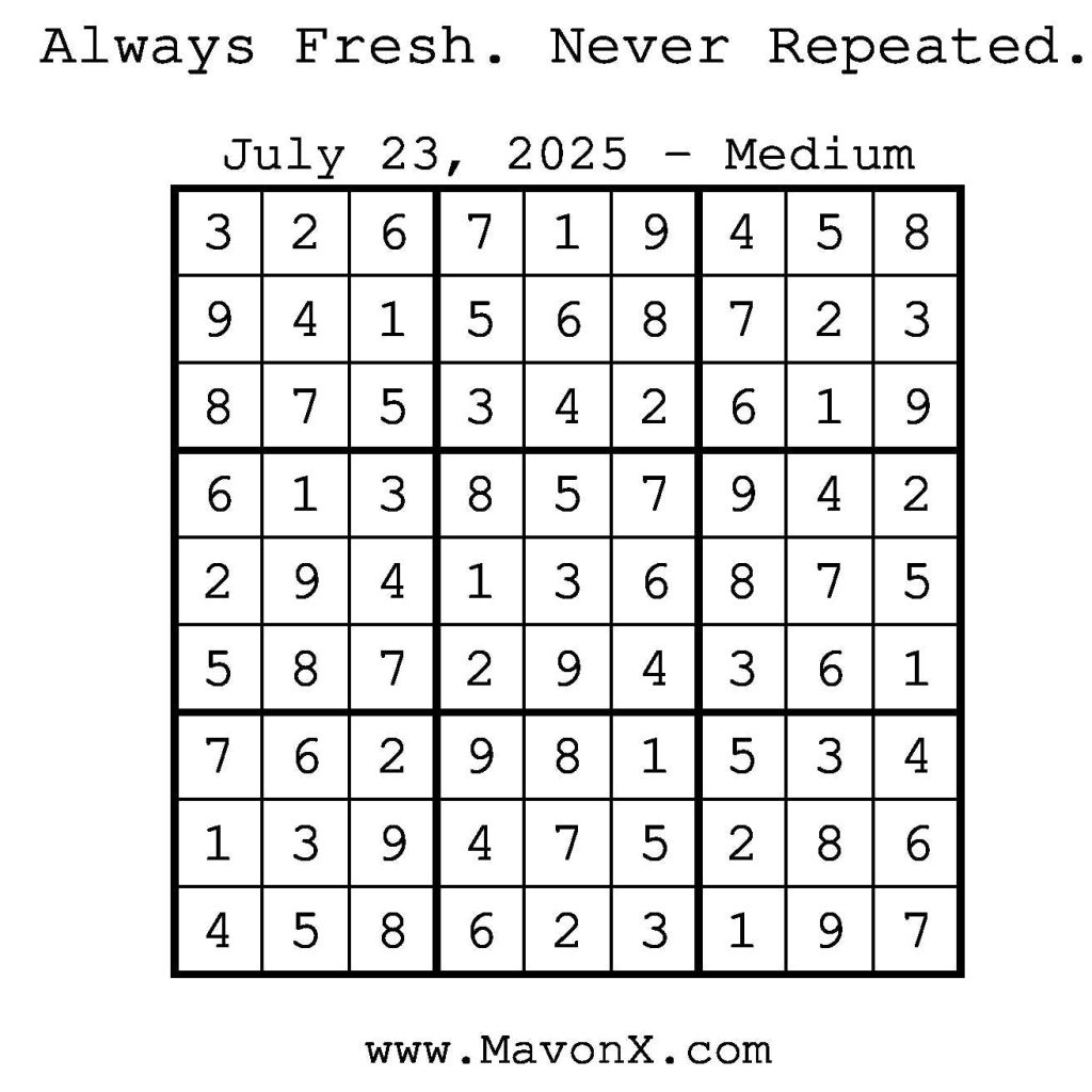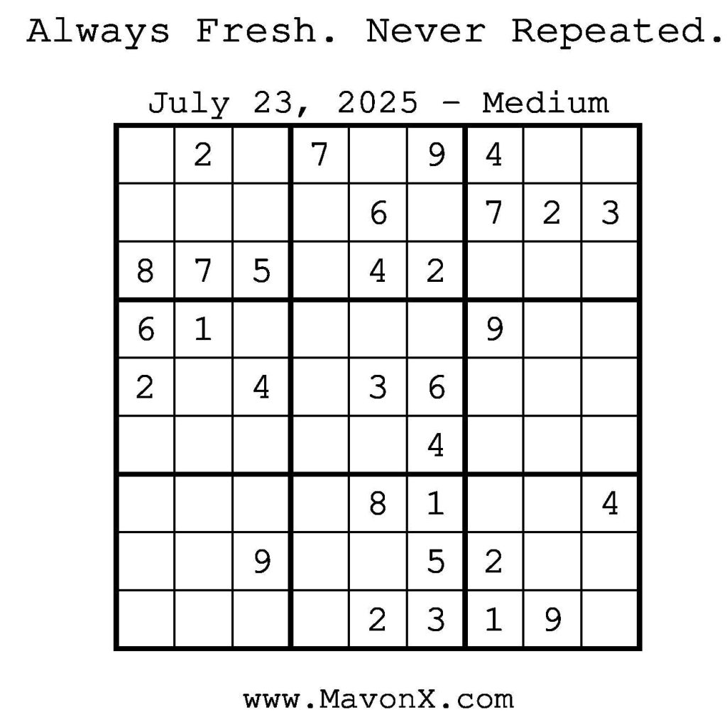 Puzzles of the Day – July 23, 2025 Post author:admin Post published:July 23, 2025 Post category:Free Stuff / Puzzle of the Day / Puzzle of the Day Solutions / Solutions Post comments:0 Comments Check out our books on Amazon! Check out our books on Barnes and Noble! Check out our books on Etsy! Easy Sudoku Coach Link Medium Sudoku Coach Link Hard Sudoku Coach Link Show Solution You Might Also Like Puzzles of the Day – December 01, 2025 November 30, 2025 Puzzles of the Day – November 4, 2024 November 4, 2024 Puzzles of the Day – January 22, 2026 January 21, 2026 Leave a Reply Cancel replyCommentEnter your name or username to comment Enter your email address to comment Enter your website URL (optional) Save my name, email, and website in this browser for the next time I comment.