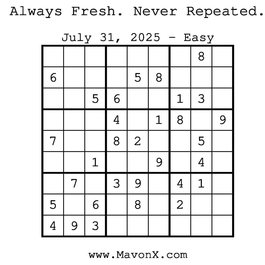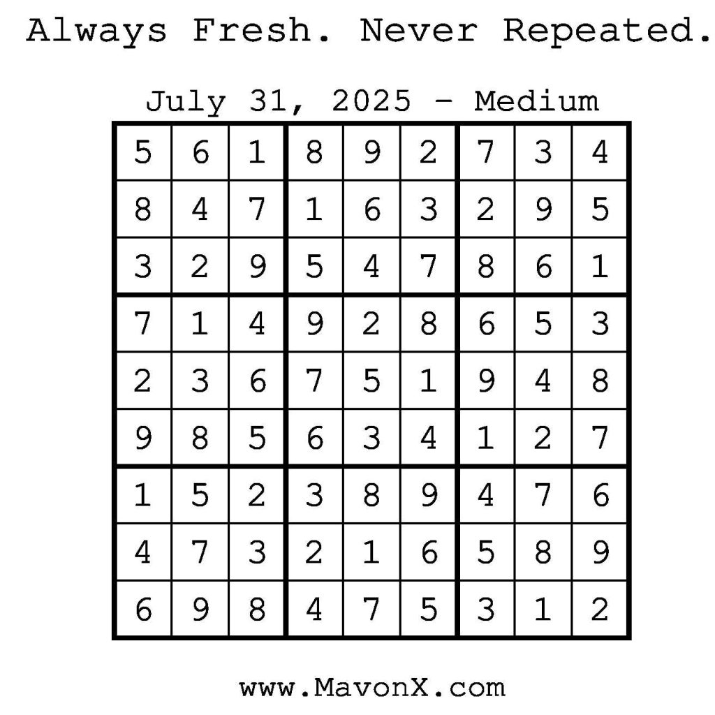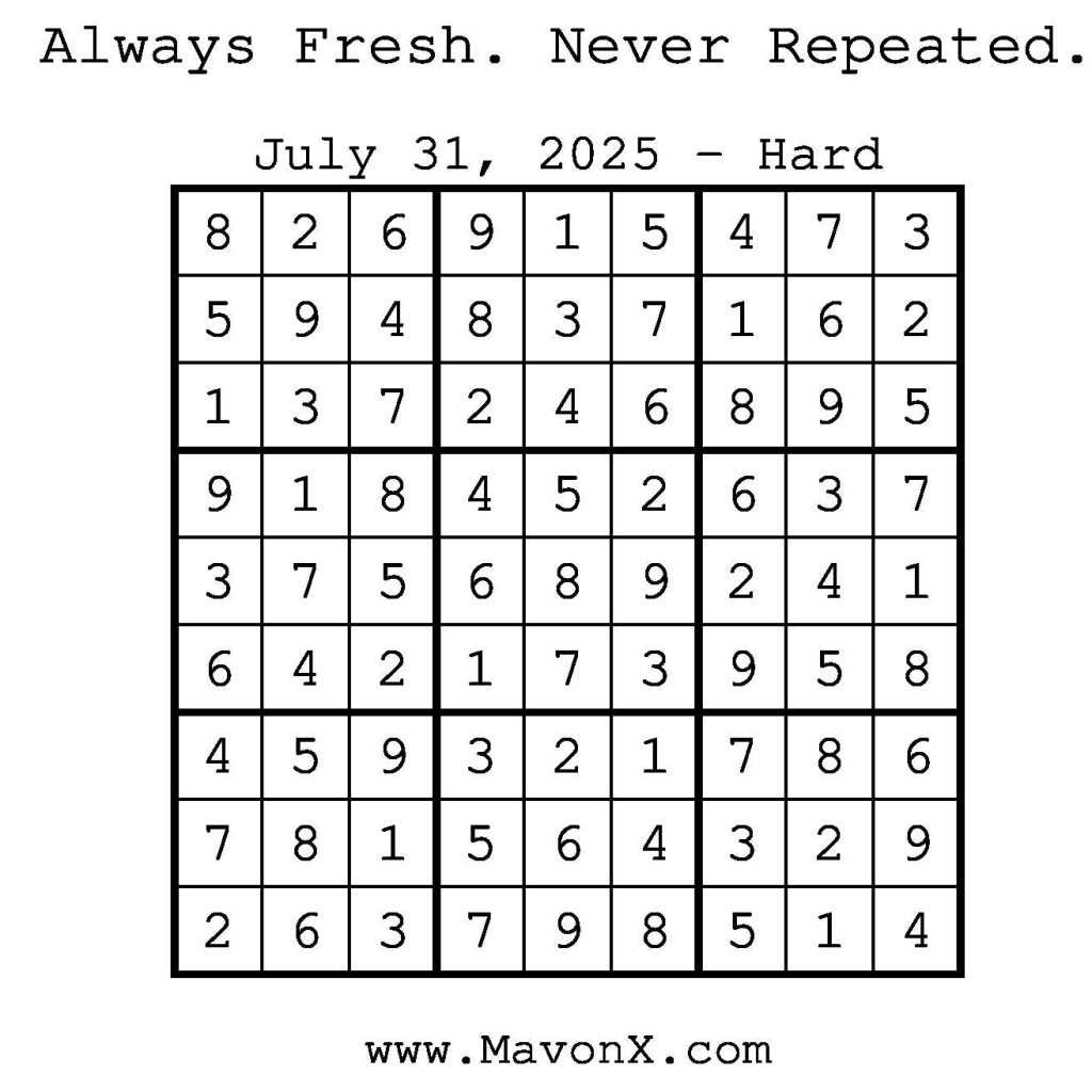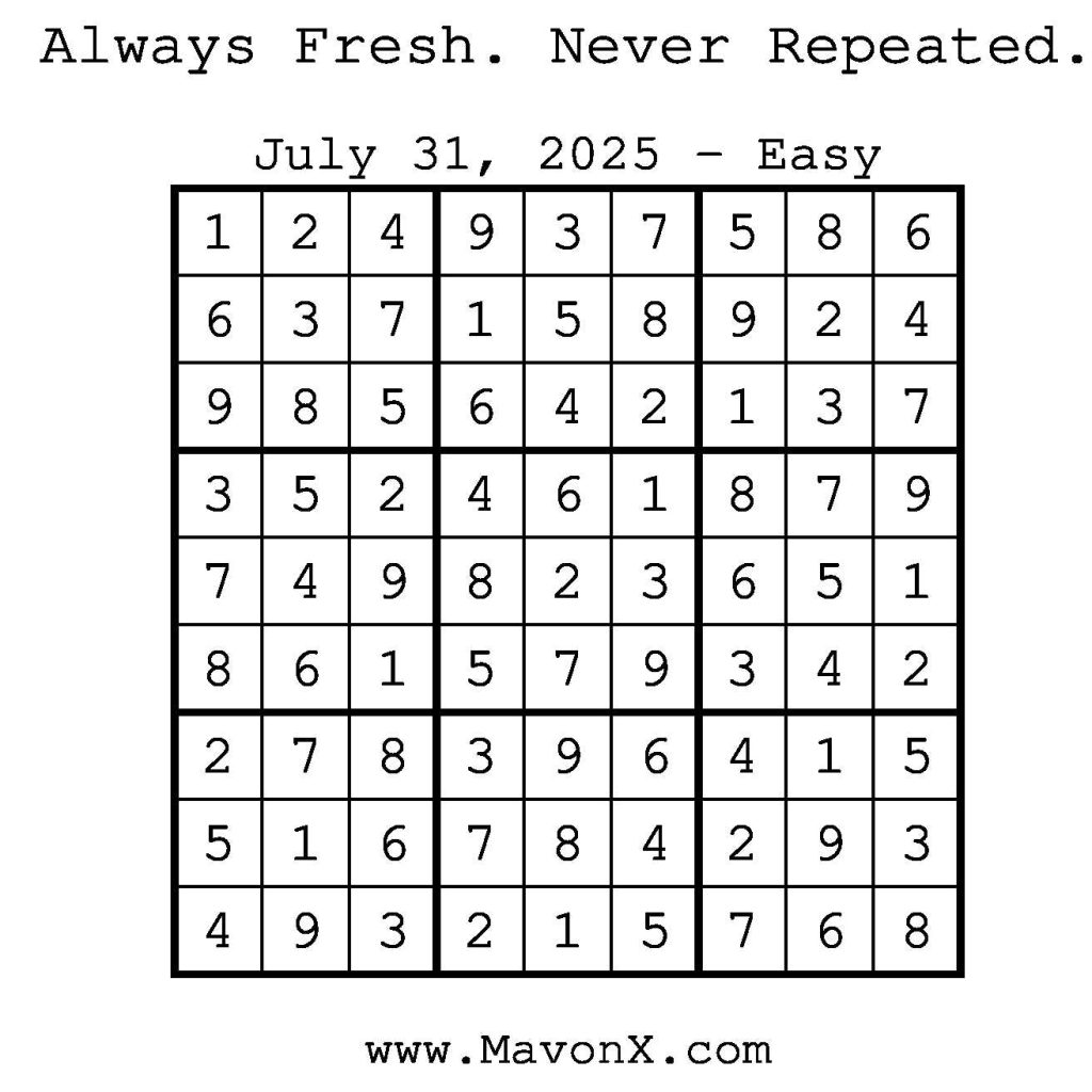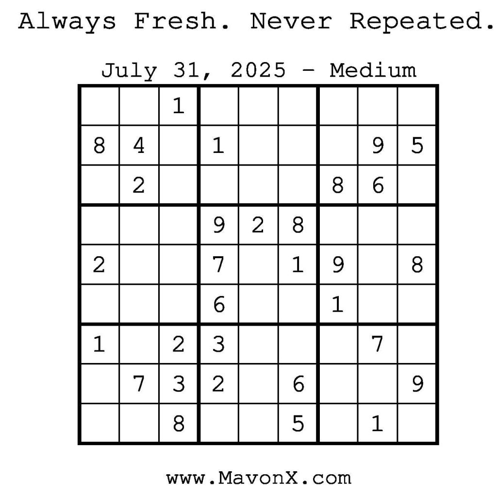 Puzzles of the Day – July 31, 2025 Post author:admin Post published:July 31, 2025 Post category:Free Stuff / Puzzle of the Day / Puzzle of the Day Solutions / Solutions Post comments:0 Comments Check out our books on Amazon! Check out our books on Barnes and Noble! Check out our books on Etsy! Easy Sudoku Coach Link Medium Sudoku Coach Link Hard Sudoku Coach Link Show Solution You Might Also Like Puzzles of the Day – September 25, 2024 September 25, 2024 Puzzles of the Day – March 19, 2025 March 19, 2025 Puzzles of the Day – August 18, 2024 August 17, 2024 Leave a Reply Cancel replyCommentEnter your name or username to comment Enter your email address to comment Enter your website URL (optional) Save my name, email, and website in this browser for the next time I comment.