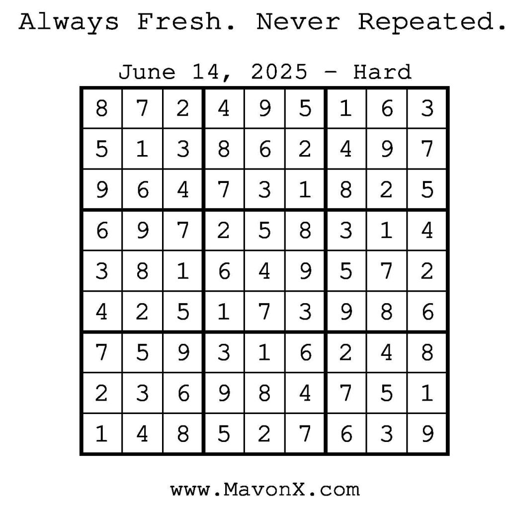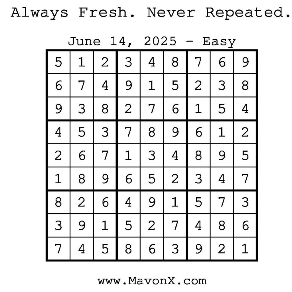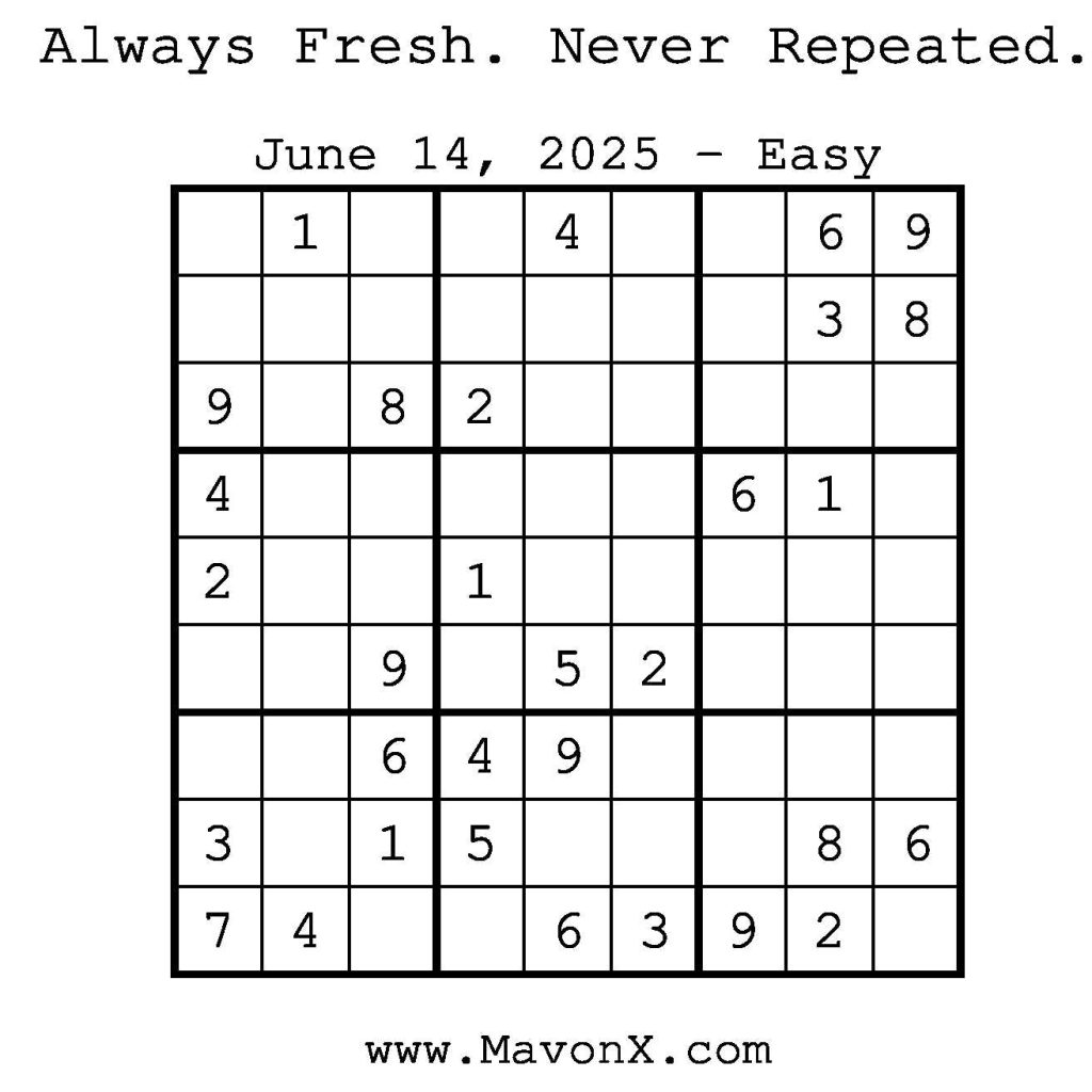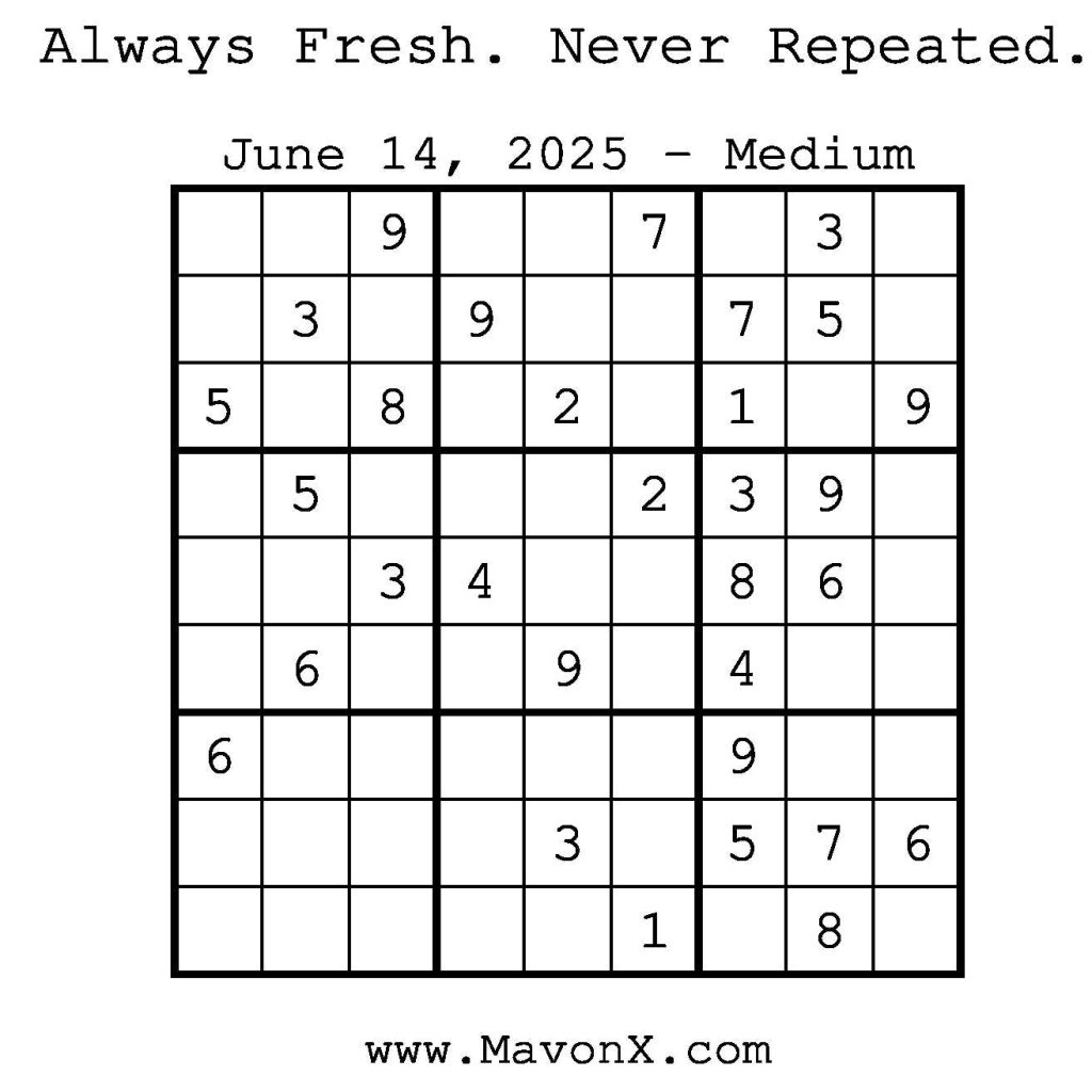 Puzzles of the Day – June 14, 2025 Post author:admin Post published:June 16, 2025 Post category:Free Stuff / Puzzle of the Day / Puzzle of the Day Solutions / Solutions Post comments:0 Comments Check out our books on Amazon! Check out our books on Barnes and Noble! Check out our books on Etsy! Easy Sudoku Coach Link Medium Sudoku Coach Link Hard Sudoku Coach Link Show Solution You Might Also Like Puzzles of the Day – May 5, 2025 May 4, 2025 Puzzles of the Day – January 19, 2026 January 17, 2026 Puzzle of the Day – August 7, 2024 August 7, 2024 Leave a Reply Cancel replyCommentEnter your name or username to comment Enter your email address to comment Enter your website URL (optional) Save my name, email, and website in this browser for the next time I comment.