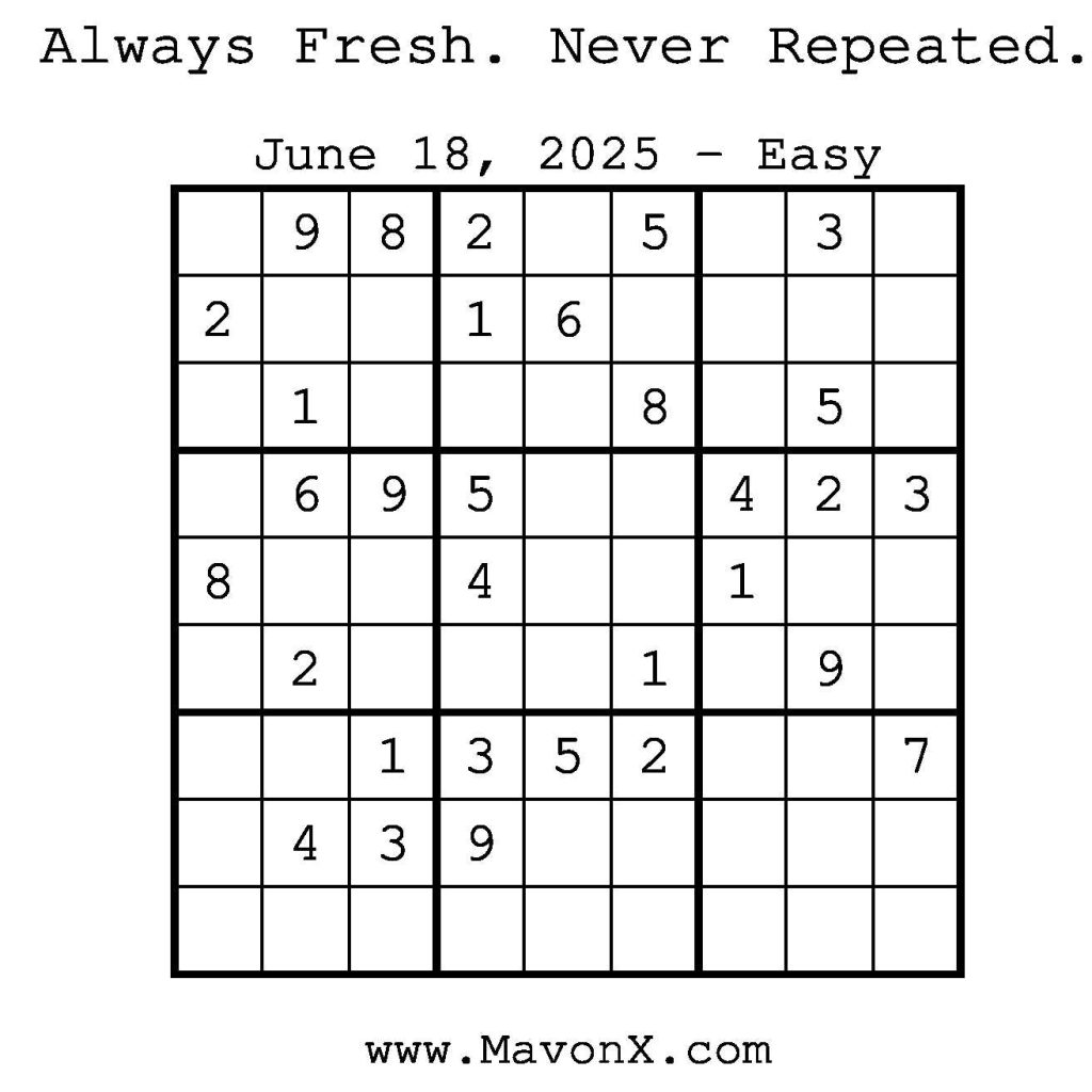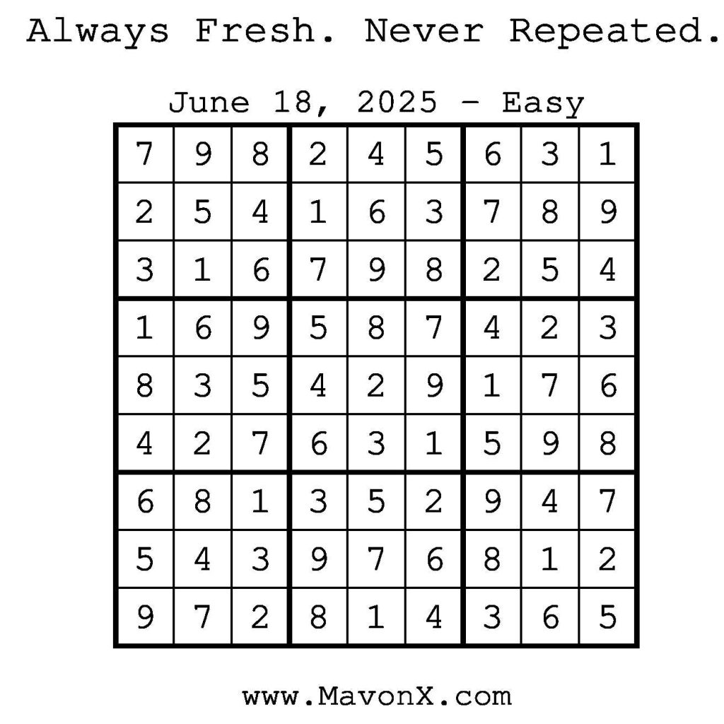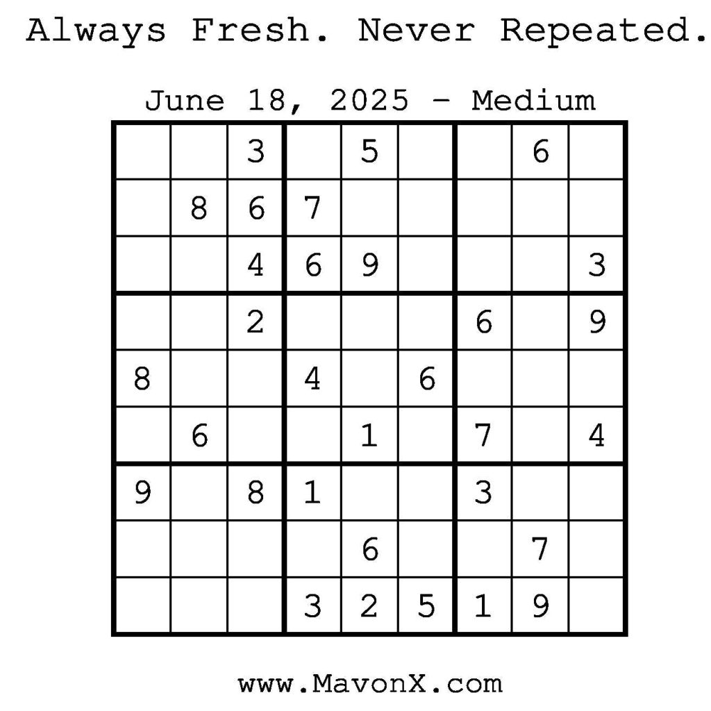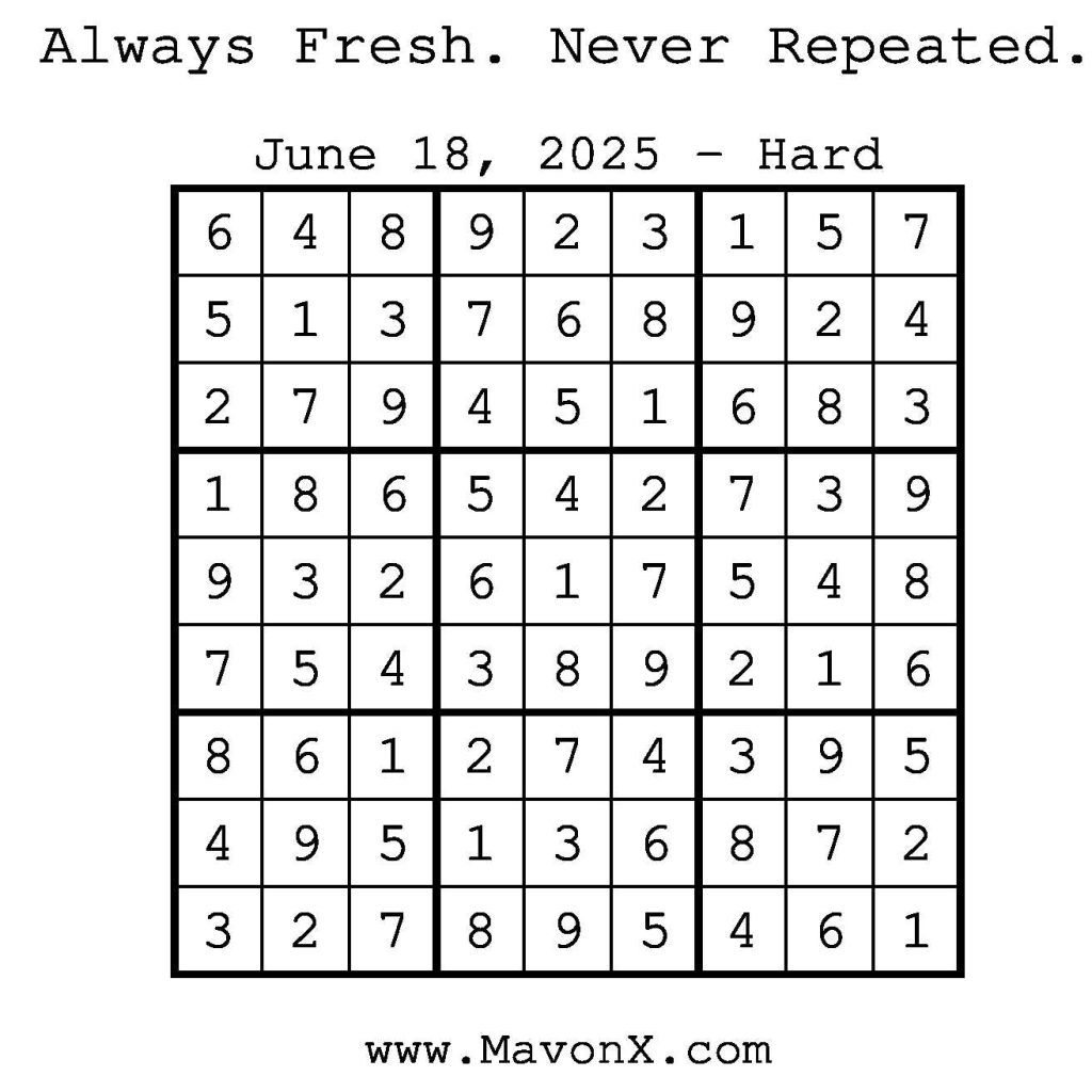 Puzzles of the Day – June 18, 2025 Post author:admin Post published:June 17, 2025 Post category:Free Stuff / Puzzle of the Day / Puzzle of the Day Solutions / Solutions Post comments:0 Comments Check out our books on Amazon! Check out our books on Barnes and Noble! Check out our books on Etsy! Easy Sudoku Coach Link Medium Sudoku Coach Link Hard Sudoku Coach Link Show Solution You Might Also Like Puzzles of the Day – August 27, 2025 August 26, 2025 Puzzles of the Day – January 24, 2025 January 24, 2025 Puzzles of the Day – January 7, 2025 January 7, 2025 Leave a Reply Cancel replyCommentEnter your name or username to comment Enter your email address to comment Enter your website URL (optional) Save my name, email, and website in this browser for the next time I comment.
