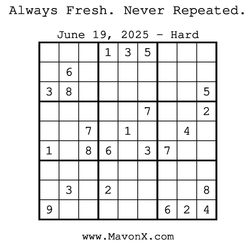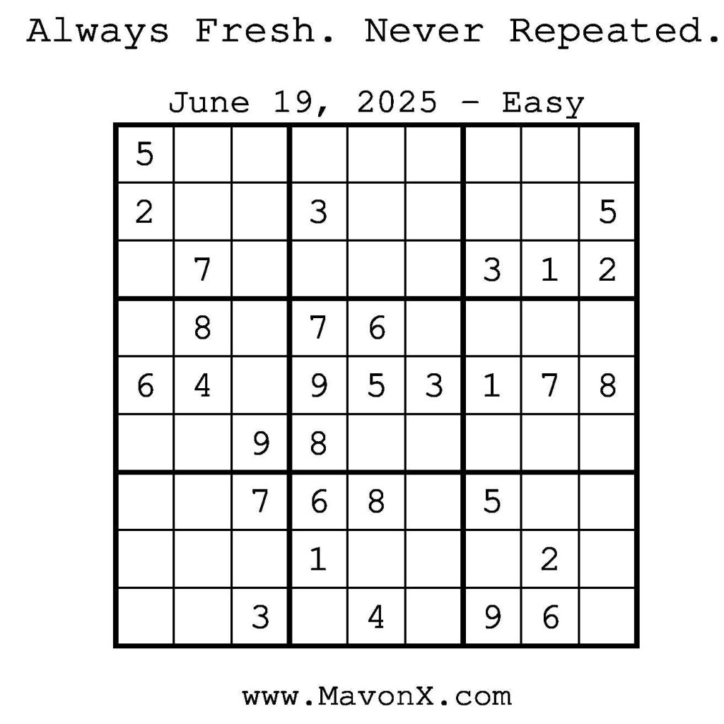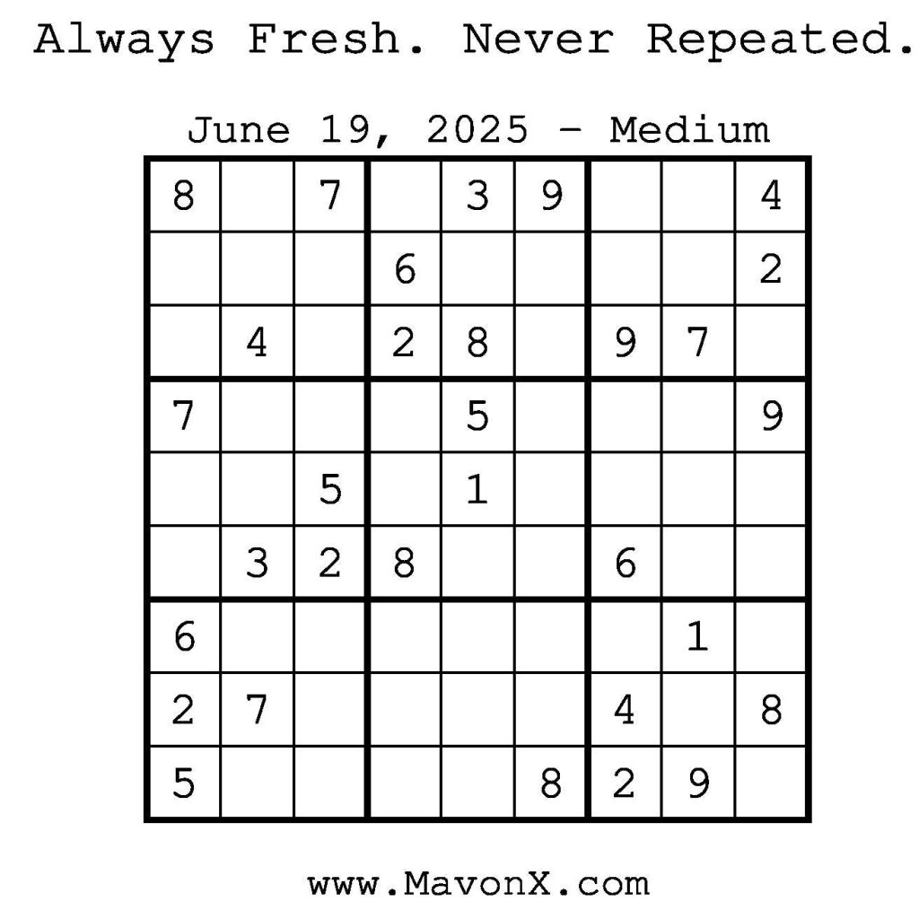 Puzzles of the Day – June 19, 2025 Post author:admin Post published:June 18, 2025 Post category:Free Stuff / Puzzle of the Day / Puzzle of the Day Solutions / Solutions Post comments:0 Comments Check out our books on Amazon! Check out our books on Barnes and Noble! Check out our books on Etsy! Easy Sudoku Coach Link Medium Sudoku Coach Link Hard Sudoku Coach Link Show Solution You Might Also Like Puzzles of the Day – December 09, 2025 December 9, 2025 Puzzles of the Day – April 6, 2025 April 6, 2025 Puzzles of the Day – February 13, 2025 February 13, 2025 Leave a Reply Cancel replyCommentEnter your name or username to comment Enter your email address to comment Enter your website URL (optional) Save my name, email, and website in this browser for the next time I comment.