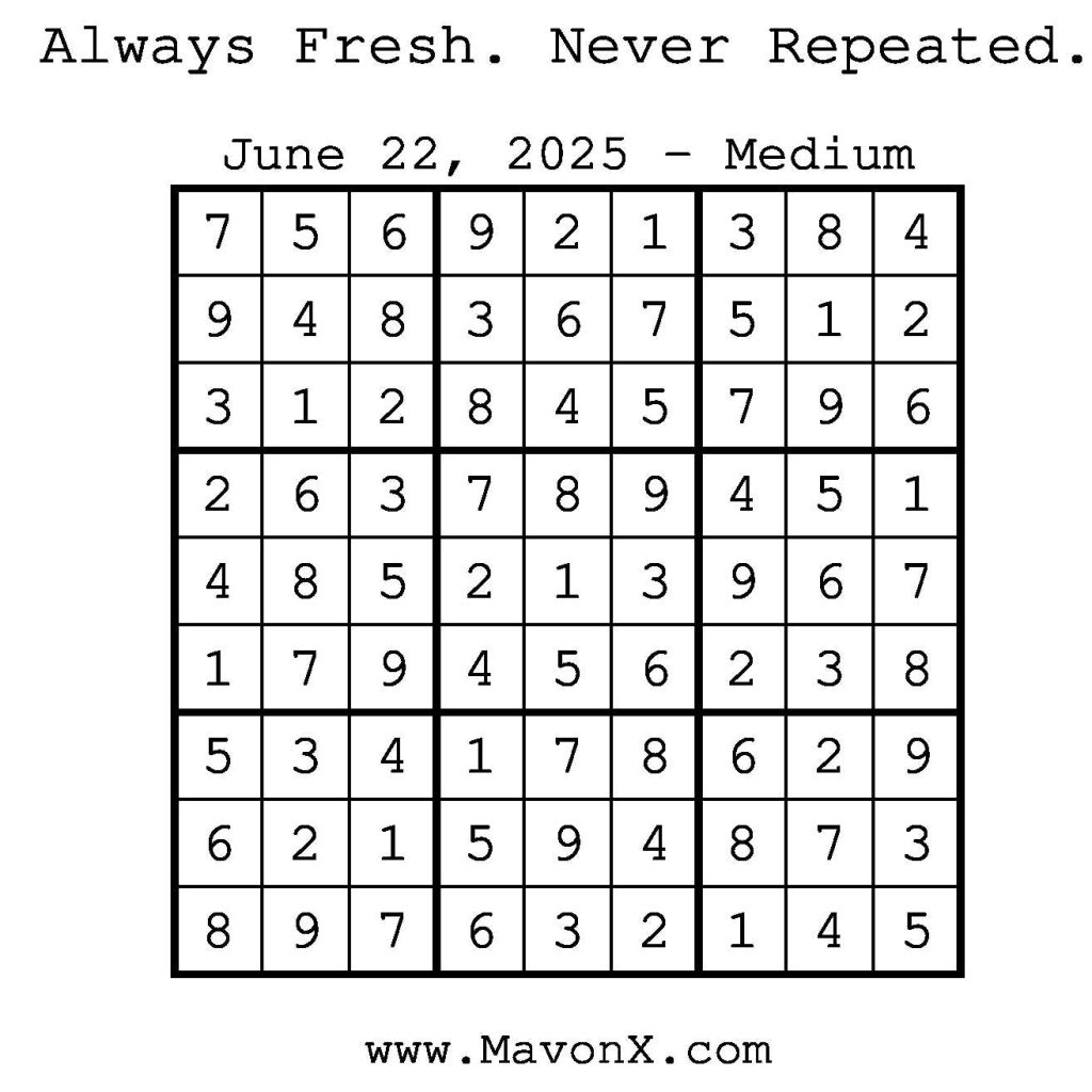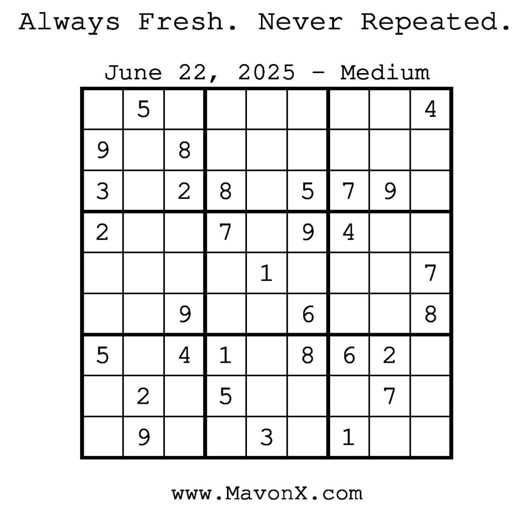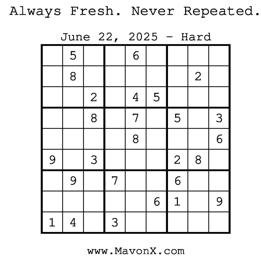 Puzzles of the Day – June 22, 2025 Post author:admin Post published:June 22, 2025 Post category:Free Stuff / Puzzle of the Day / Puzzle of the Day Solutions / Solutions Post comments:0 Comments Check out our books on Amazon! Check out our books on Barnes and Noble! Check out our books on Etsy! Easy Sudoku Coach Link Medium Sudoku Coach Link Hard Sudoku Coach Link Show Solution You Might Also Like Puzzles of the Day – December 20, 2024 December 19, 2024 Puzzle of the Day – August 11, 2024 August 11, 2024 Puzzles of the Day – April 3, 2025 April 3, 2025 Leave a Reply Cancel replyCommentEnter your name or username to comment Enter your email address to comment Enter your website URL (optional) Save my name, email, and website in this browser for the next time I comment.