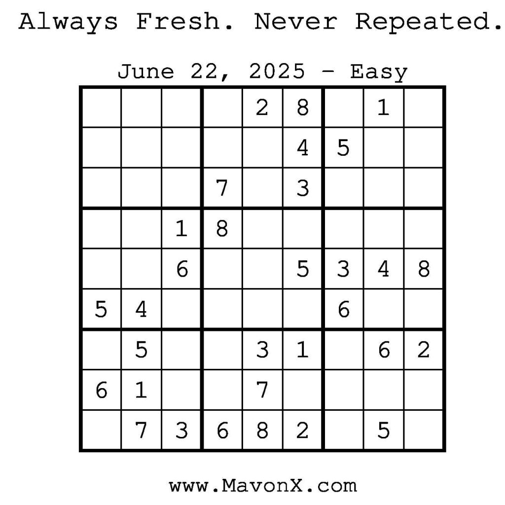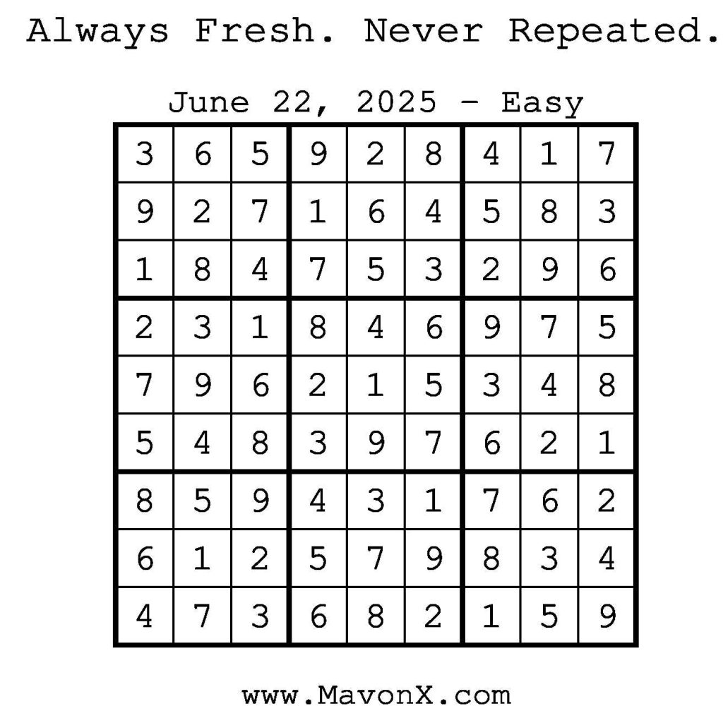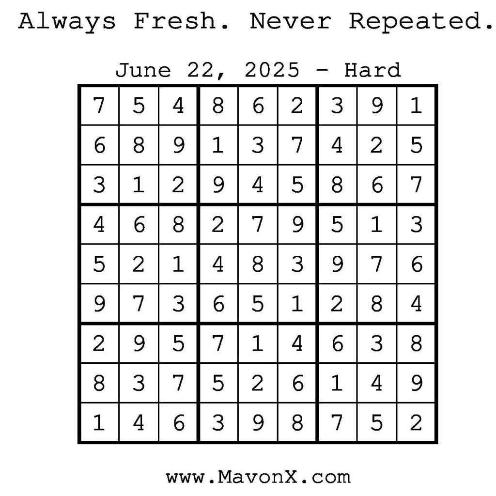 Puzzles of the Day – June 22, 2025 Post author:admin Post published:June 22, 2025 Post category:Free Stuff / Puzzle of the Day / Puzzle of the Day Solutions / Solutions Post comments:0 Comments Check out our books on Amazon! Check out our books on Barnes and Noble! Check out our books on Etsy! Easy Sudoku Coach Link Medium Sudoku Coach Link Hard Sudoku Coach Link Show Solution You Might Also Like Puzzles of the Day – December 20, 2024 December 19, 2024 Puzzle of the Day – August 11, 2024 August 11, 2024 Puzzles of the Day – April 3, 2025 April 3, 2025 Leave a Reply Cancel replyCommentEnter your name or username to comment Enter your email address to comment Enter your website URL (optional) Save my name, email, and website in this browser for the next time I comment.