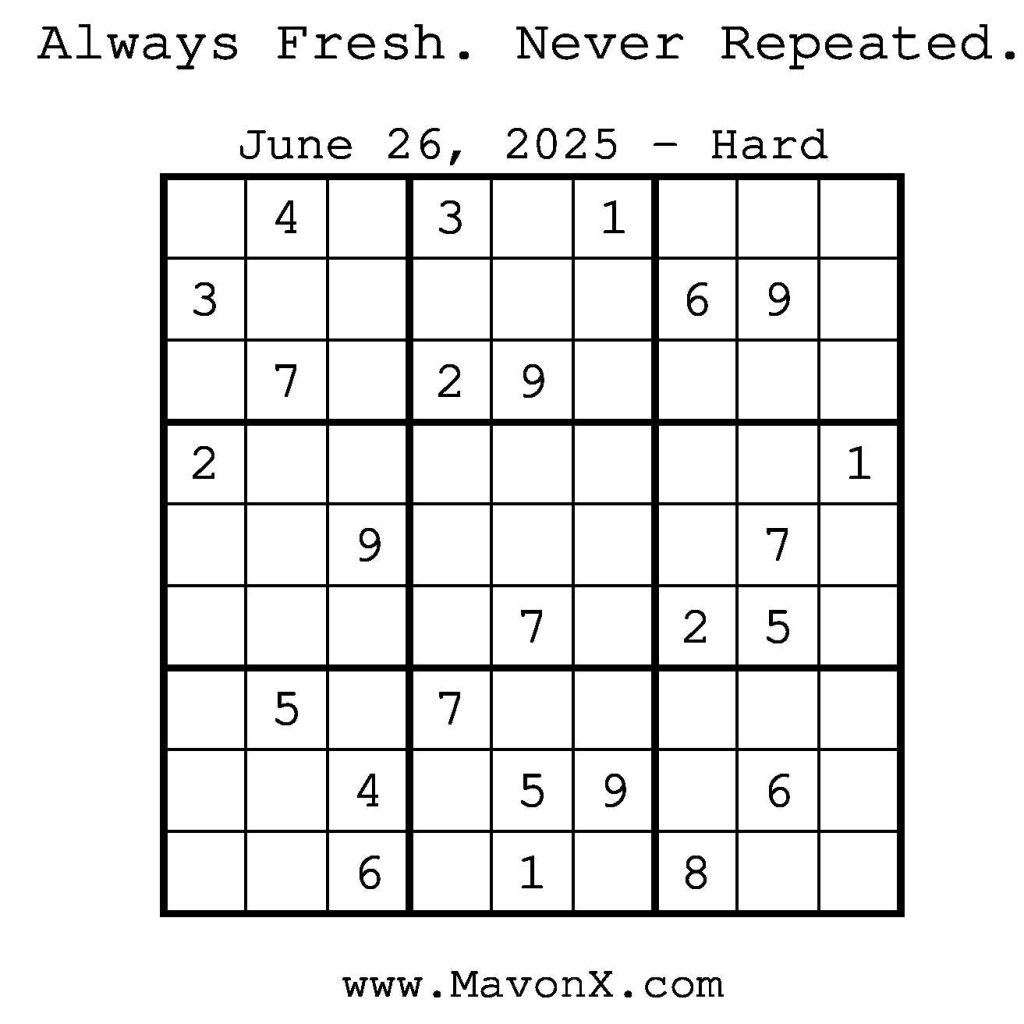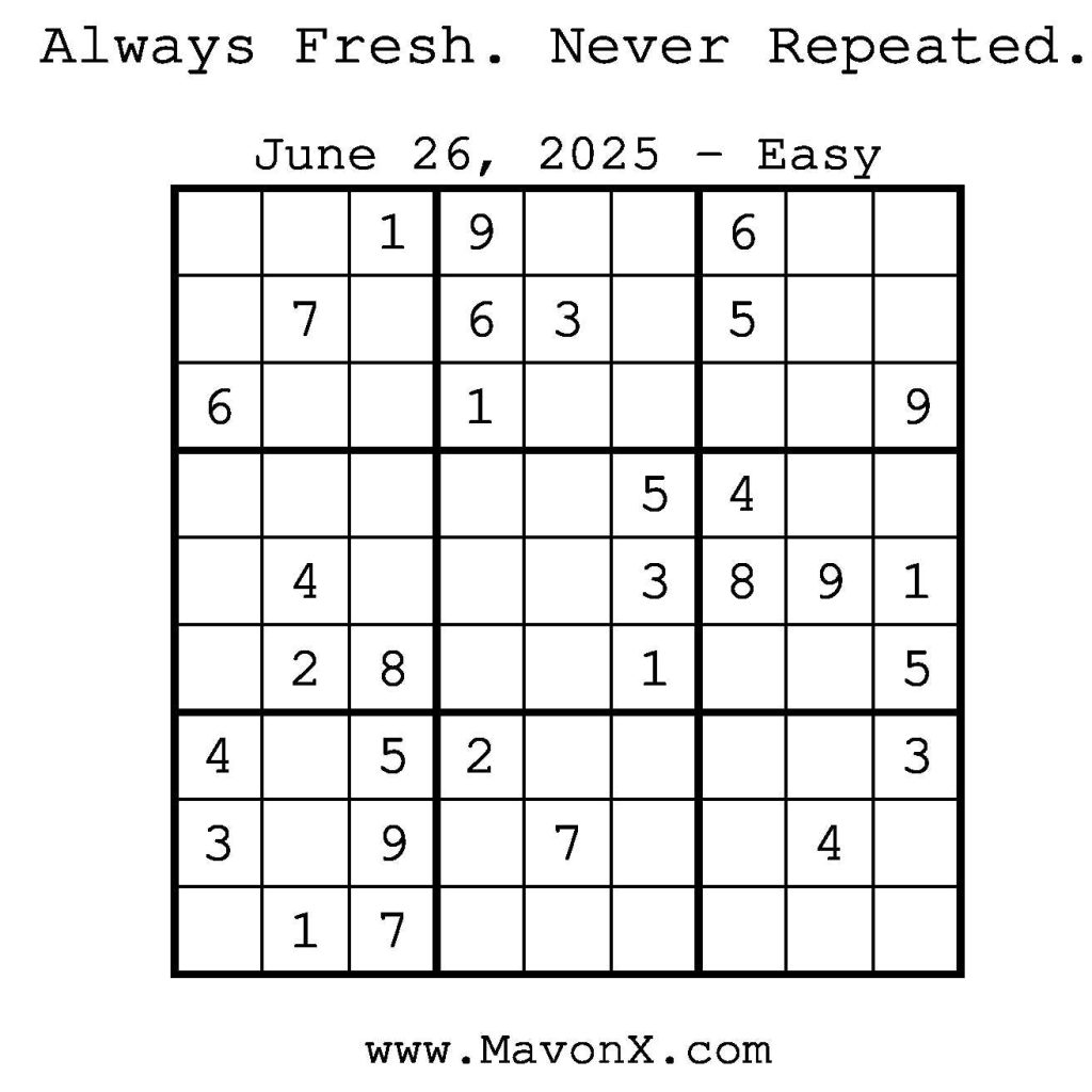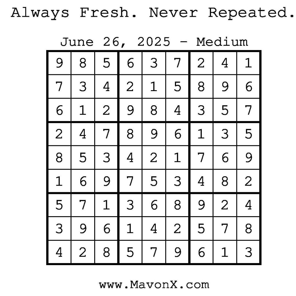 Puzzles of the Day – June 26, 2025 Post author:admin Post published:June 27, 2025 Post category:Free Stuff / Puzzle of the Day / Puzzle of the Day Solutions / Solutions Post comments:0 Comments Check out our books on Amazon! Check out our books on Barnes and Noble! Check out our books on Etsy! Easy Sudoku Coach Link Medium Sudoku Coach Link Hard Sudoku Coach Link Show Solution You Might Also Like Puzzles of the Day – January 4, 2025 January 4, 2025 Puzzles of the Day – January 15, 2026 January 14, 2026 Puzzles of the Day – November 14, 2024 November 13, 2024 Leave a Reply Cancel replyCommentEnter your name or username to comment Enter your email address to comment Enter your website URL (optional) Save my name, email, and website in this browser for the next time I comment.