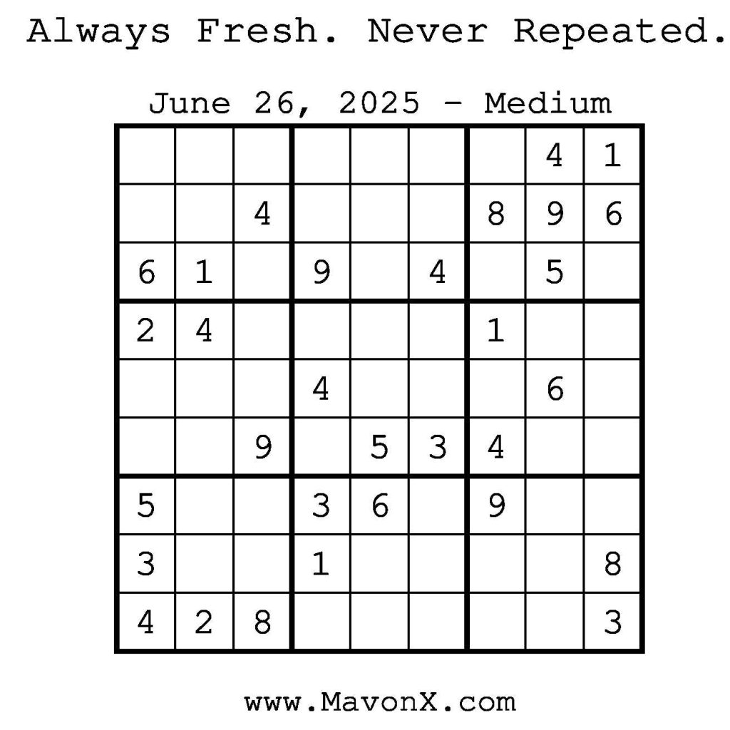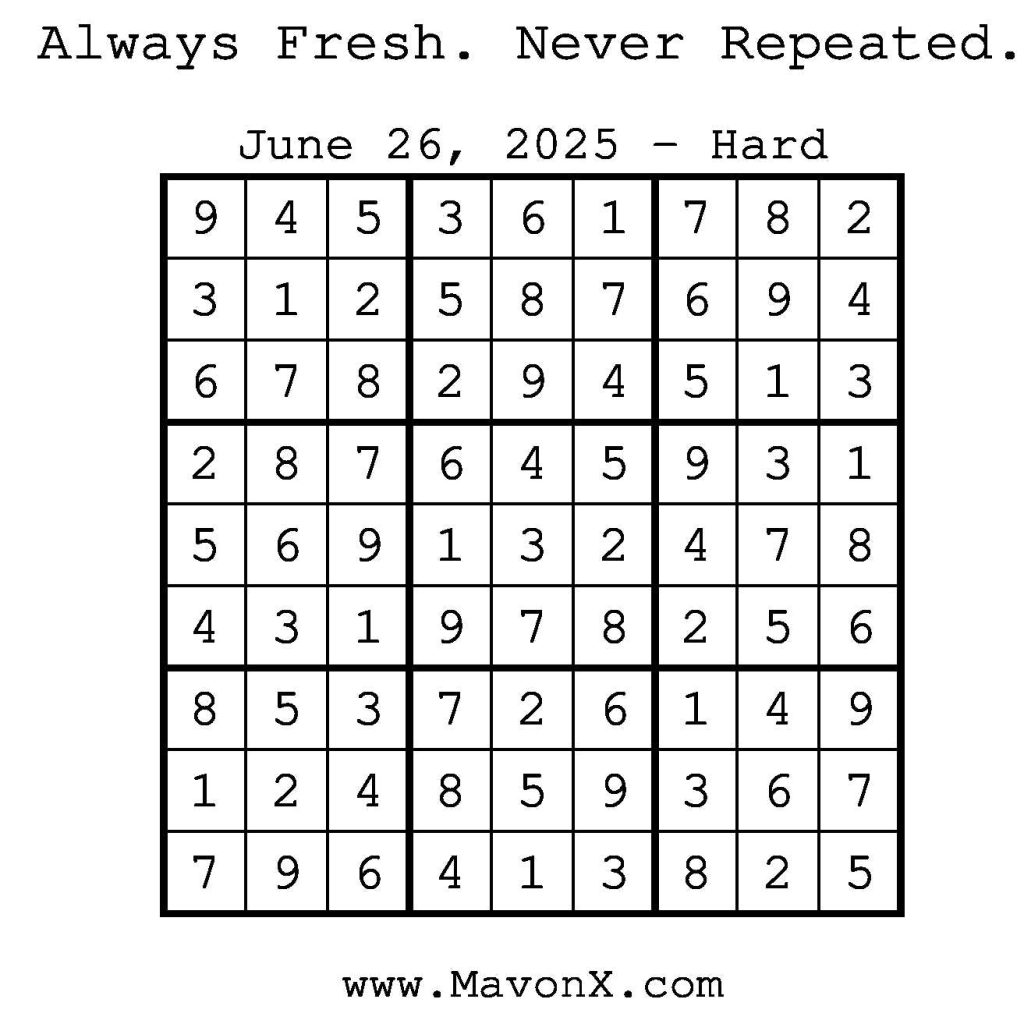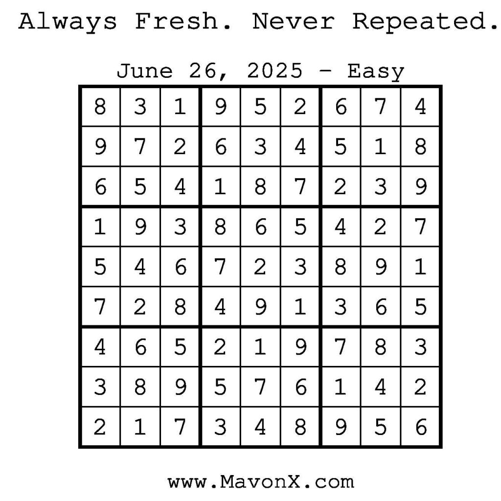 Puzzles of the Day – June 26, 2025 Post author:admin Post published:June 27, 2025 Post category:Free Stuff / Puzzle of the Day / Puzzle of the Day Solutions / Solutions Post comments:0 Comments Check out our books on Amazon! Check out our books on Barnes and Noble! Check out our books on Etsy! Easy Sudoku Coach Link Medium Sudoku Coach Link Hard Sudoku Coach Link Show Solution You Might Also Like Puzzles of the Day – January 4, 2025 January 4, 2025 Puzzles of the Day – January 15, 2026 January 14, 2026 Puzzles of the Day – November 14, 2024 November 13, 2024 Leave a Reply Cancel replyCommentEnter your name or username to comment Enter your email address to comment Enter your website URL (optional) Save my name, email, and website in this browser for the next time I comment.