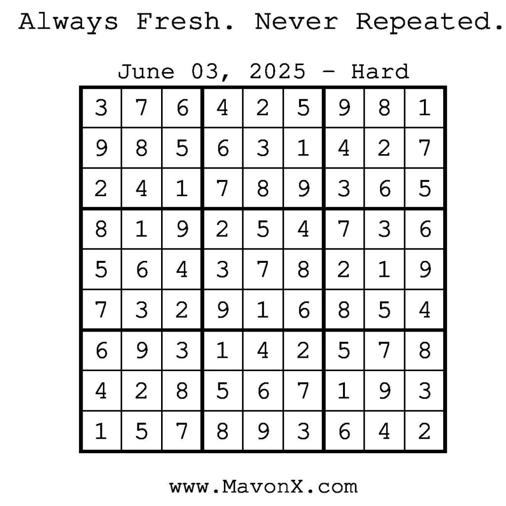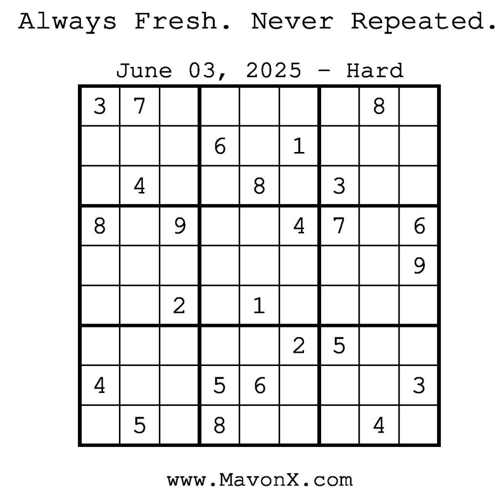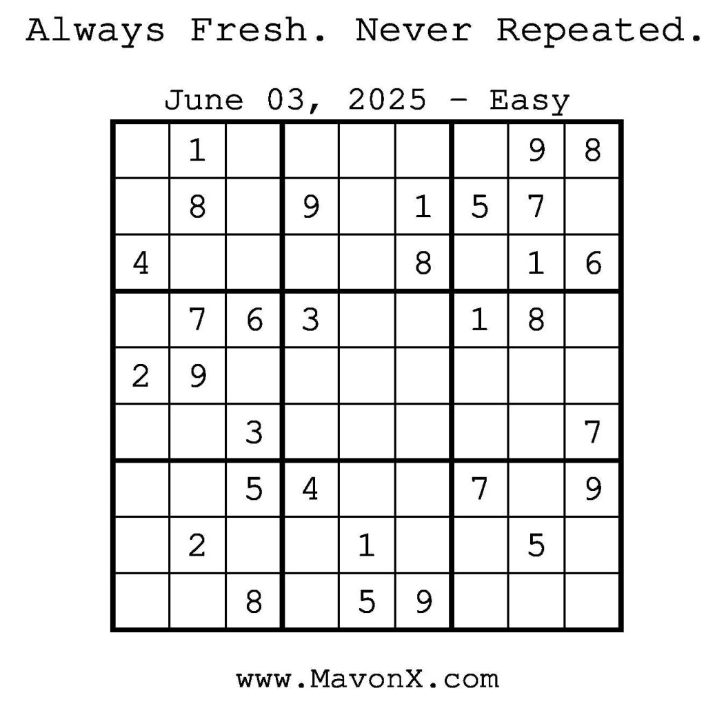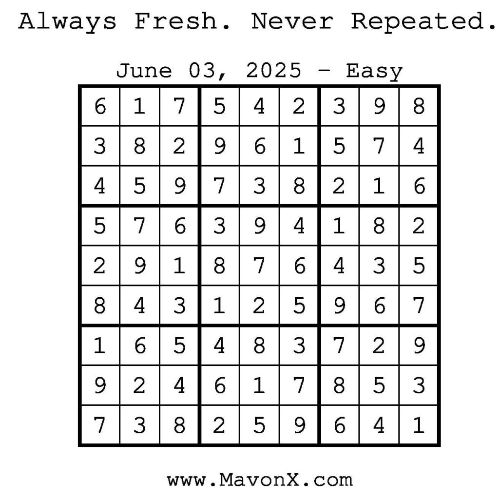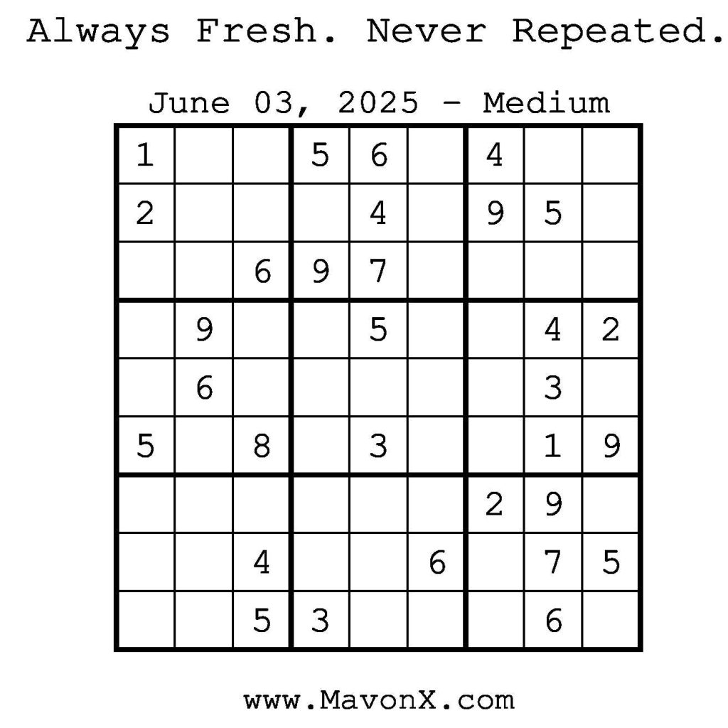 Puzzles of the Day – June 3, 2025 Post author:admin Post published:June 2, 2025 Post category:Free Stuff / Puzzle of the Day / Puzzle of the Day Solutions / Solutions Post comments:0 Comments Check out our books on Amazon! Check out our books on Barnes and Noble! Check out our books on Etsy! Easy Sudoku Coach Link Medium Sudoku Coach Link Hard Sudoku Coach Link Show Solution You Might Also Like Puzzles of the Day – October 30, 2025 October 29, 2025 Puzzles of the Day – January 2, 2025 January 3, 2025 Puzzle of the Day – July 13, 2024 July 13, 2024 Leave a Reply Cancel replyCommentEnter your name or username to comment Enter your email address to comment Enter your website URL (optional) Save my name, email, and website in this browser for the next time I comment.