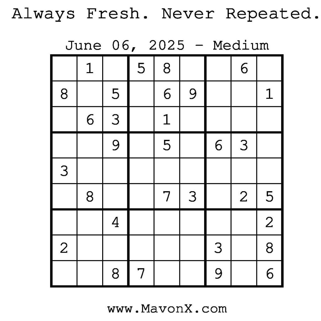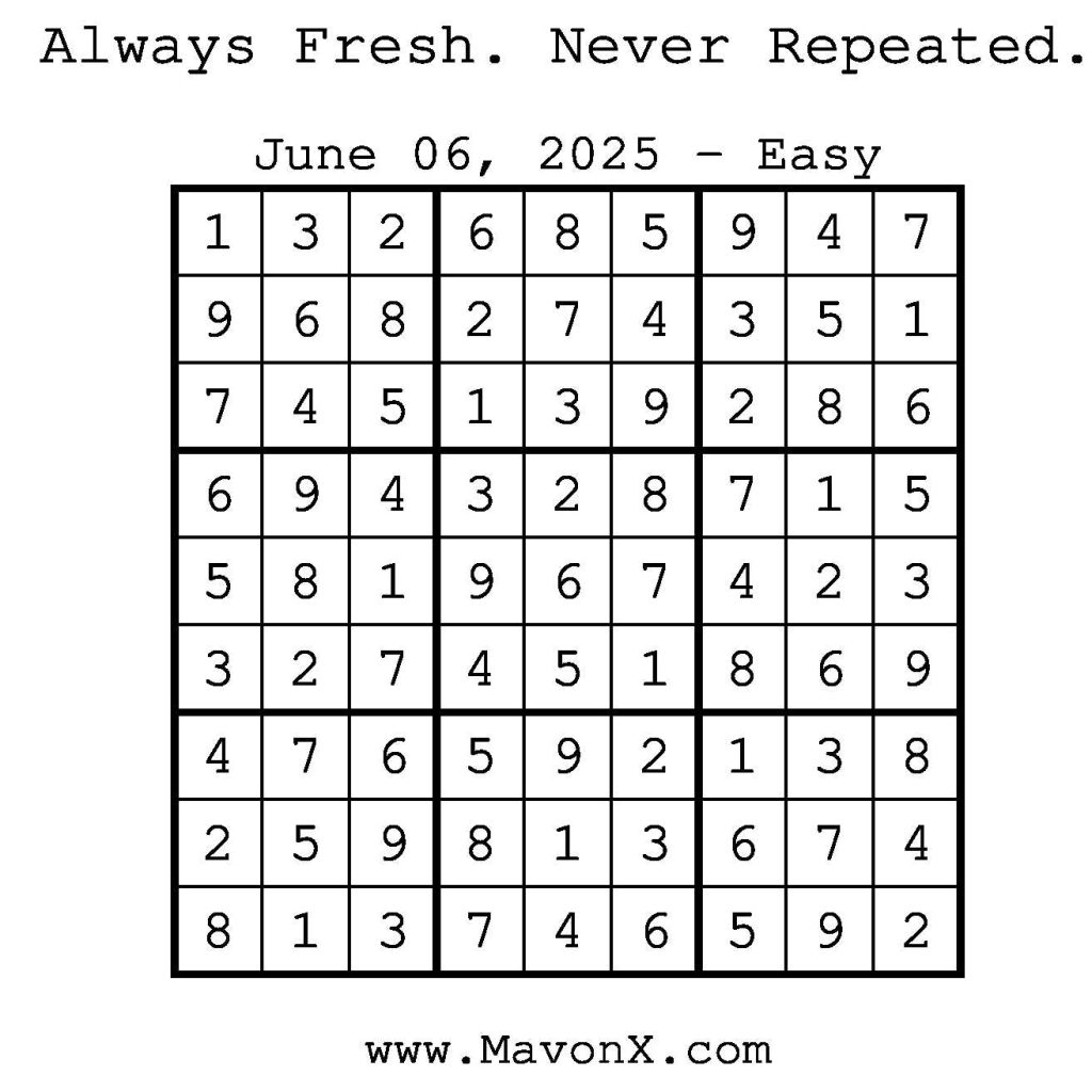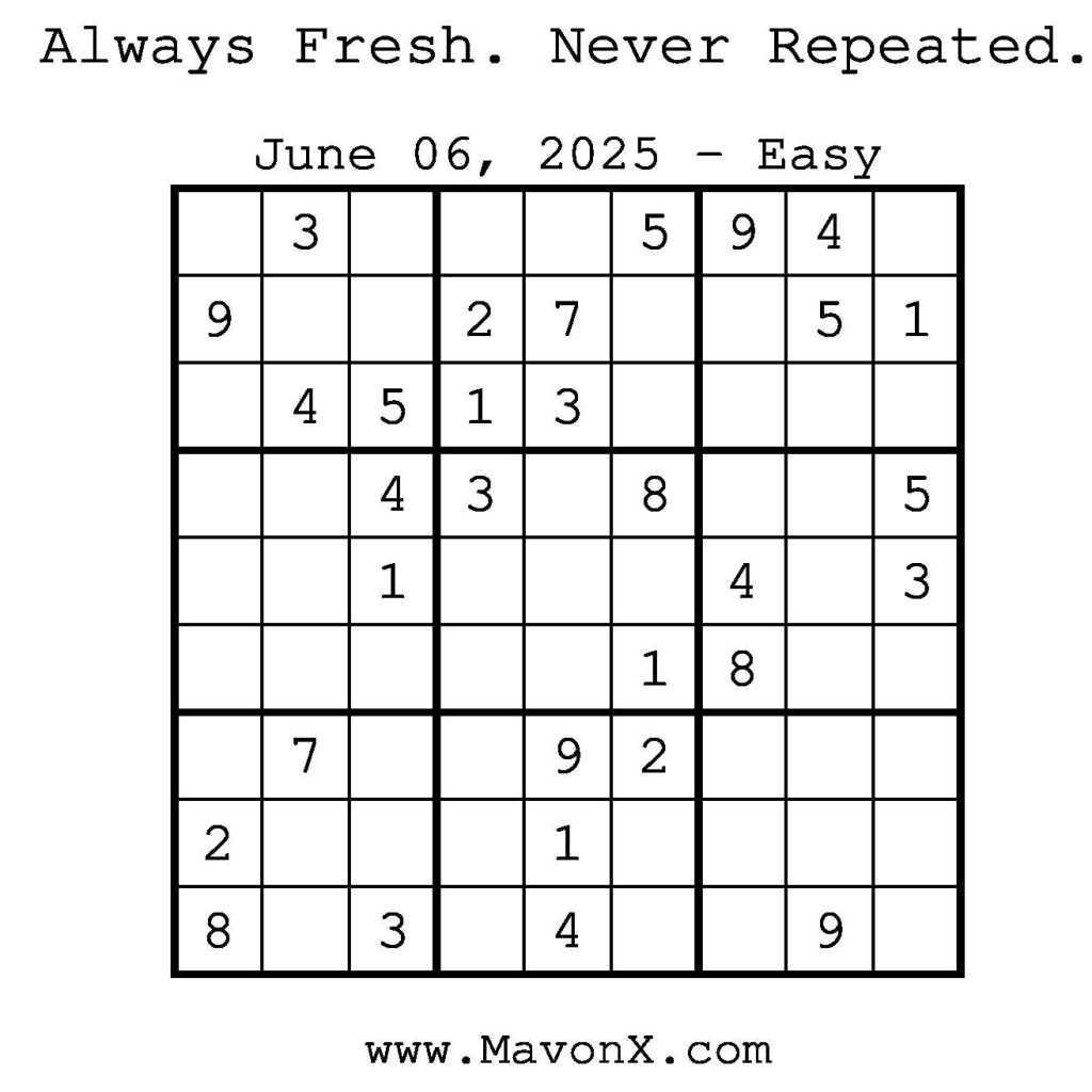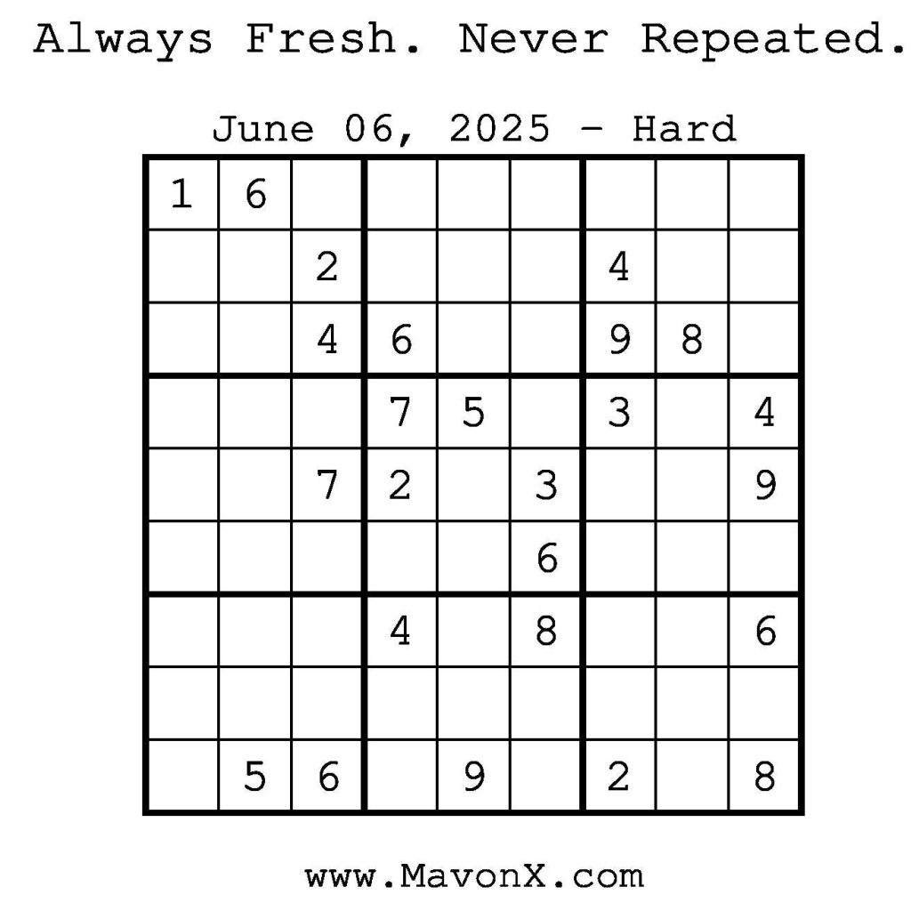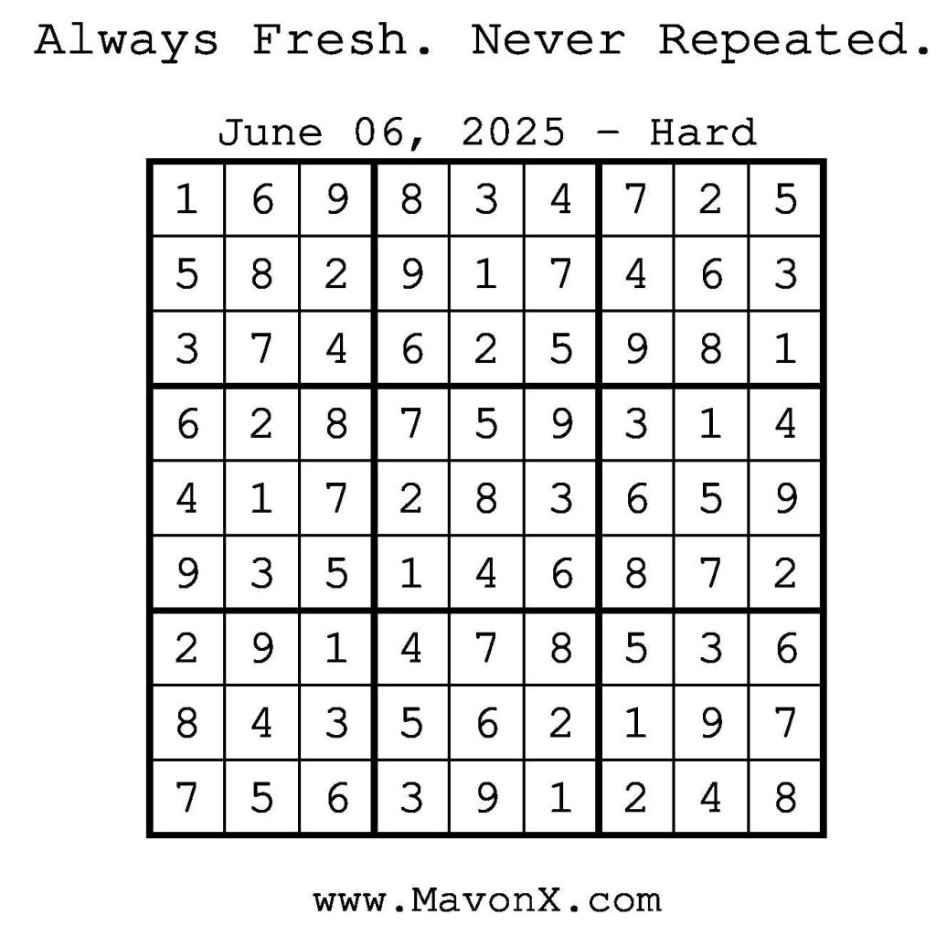 Puzzles of the Day – June 6, 2025 Post author:admin Post published:June 5, 2025 Post category:Free Stuff / Puzzle of the Day / Puzzle of the Day Solutions / Solutions Post comments:0 Comments Check out our books on Amazon! Check out our books on Barnes and Noble! Check out our books on Etsy! Easy Sudoku Coach Link Medium Sudoku Coach Link Hard Sudoku Coach Link Show Solution You Might Also Like Puzzles of the Day – March 19, 2025 March 19, 2025 Puzzles of the Day – December 13, 2024 December 12, 2024 Puzzles of the Day – September 12, 2024 September 12, 2024 Leave a Reply Cancel replyCommentEnter your name or username to comment Enter your email address to comment Enter your website URL (optional) Save my name, email, and website in this browser for the next time I comment.