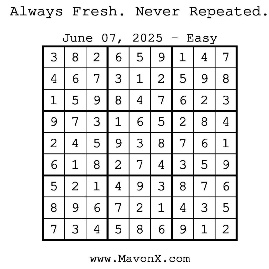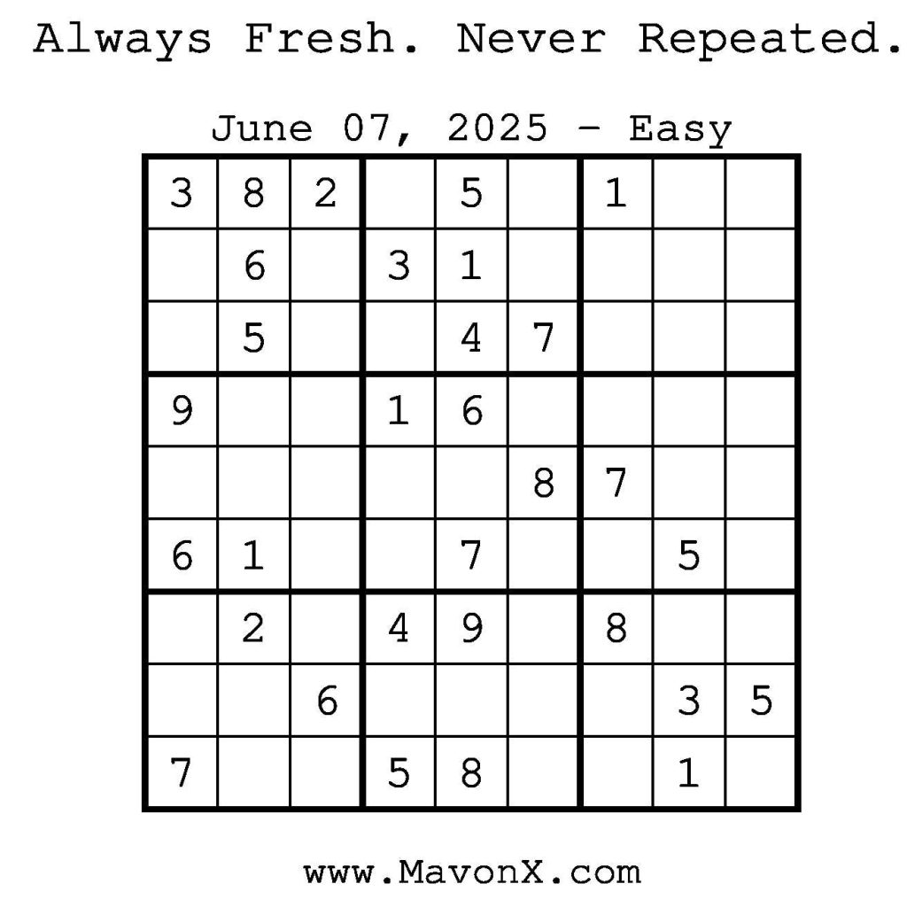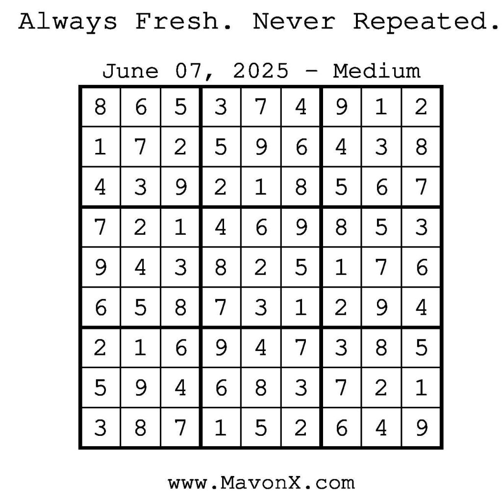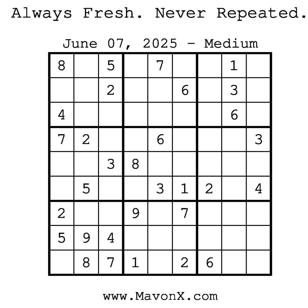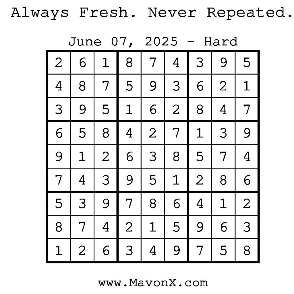 Puzzles of the Day – June 7, 2025 Post author:admin Post published:June 8, 2025 Post category:Free Stuff / Puzzle of the Day / Puzzle of the Day Solutions / Solutions Post comments:0 Comments Check out our books on Amazon! Check out our books on Barnes and Noble! Check out our books on Etsy! Easy Sudoku Coach Link Medium Sudoku Coach Link Hard Sudoku Coach Link Show Solution You Might Also Like Puzzles of the Day – November 19, 2024 November 19, 2024 Puzzle of the Day – July 10, 2024 July 10, 2024 Puzzles of the Day – May 5, 2025 May 4, 2025 Leave a Reply Cancel replyCommentEnter your name or username to comment Enter your email address to comment Enter your website URL (optional) Save my name, email, and website in this browser for the next time I comment.
