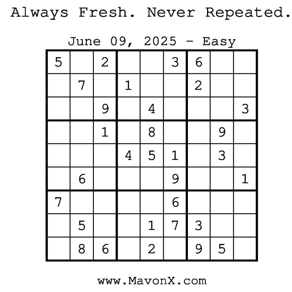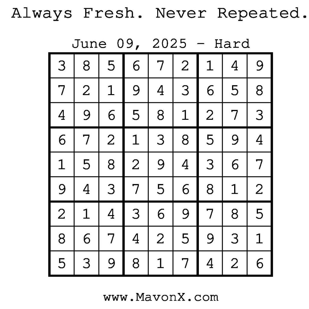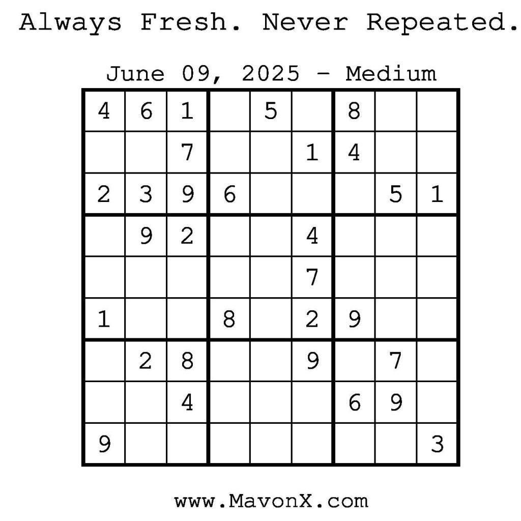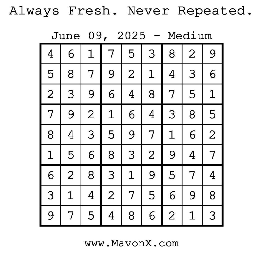 Puzzles of the Day – June 9, 2025 Post author:admin Post published:June 9, 2025 Post category:Free Stuff / Puzzle of the Day / Puzzle of the Day Solutions / Solutions Post comments:0 Comments Check out our books on Amazon! Check out our books on Barnes and Noble! Check out our books on Etsy! Easy Sudoku Coach Link Medium Sudoku Coach Link Hard Sudoku Coach Link Show Solution You Might Also Like Puzzles of the Day – February 12, 2026 February 12, 2026 Puzzles of the Day – August 16, 2024 August 16, 2024 Puzzles of the Day – January 27, 2026 January 27, 2026 Leave a Reply Cancel replyCommentEnter your name or username to comment Enter your email address to comment Enter your website URL (optional) Save my name, email, and website in this browser for the next time I comment.