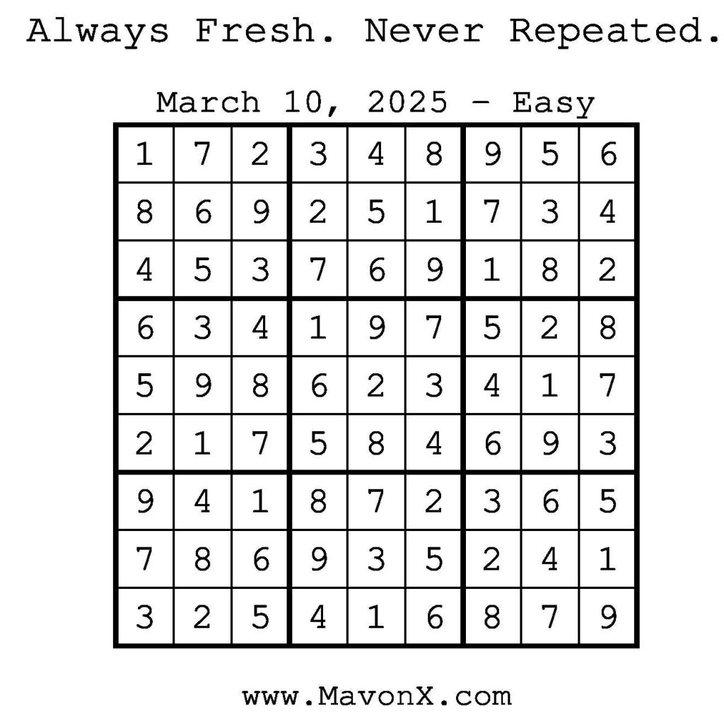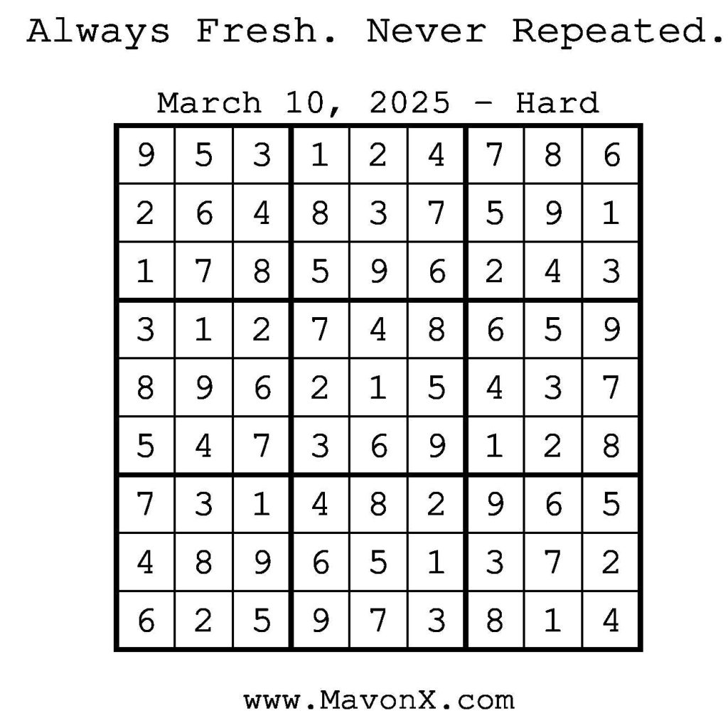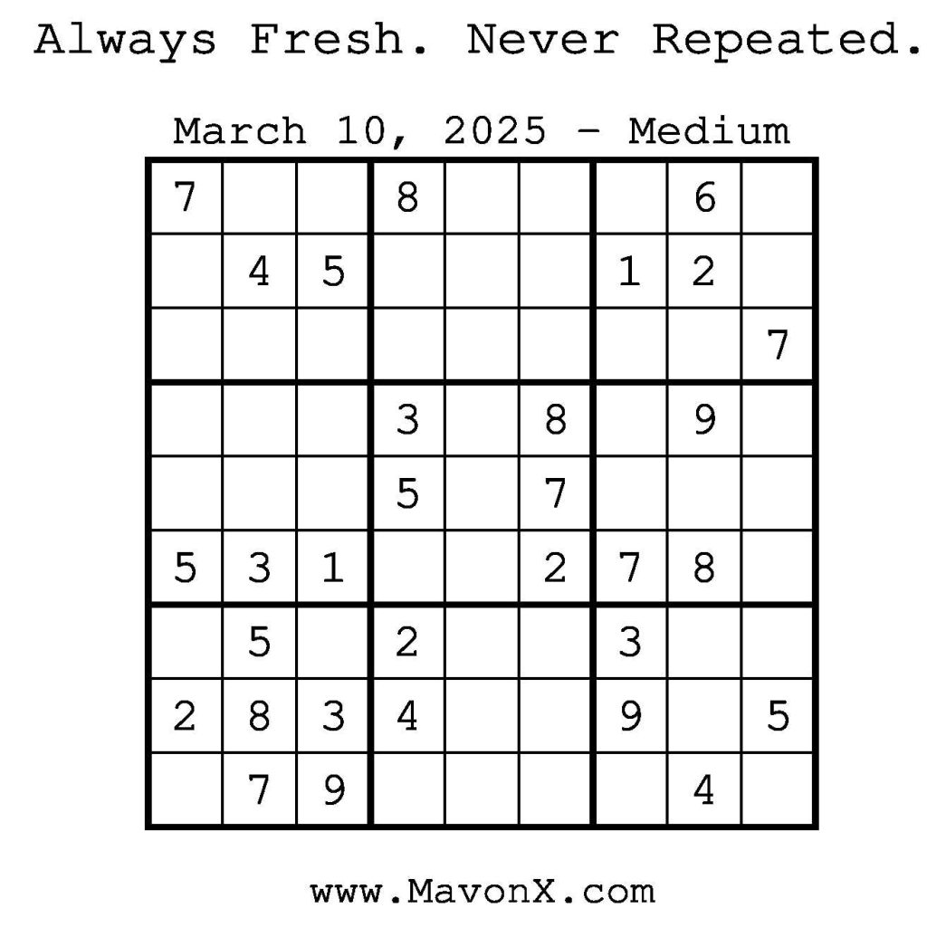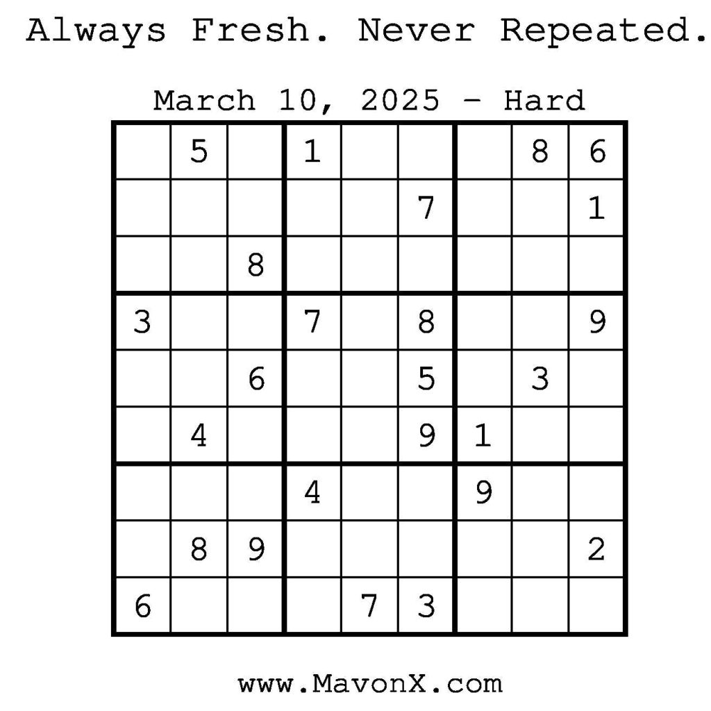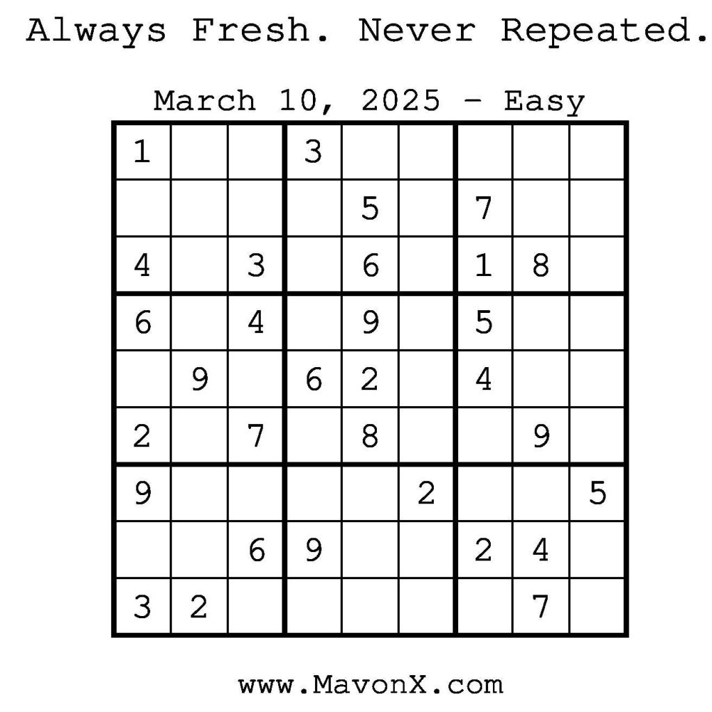 Puzzles of the Day – March 10, 2025 Post author:admin Post published:March 10, 2025 Post category:Free Stuff / Puzzle of the Day / Puzzle of the Day Solutions / Solutions Post comments:0 Comments Check out our books on Amazon! Check out our books on Barnes and Noble! Check out our books on Etsy! Easy Sudoku Coach Link Medium Sudoku Coach Link Hard Sudoku Coach Link Show Solution You Might Also Like Puzzles of the Day – November 4, 2024 November 4, 2024 Puzzles of the Day – July 24, 2025 July 24, 2025 Puzzle of the Day – July 10, 2024 July 10, 2024 Leave a Reply Cancel replyCommentEnter your name or username to comment Enter your email address to comment Enter your website URL (optional) Save my name, email, and website in this browser for the next time I comment.
