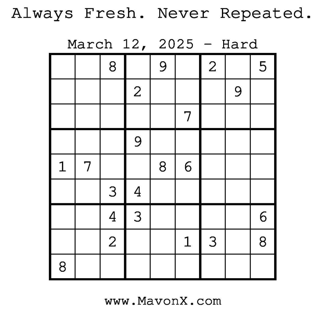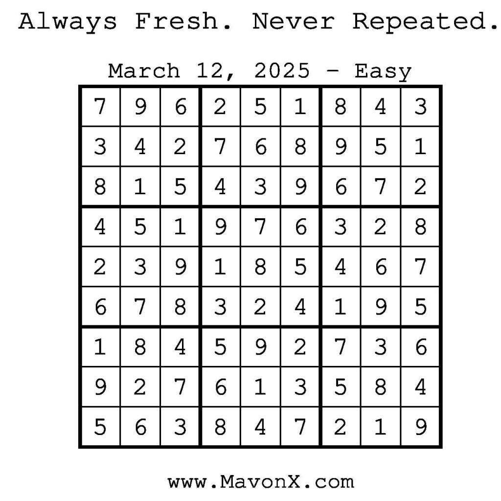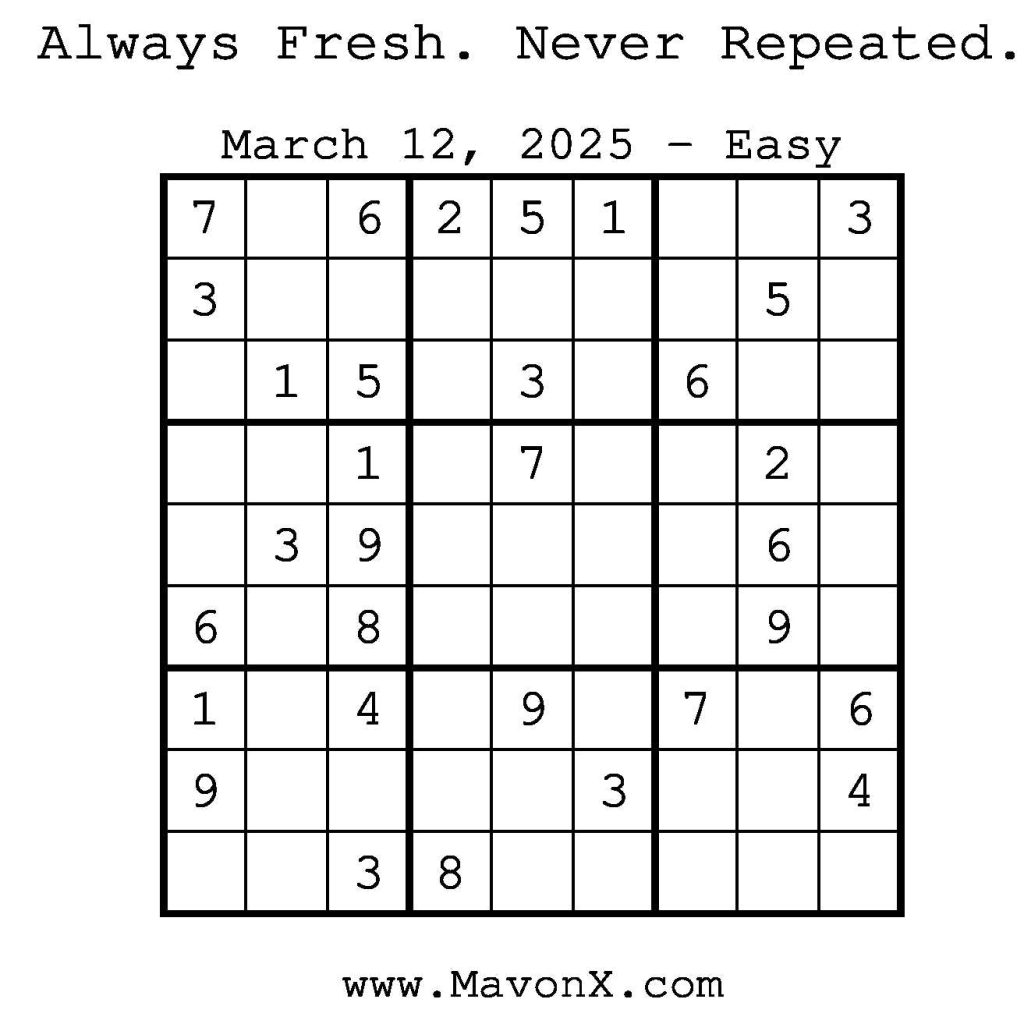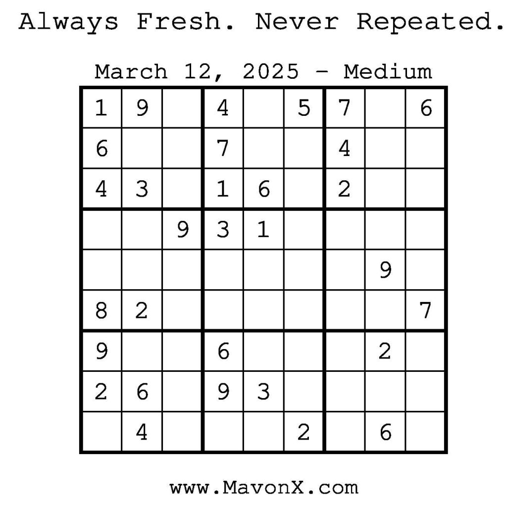 Puzzles of the Day – March 12, 2025 Post author:admin Post published:March 12, 2025 Post category:Free Stuff / Puzzle of the Day / Puzzle of the Day Solutions / Solutions Post comments:0 Comments Check out our books on Amazon! Check out our books on Barnes and Noble! Check out our books on Etsy! Easy Sudoku Coach Link Medium Sudoku Coach Link Hard Sudoku Coach Link Show Solution You Might Also Like Puzzles of the Day – November 29, 2025 November 29, 2025 Puzzles of the Day – February 12, 2026 February 12, 2026 Puzzles of the Day – April 14, 2025 April 14, 2025 Leave a Reply Cancel replyCommentEnter your name or username to comment Enter your email address to comment Enter your website URL (optional) Save my name, email, and website in this browser for the next time I comment.