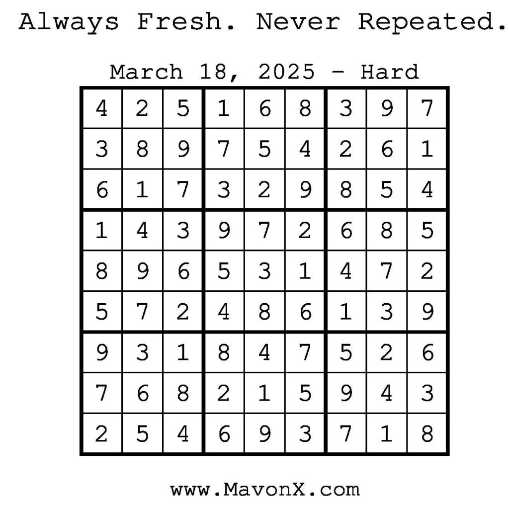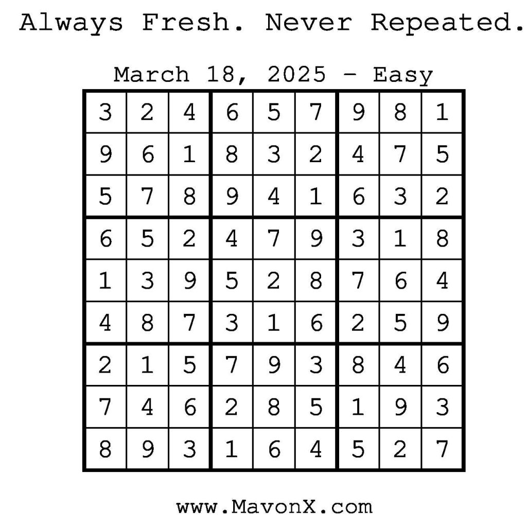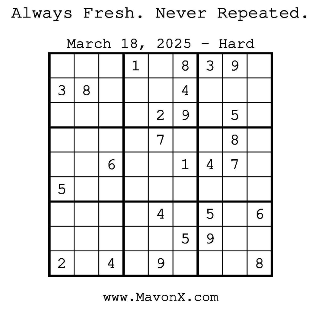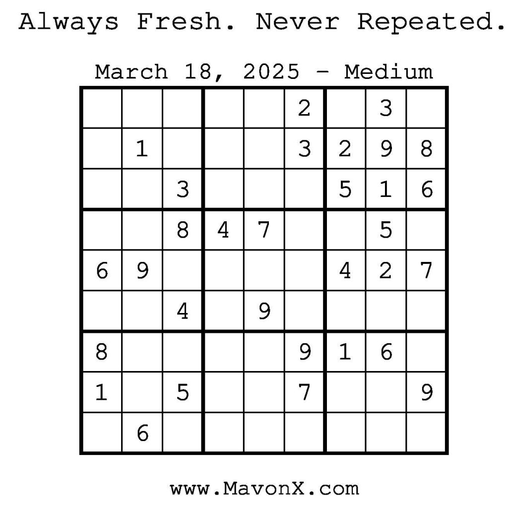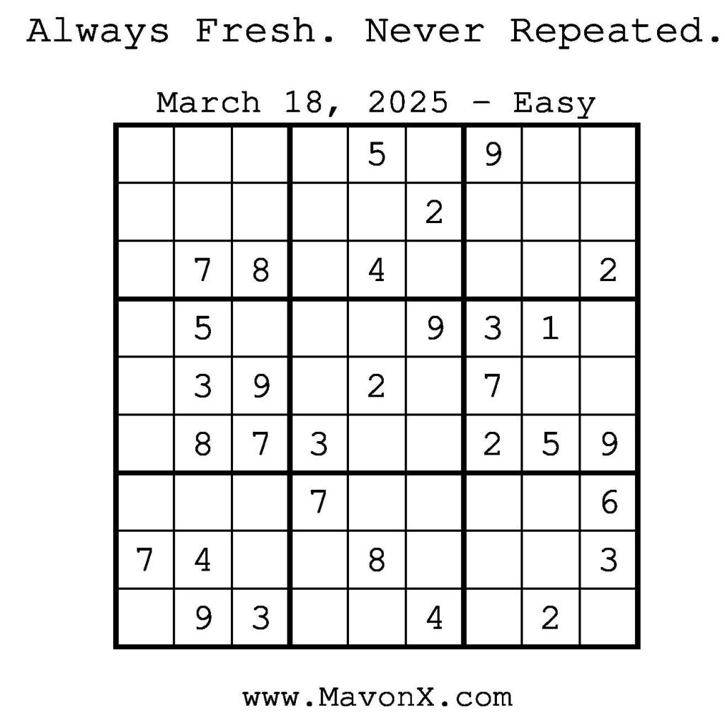 Puzzles of the Day – March 18, 2025 Post author:admin Post published:March 18, 2025 Post category:Free Stuff / Puzzle of the Day / Puzzle of the Day Solutions / Solutions Post comments:0 Comments Check out our books on Amazon! Check out our books on Barnes and Noble! Check out our books on Etsy! Easy Sudoku Coach Link Medium Sudoku Coach Link Hard Sudoku Coach Link Show Solution You Might Also Like Puzzles of the Day – April 24, 2025 April 23, 2025 Puzzles of the Day – November 12, 2025 November 12, 2025 Puzzles of the Day – July 23, 2025 July 23, 2025 Leave a Reply Cancel replyCommentEnter your name or username to comment Enter your email address to comment Enter your website URL (optional) Save my name, email, and website in this browser for the next time I comment.
