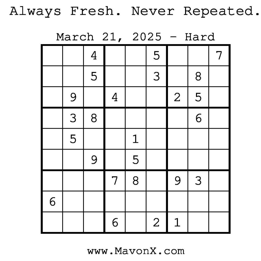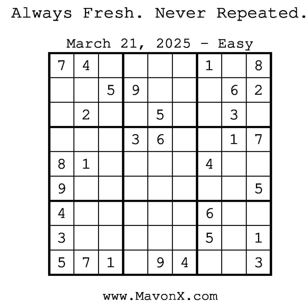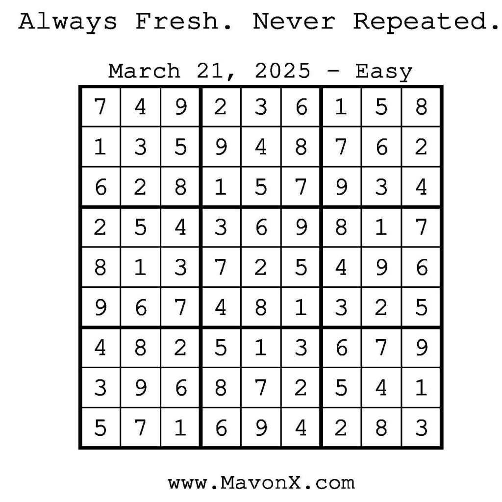 Puzzles of the Day – March 21, 2025 Post author:admin Post published:March 21, 2025 Post category:Free Stuff / Puzzle of the Day / Puzzle of the Day Solutions / Solutions Post comments:0 Comments Check out our books on Amazon! Check out our books on Barnes and Noble! Check out our books on Etsy! Easy Sudoku Coach Link Medium Sudoku Coach Link Hard Sudoku Coach Link Show Solution You Might Also Like Puzzles of the Day – February 24, 2026 February 23, 2026 Puzzles of the Day – October 26, 2025 October 26, 2025 Puzzle of the Day – August 2, 2024 August 2, 2024 Leave a Reply Cancel replyCommentEnter your name or username to comment Enter your email address to comment Enter your website URL (optional) Save my name, email, and website in this browser for the next time I comment.