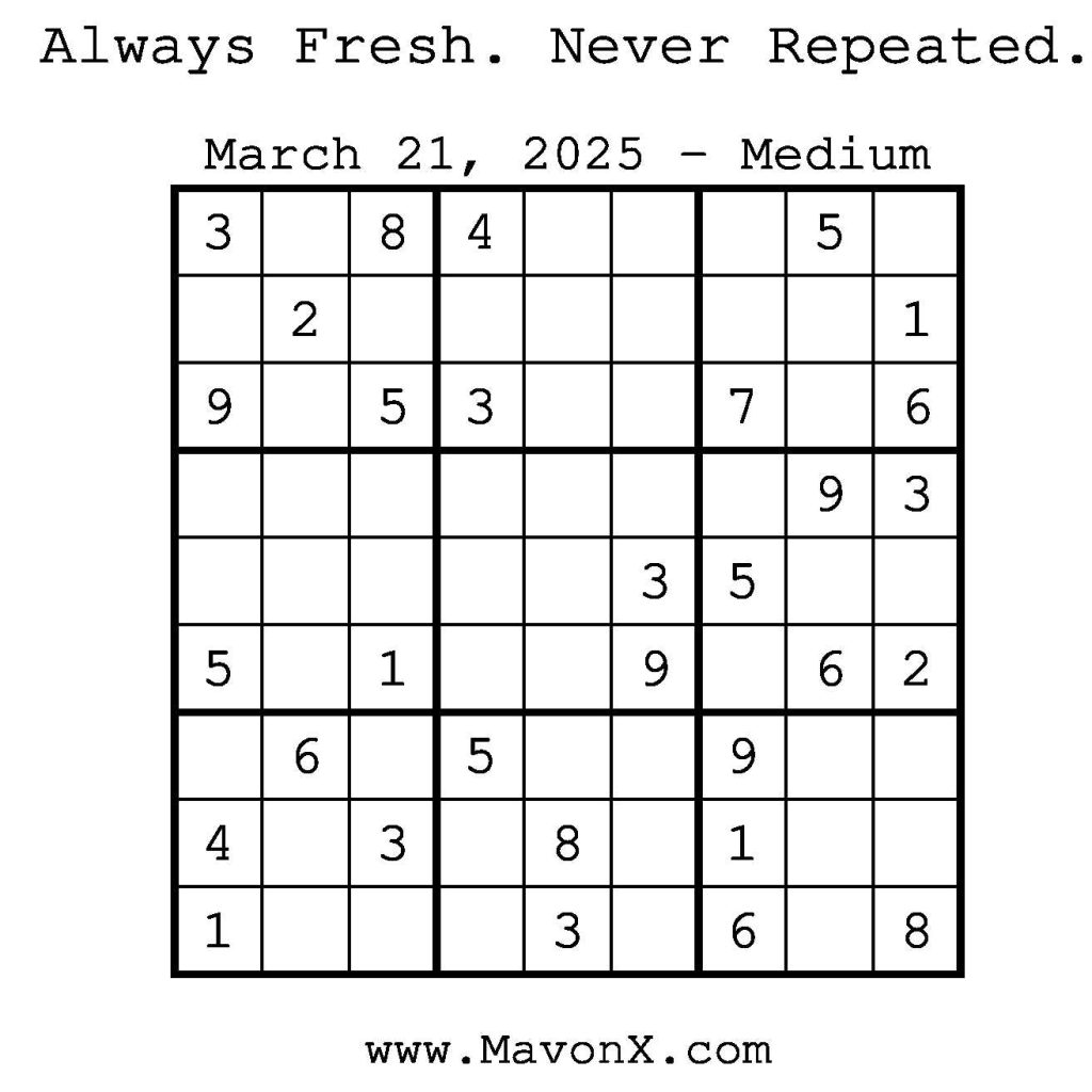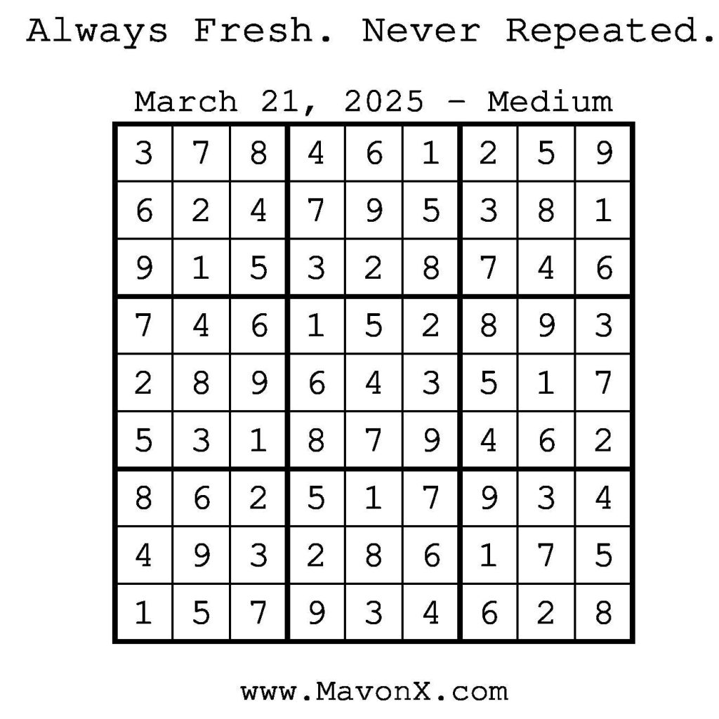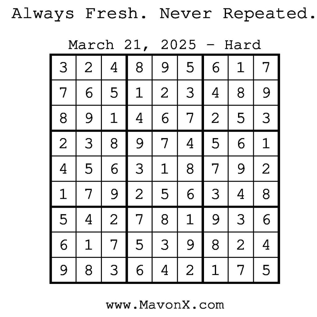 Puzzles of the Day – March 21, 2025 Post author:admin Post published:March 21, 2025 Post category:Free Stuff / Puzzle of the Day / Puzzle of the Day Solutions / Solutions Post comments:0 Comments Check out our books on Amazon! Check out our books on Barnes and Noble! Check out our books on Etsy! Easy Sudoku Coach Link Medium Sudoku Coach Link Hard Sudoku Coach Link Show Solution You Might Also Like Puzzles of the Day – February 24, 2026 February 23, 2026 Puzzles of the Day – October 26, 2025 October 26, 2025 Puzzle of the Day – August 2, 2024 August 2, 2024 Leave a Reply Cancel replyCommentEnter your name or username to comment Enter your email address to comment Enter your website URL (optional) Save my name, email, and website in this browser for the next time I comment.