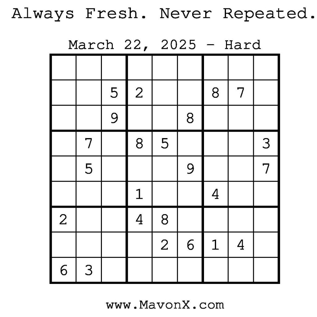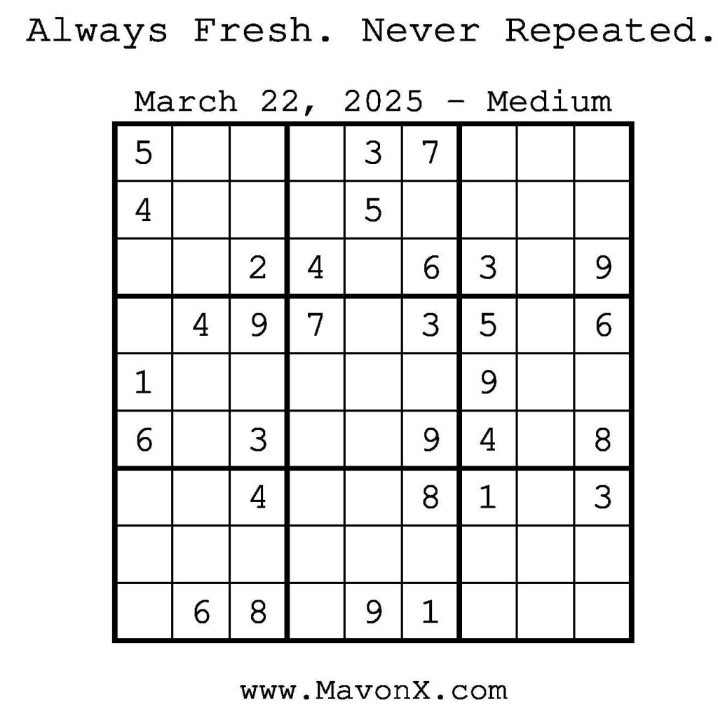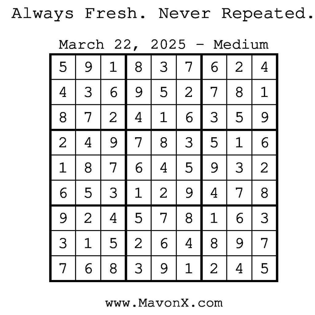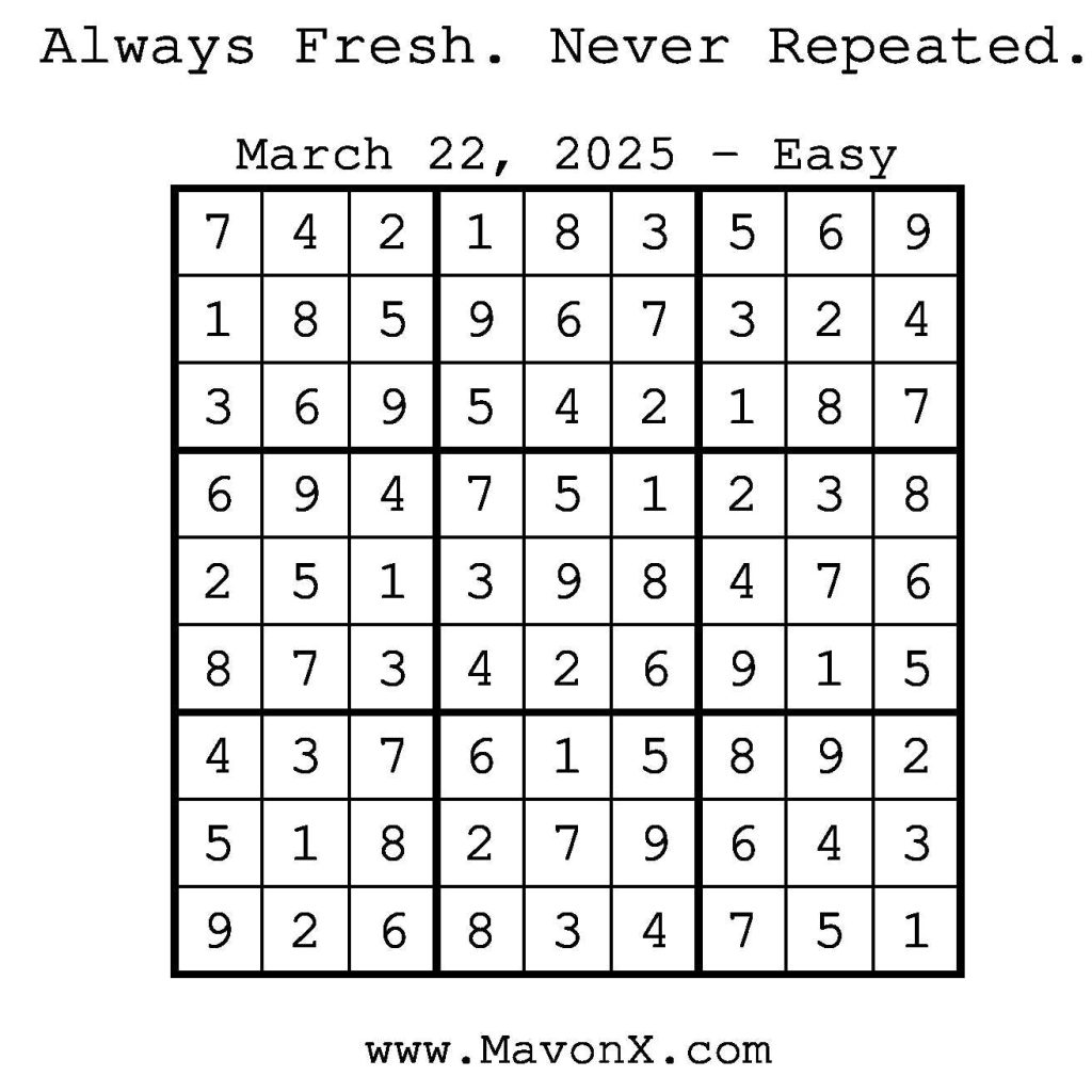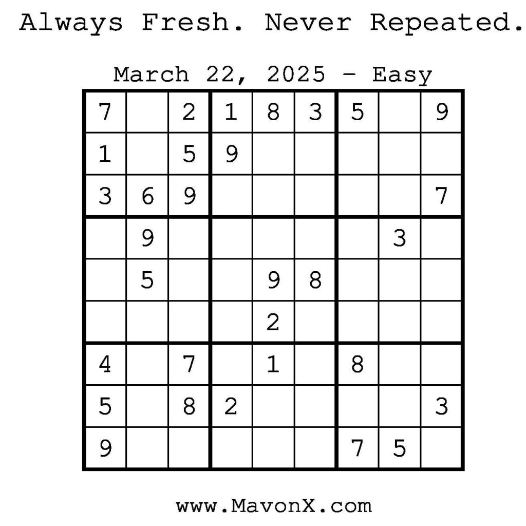 Puzzles of the Day – March 22, 2025 Post author:admin Post published:March 22, 2025 Post category:Free Stuff / Puzzle of the Day / Puzzle of the Day Solutions / Solutions Post comments:0 Comments Check out our books on Amazon! Check out our books on Barnes and Noble! Check out our books on Etsy! Easy Sudoku Coach Link Medium Sudoku Coach Link Hard Sudoku Coach Link Show Solution You Might Also Like Puzzles of the Day – February 26, 2025 February 25, 2025 Puzzles of the Day – December 13, 2025 December 12, 2025 Puzzles of the Day – May 9, 2025 May 9, 2025 Leave a Reply Cancel replyCommentEnter your name or username to comment Enter your email address to comment Enter your website URL (optional) Save my name, email, and website in this browser for the next time I comment.