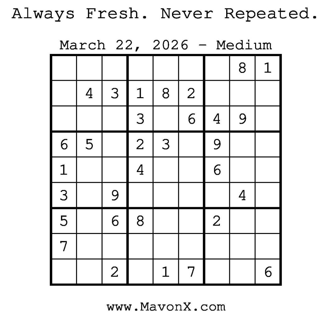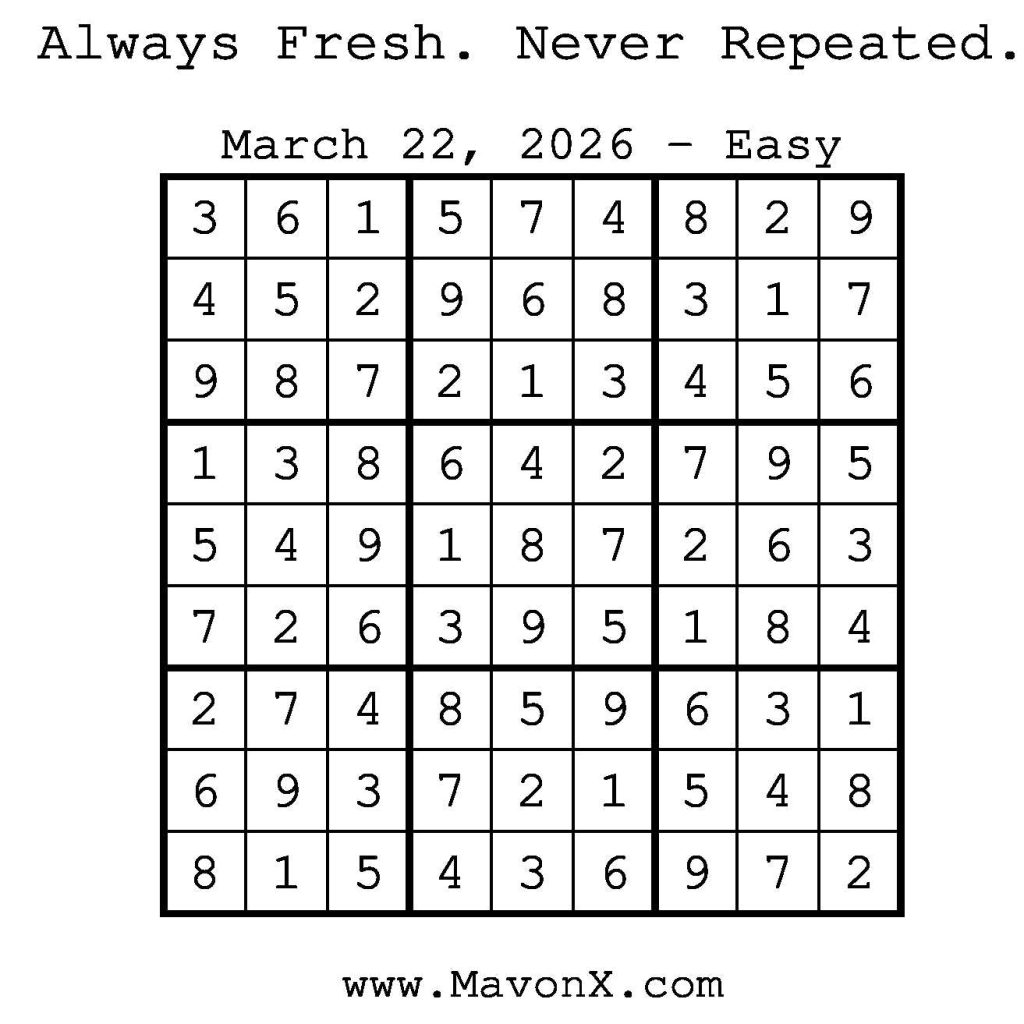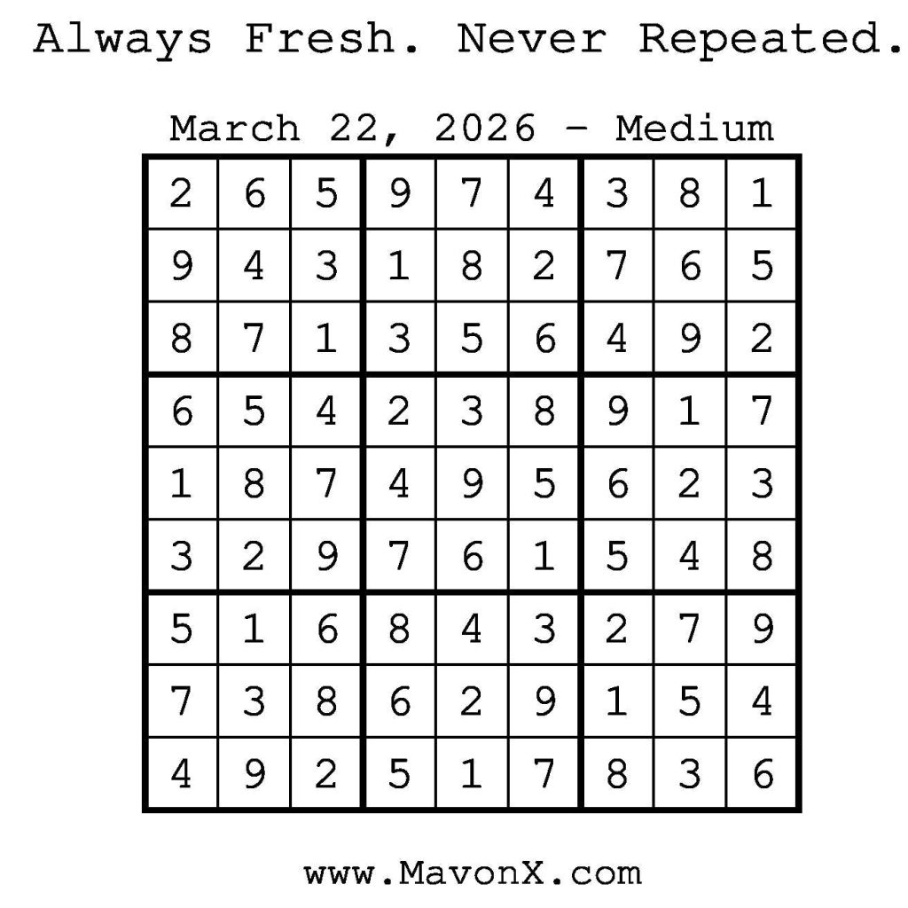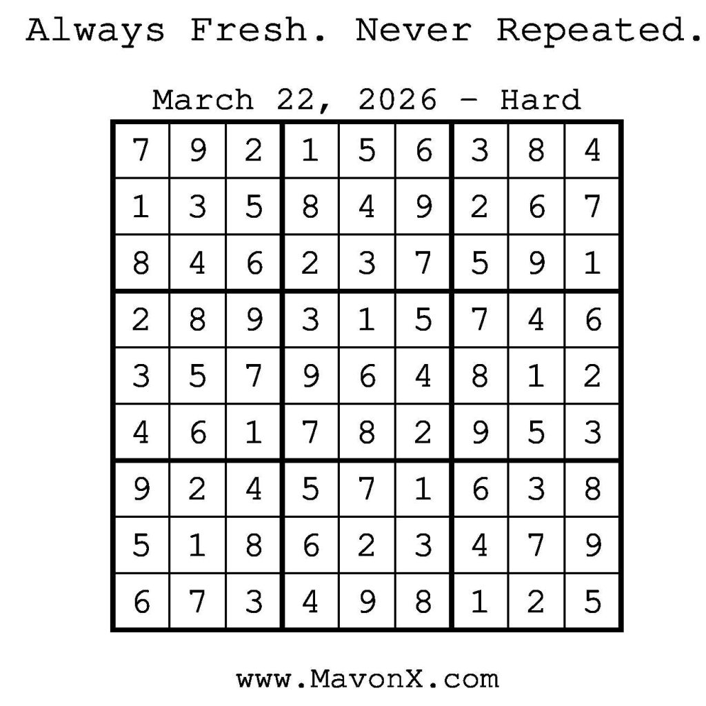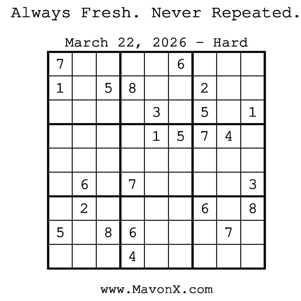 Puzzles of the Day – March 22, 2026 Post author:admin Post published:March 22, 2026 Post category:Free Stuff / Puzzle of the Day / Puzzle of the Day Solutions / Solutions Post comments:0 Comments Check out our books on Amazon! Check out our books on Barnes and Noble! Check out our books on Etsy! Easy Sudoku Coach Link Medium Sudoku Coach Link Hard Sudoku Coach Link Show Solution You Might Also Like Puzzles of the Day – June 12, 2025 June 11, 2025 Puzzles of the Day – August 17, 2025 August 17, 2025 Puzzles of the Day – February 8, 2026 February 7, 2026 Leave a Reply Cancel replyCommentEnter your name or username to comment Enter your email address to comment Enter your website URL (optional) Save my name, email, and website in this browser for the next time I comment.