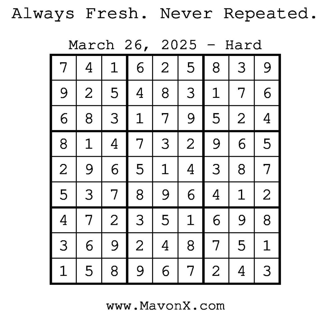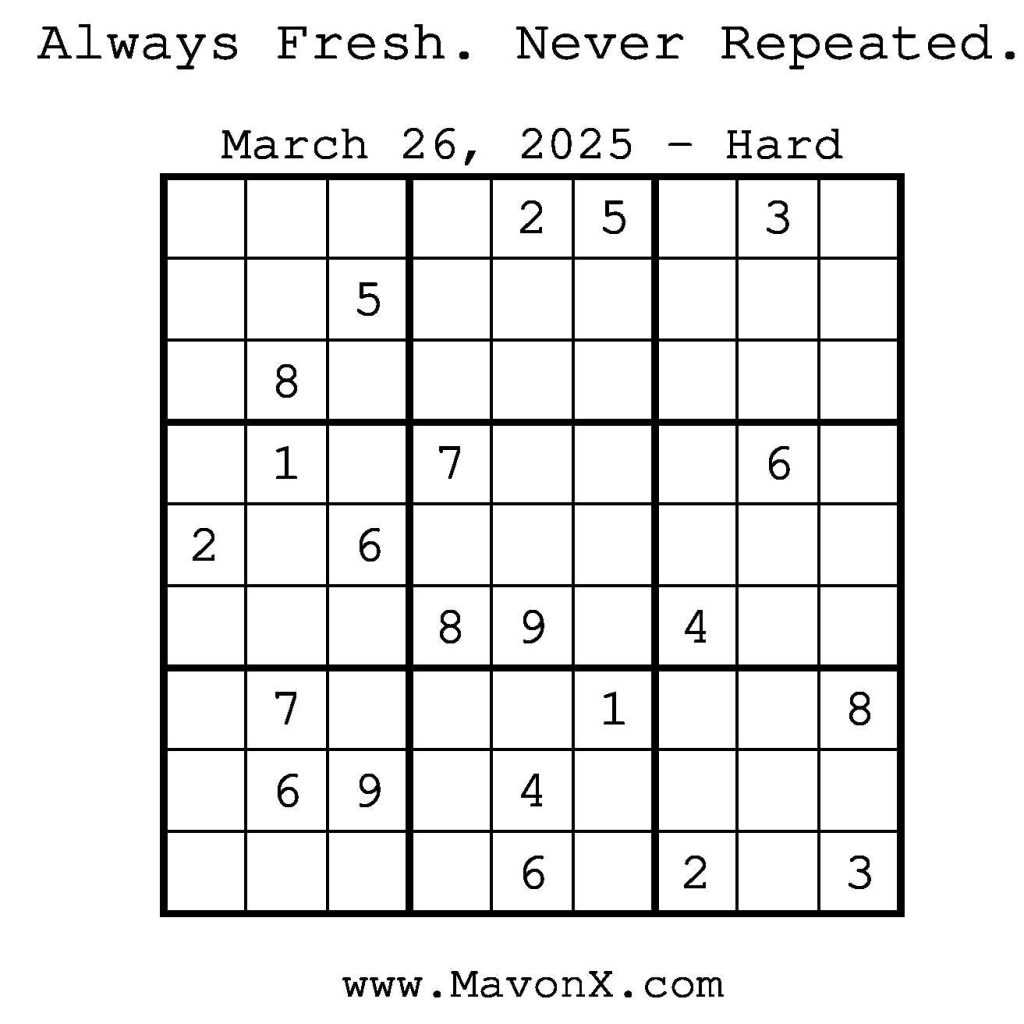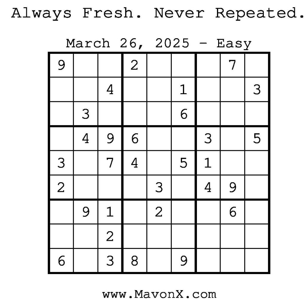Puzzles of the Day – March 26, 2025 Post author:admin Post published:March 25, 2025 Post category:Free Stuff / Puzzle of the Day / Puzzle of the Day Solutions / Solutions Post comments:0 Comments Check out our books on Amazon! Check out our books on Barnes and Noble! Check out our books on Etsy! Easy Sudoku Coach Link Medium Sudoku Coach Link Hard Sudoku Coach Link Show Solution You Might Also Like Puzzles of the Day – October 31, 2024 October 30, 2024 Puzzles of the Day – December 31, 2025 December 31, 2025 Puzzles of the Day – September 23, 2024 September 23, 2024 Leave a Reply Cancel replyCommentEnter your name or username to comment Enter your email address to comment Enter your website URL (optional) Save my name, email, and website in this browser for the next time I comment.
