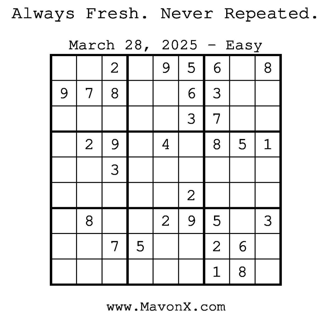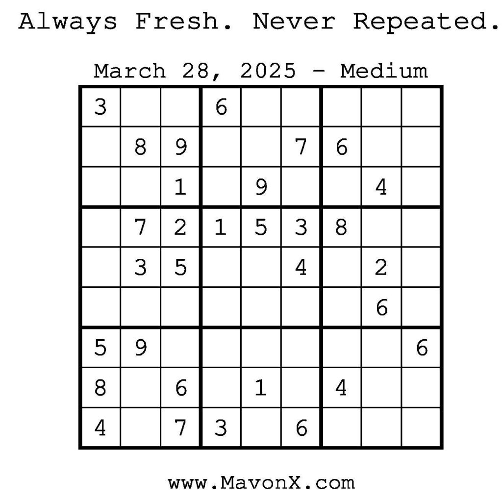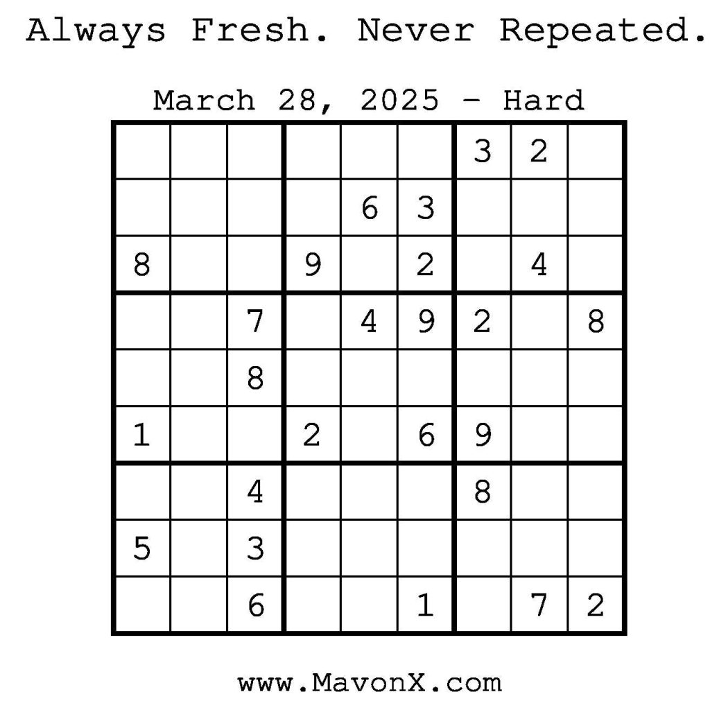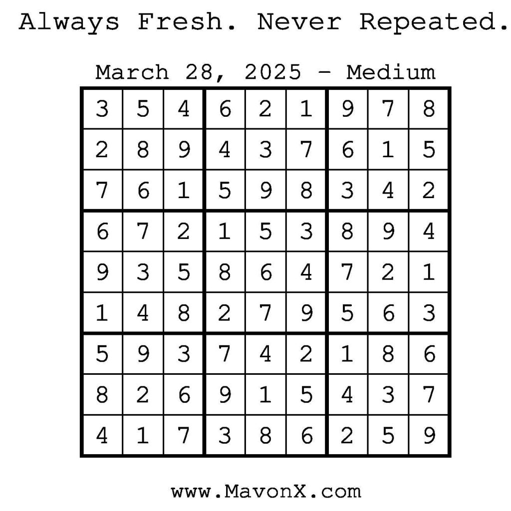 Puzzles of the Day – March 28, 2025 Post author:admin Post published:March 28, 2025 Post category:Free Stuff / Puzzle of the Day / Puzzle of the Day Solutions / Solutions Post comments:0 Comments Check out our books on Amazon! Check out our books on Barnes and Noble! Check out our books on Etsy! Easy Sudoku Coach Link Medium Sudoku Coach Link Hard Sudoku Coach Link Show Solution You Might Also Like Puzzles of the Day – December 12, 2025 December 12, 2025 Puzzles of the Day – October 10, 2025 October 10, 2025 Puzzles of the Day – August 10, 2025 August 9, 2025 Leave a Reply Cancel replyCommentEnter your name or username to comment Enter your email address to comment Enter your website URL (optional) Save my name, email, and website in this browser for the next time I comment.