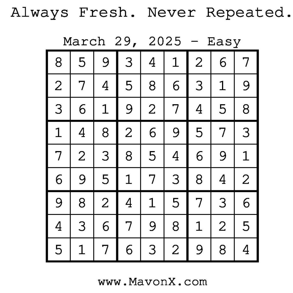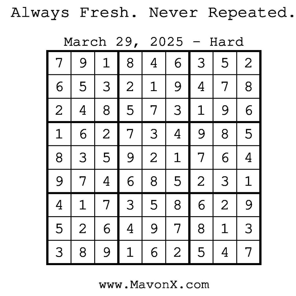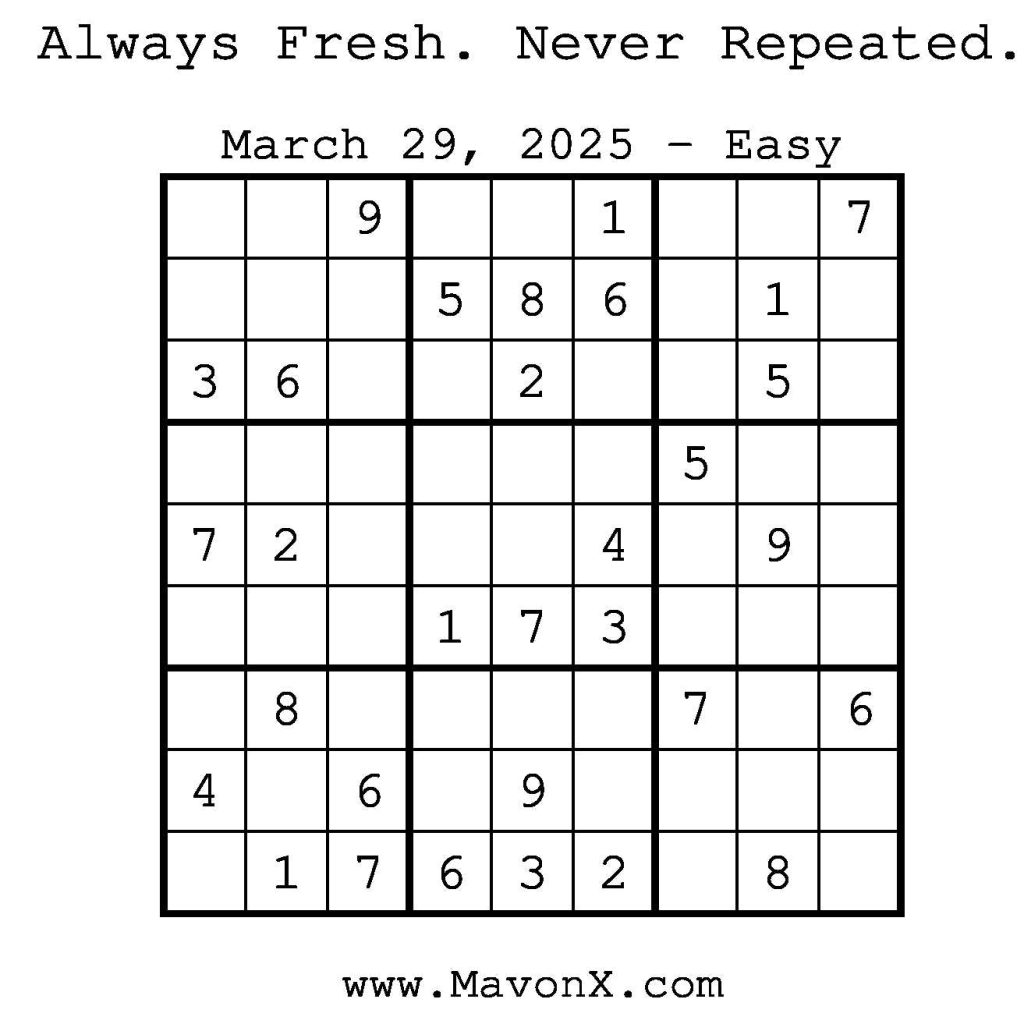 Puzzles of the Day – March 29, 2025 Post author:admin Post published:March 29, 2025 Post category:Free Stuff / Puzzle of the Day / Puzzle of the Day Solutions / Solutions Post comments:0 Comments Check out our books on Amazon! Check out our books on Barnes and Noble! Check out our books on Etsy! Easy Sudoku Coach Link Medium Sudoku Coach Link Hard Sudoku Coach Link Show Solution You Might Also Like Puzzles of the Day – May 2, 2025 May 1, 2025 Puzzles of the Day – March 8, 2025 March 7, 2025 Puzzles of the Day – January 22, 2025 January 22, 2025 Leave a Reply Cancel replyCommentEnter your name or username to comment Enter your email address to comment Enter your website URL (optional) Save my name, email, and website in this browser for the next time I comment.