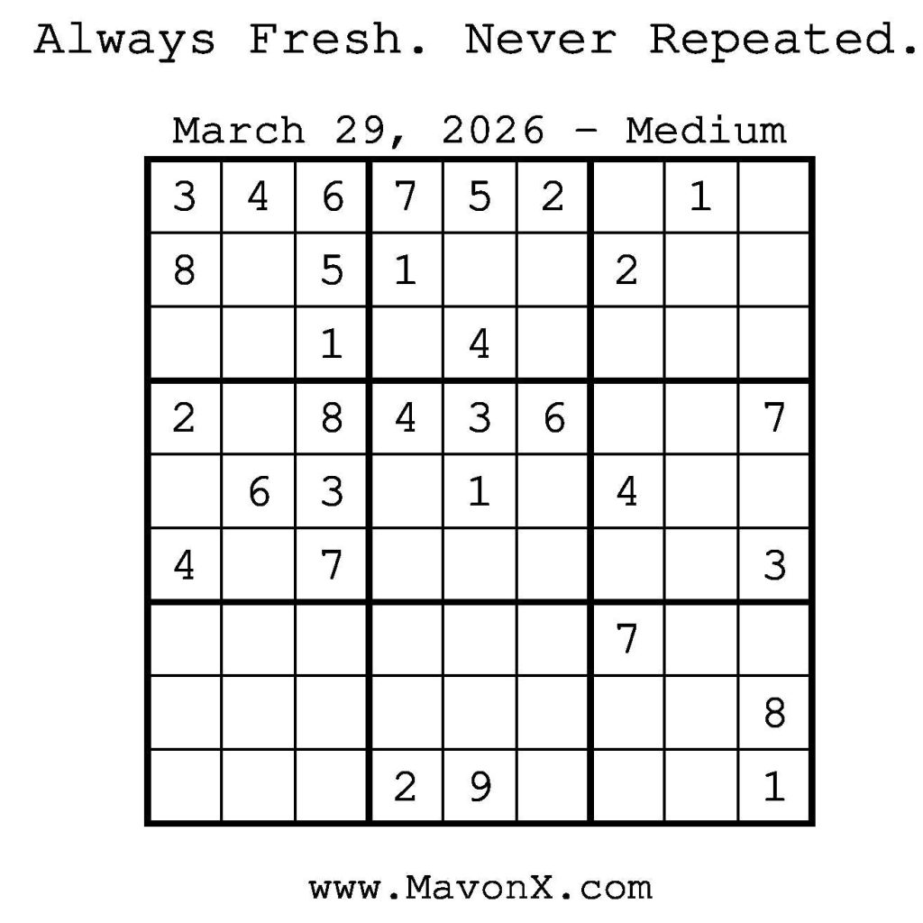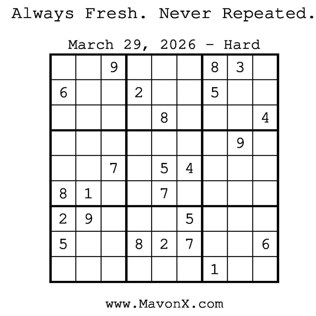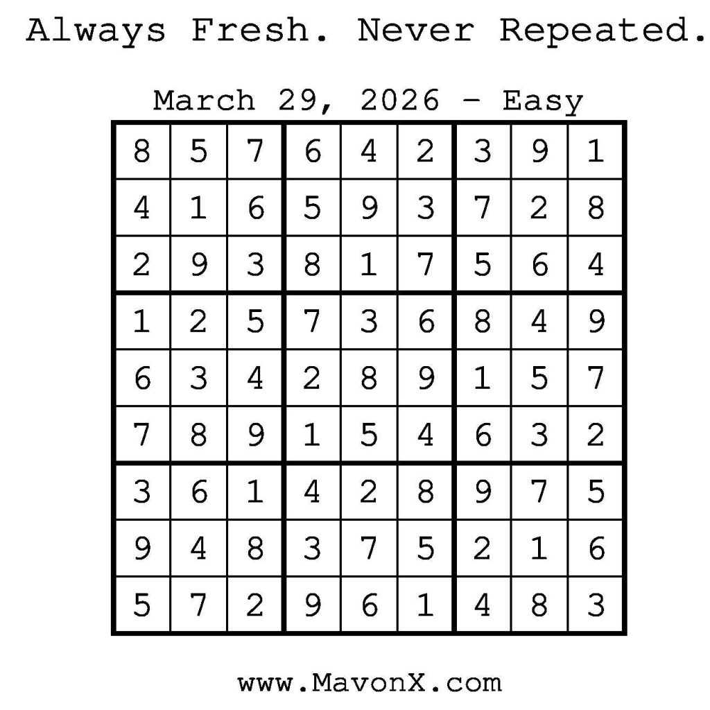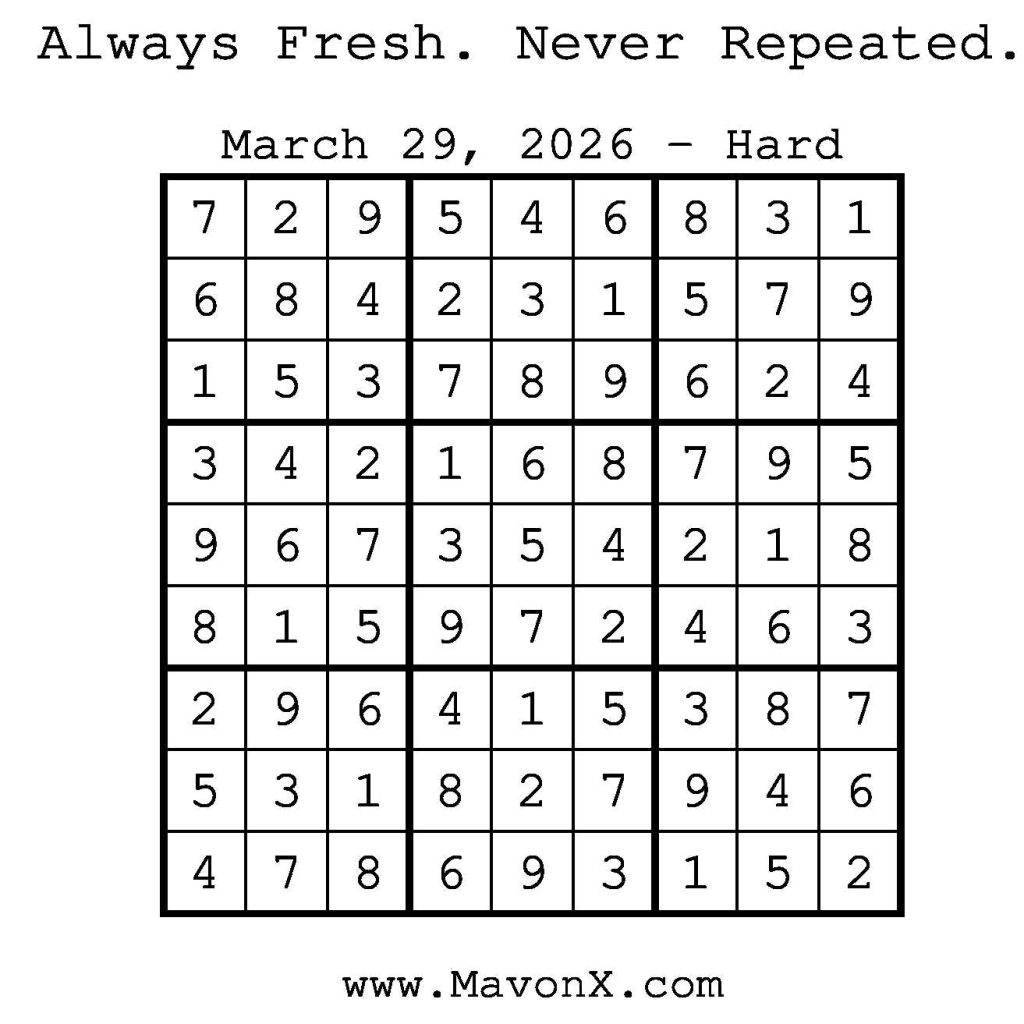 Puzzles of the Day – March 29, 2026 Post author:admin Post published:March 29, 2026 Post category:Free Stuff / Puzzle of the Day / Puzzle of the Day Solutions / Solutions Post comments:0 Comments Check out our books on Amazon! Check out our books on Barnes and Noble! Check out our books on Etsy! Easy Sudoku Coach Link Medium Sudoku Coach Link Hard Sudoku Coach Link Show Solution You Might Also Like Puzzles of the Day – August 29, 2025 August 29, 2025 Puzzles of the Day – August 30, 2025 August 29, 2025 Puzzles of the Day – December 10, 2024 December 9, 2024 Leave a Reply Cancel replyCommentEnter your name or username to comment Enter your email address to comment Enter your website URL (optional) Save my name, email, and website in this browser for the next time I comment.