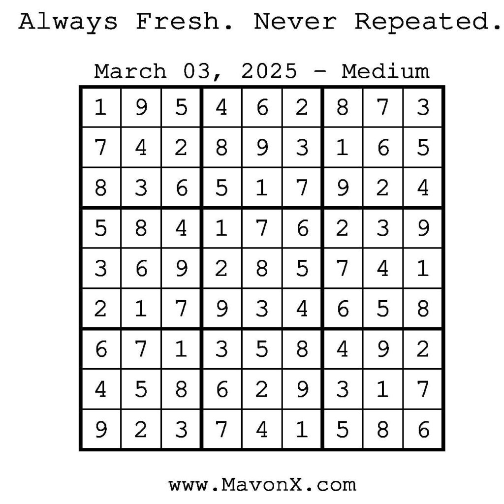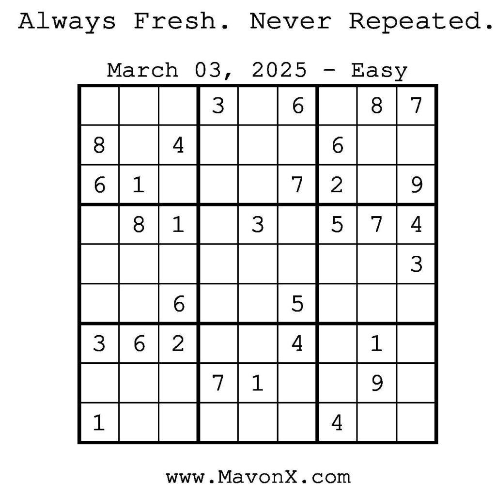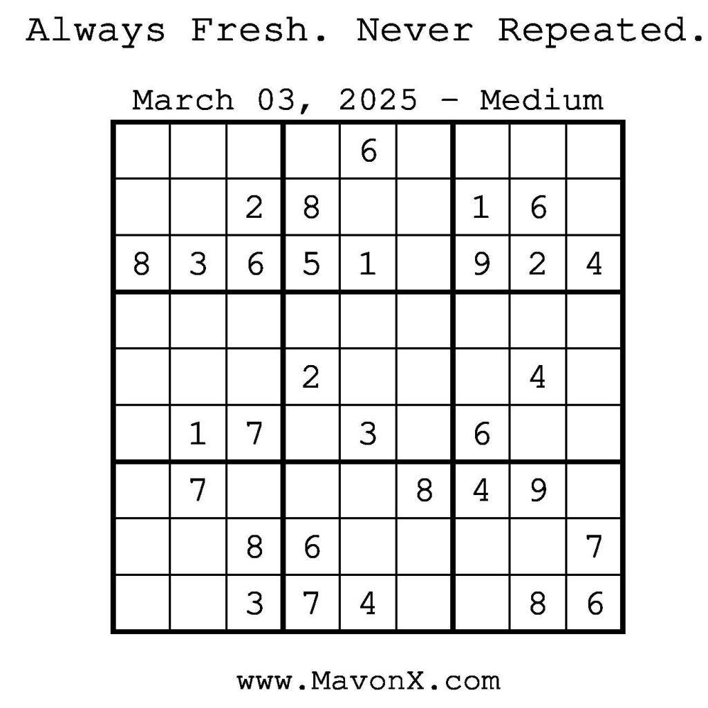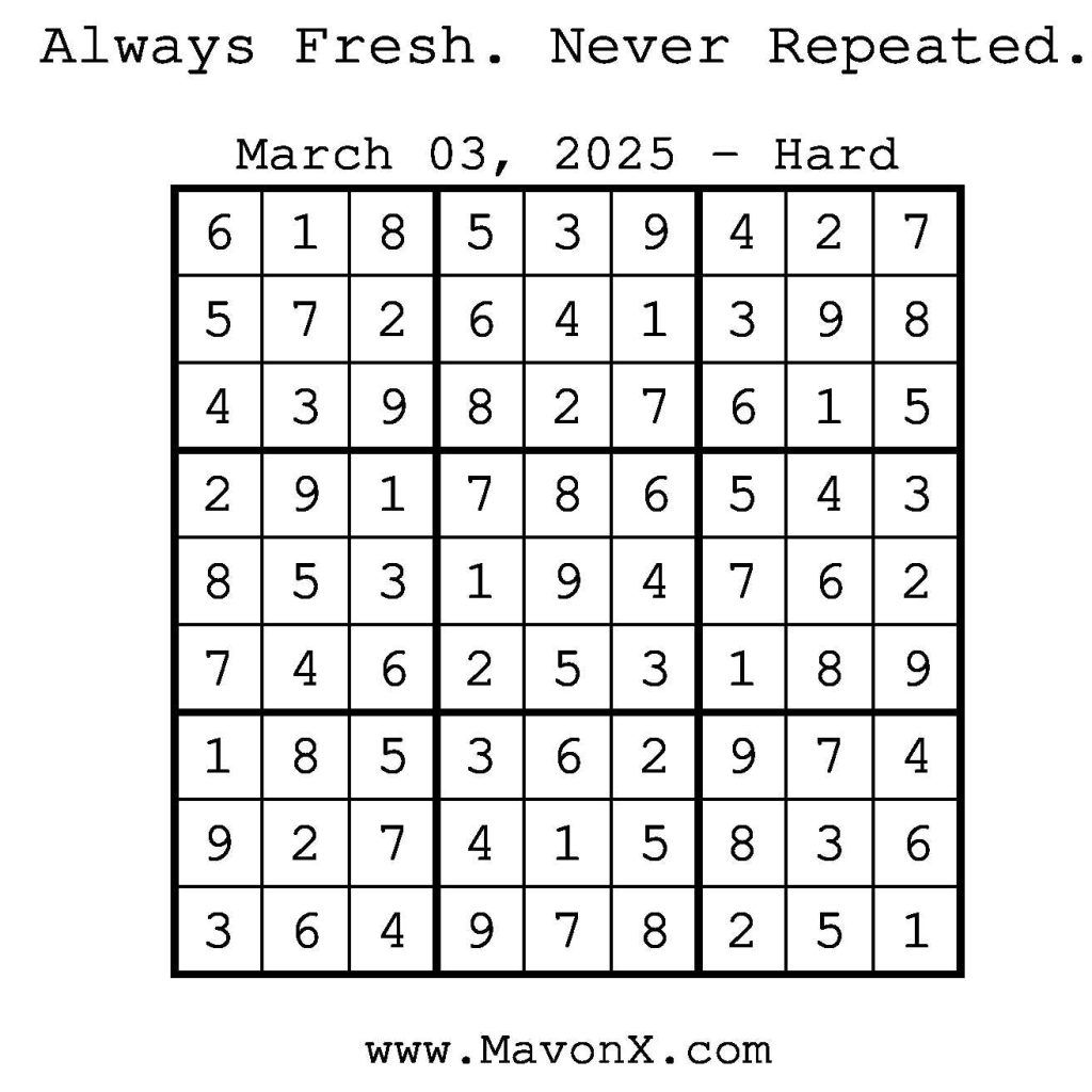 Puzzles of the Day – March 3, 2025 Post author:admin Post published:March 2, 2025 Post category:Free Stuff / Puzzle of the Day / Puzzle of the Day Solutions / Solutions Post comments:0 Comments Check out our books on Amazon! Check out our books on Barnes and Noble! Check out our books on Etsy! Easy Sudoku Coach Link Medium Sudoku Coach Link Hard Sudoku Coach Link Show Solution You Might Also Like Puzzles of the Day – January 2, 2026 January 1, 2026 Puzzles of the Day – March 22, 2026 March 22, 2026 Puzzles of the Day – January 6, 2025 January 6, 2025 Leave a Reply Cancel replyCommentEnter your name or username to comment Enter your email address to comment Enter your website URL (optional) Save my name, email, and website in this browser for the next time I comment.