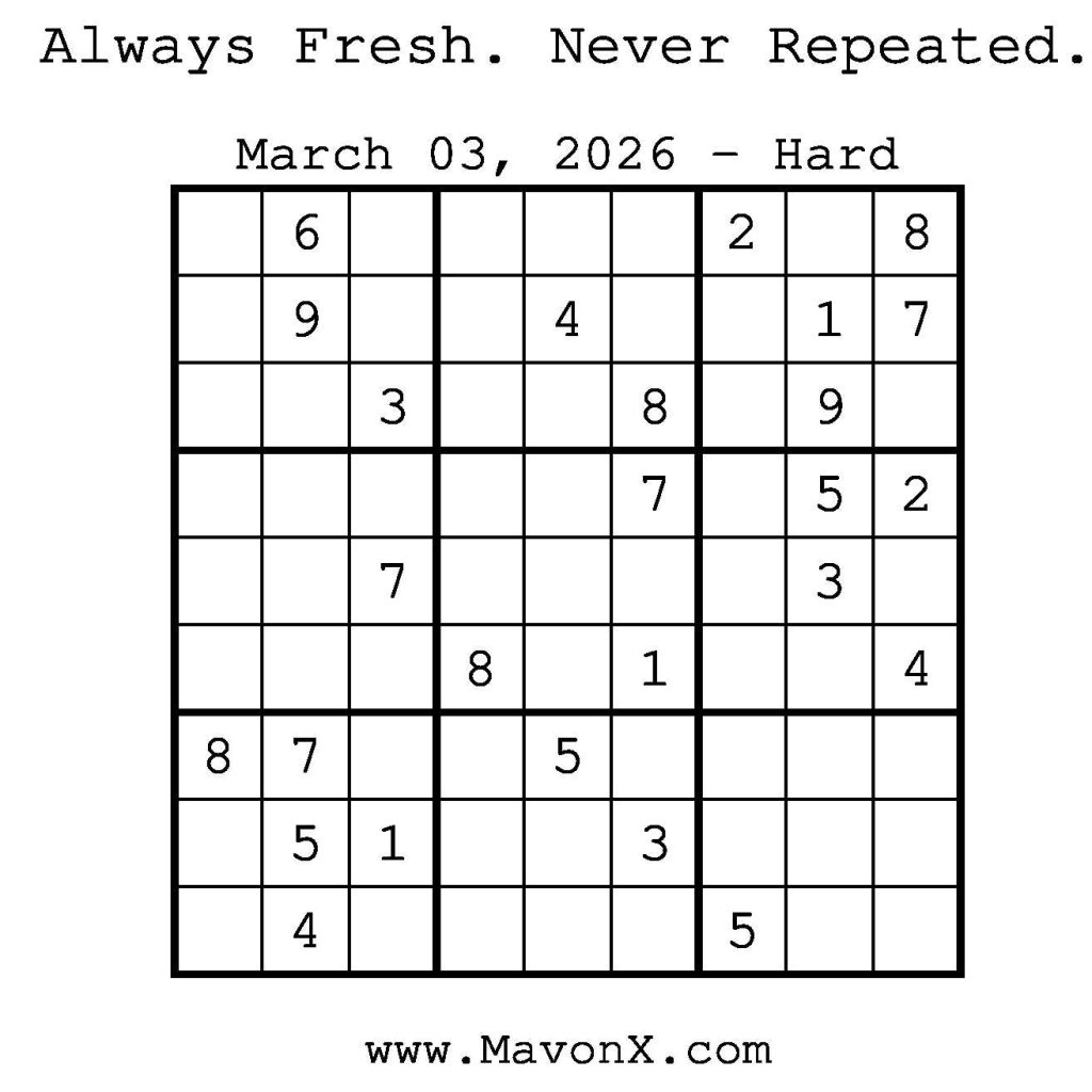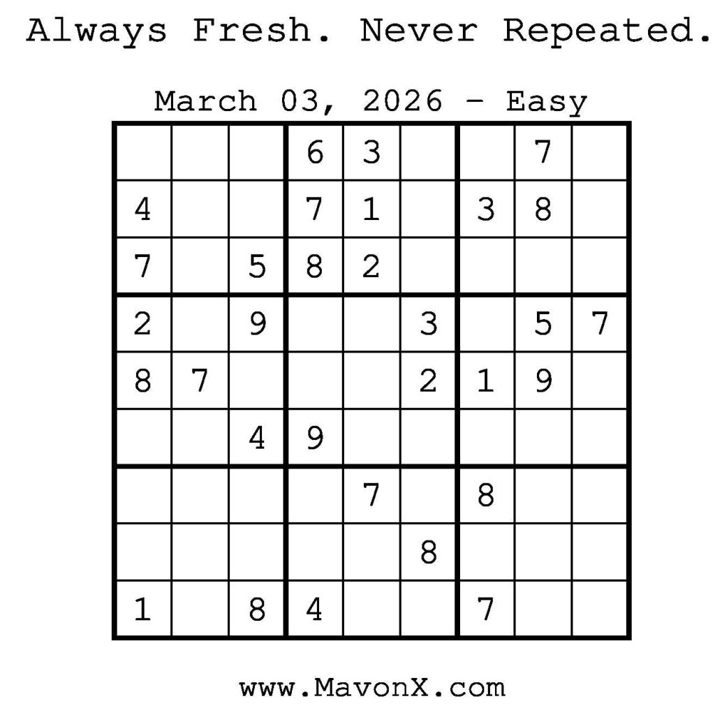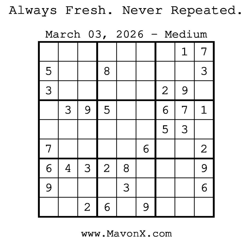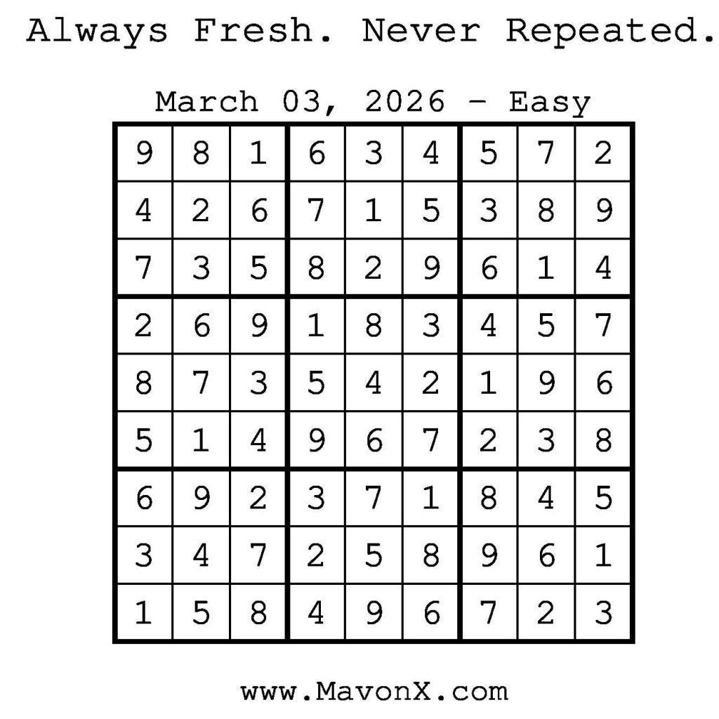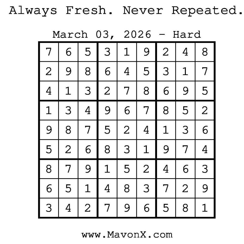 Puzzles of the Day – March 3, 2026 Post author:admin Post published:March 3, 2026 Post category:Free Stuff / Puzzle of the Day / Puzzle of the Day Solutions / Solutions Post comments:0 Comments Check out our books on Amazon! Check out our books on Barnes and Noble! Check out our books on Etsy! Easy Sudoku Coach Link Medium Sudoku Coach Link Hard Sudoku Coach Link Show Solution You Might Also Like Puzzles of the Day – February 4, 2025 February 3, 2025 Puzzles of the Day – May 14, 2025 May 13, 2025 Puzzles of the Day – January 4, 2025 January 4, 2025 Leave a Reply Cancel replyCommentEnter your name or username to comment Enter your email address to comment Enter your website URL (optional) Save my name, email, and website in this browser for the next time I comment.