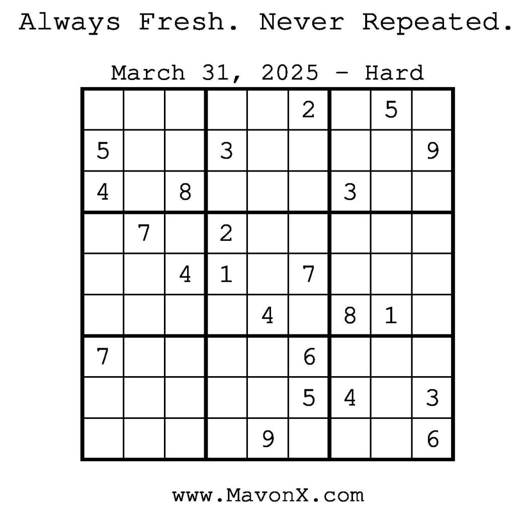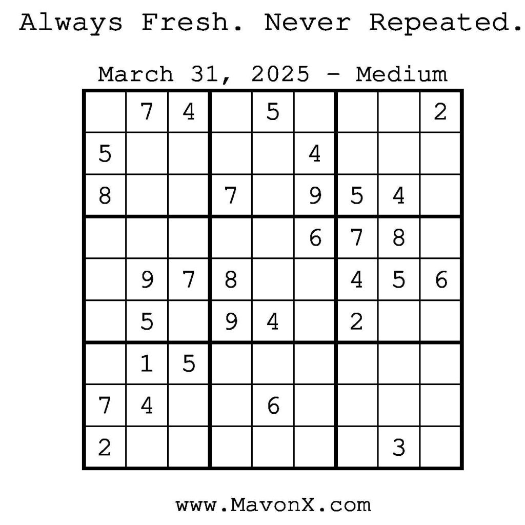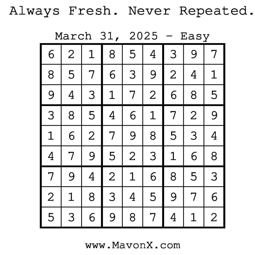 Puzzles of the Day – March 31, 2025 Post author:admin Post published:March 31, 2025 Post category:Free Stuff / Puzzle of the Day / Puzzle of the Day Solutions / Solutions Post comments:0 Comments Check out our books on Amazon! Check out our books on Barnes and Noble! Check out our books on Etsy! Easy Sudoku Coach Link Medium Sudoku Coach Link Hard Sudoku Coach Link Show Solution You Might Also Like Puzzles of the Day – October 17, 2025 October 16, 2025 Puzzles of the Day – May 11, 2025 May 10, 2025 Puzzles of the Day – March 6, 2026 March 5, 2026 Leave a Reply Cancel replyCommentEnter your name or username to comment Enter your email address to comment Enter your website URL (optional) Save my name, email, and website in this browser for the next time I comment.