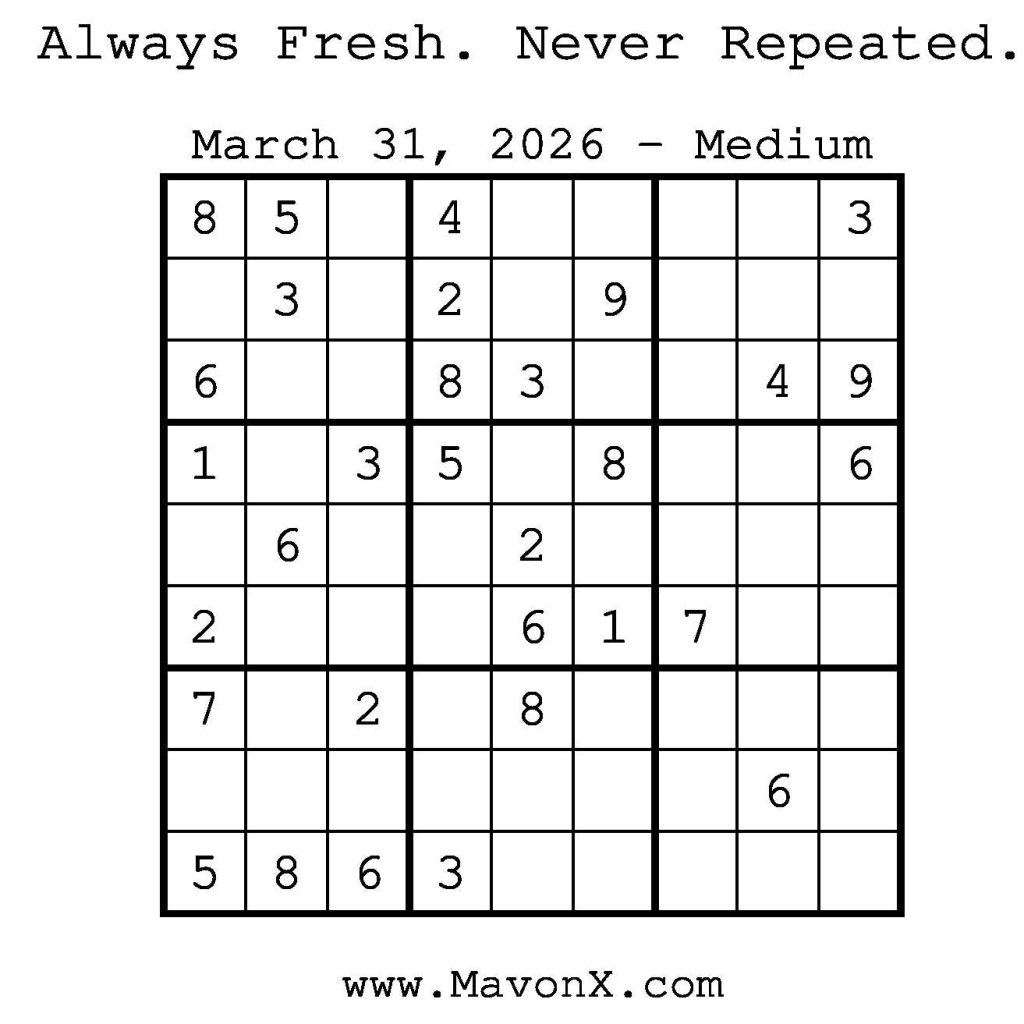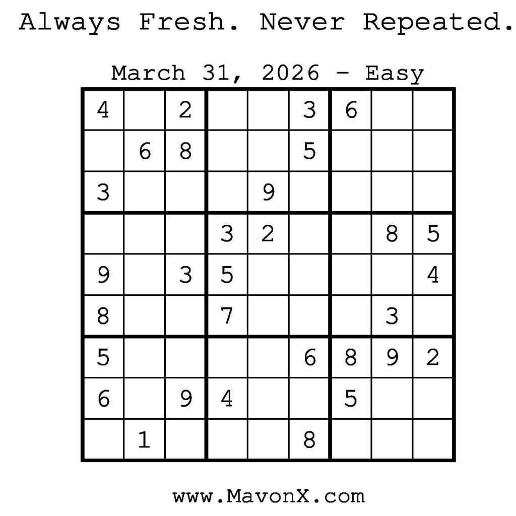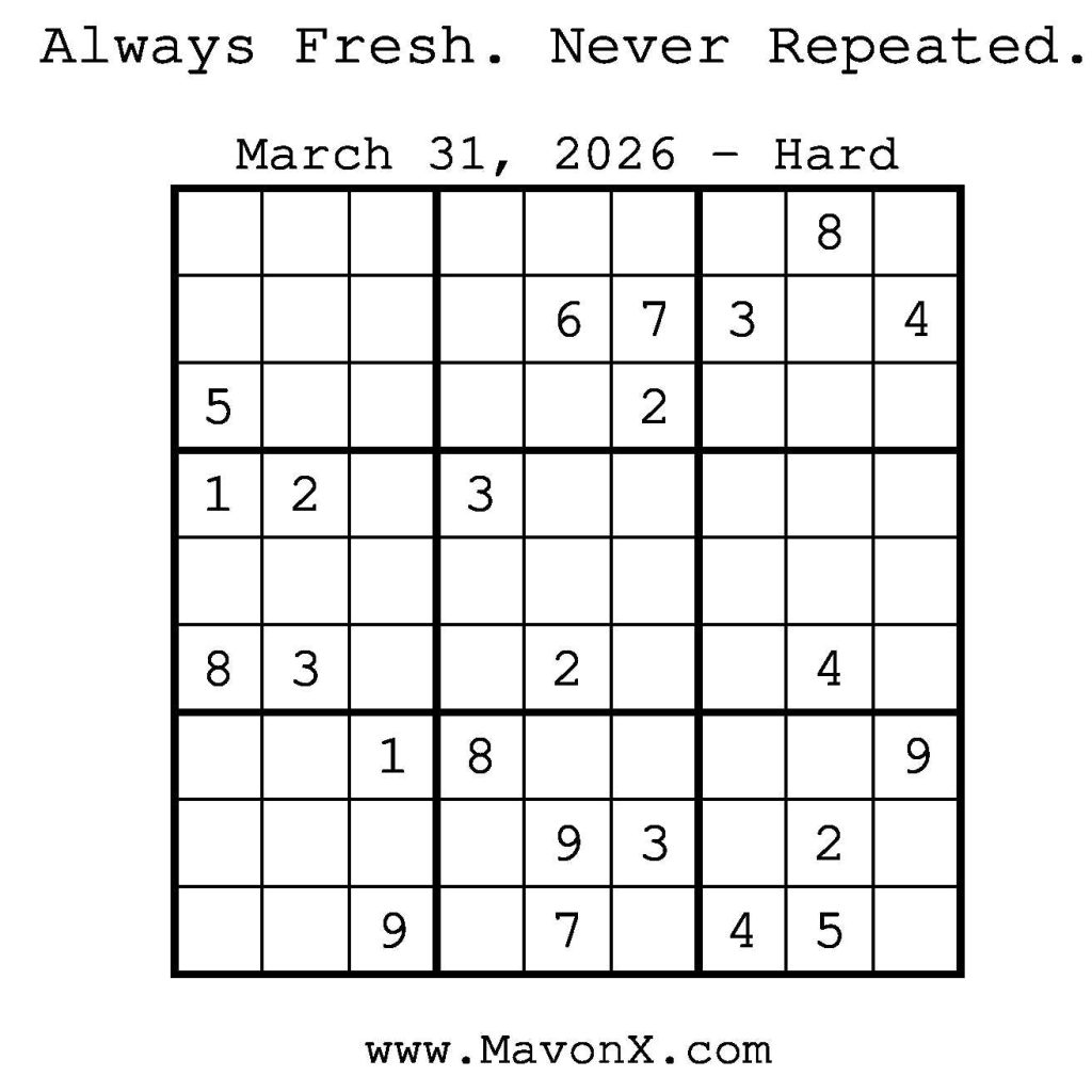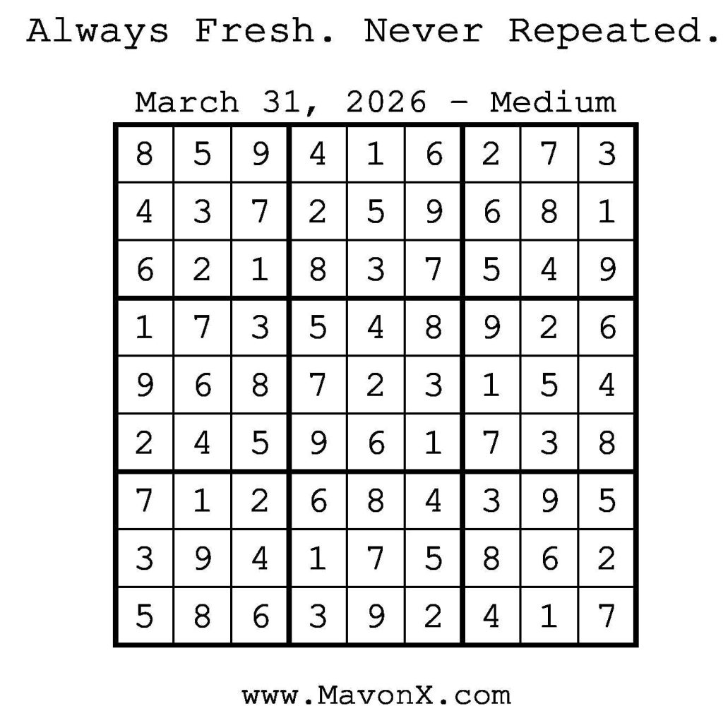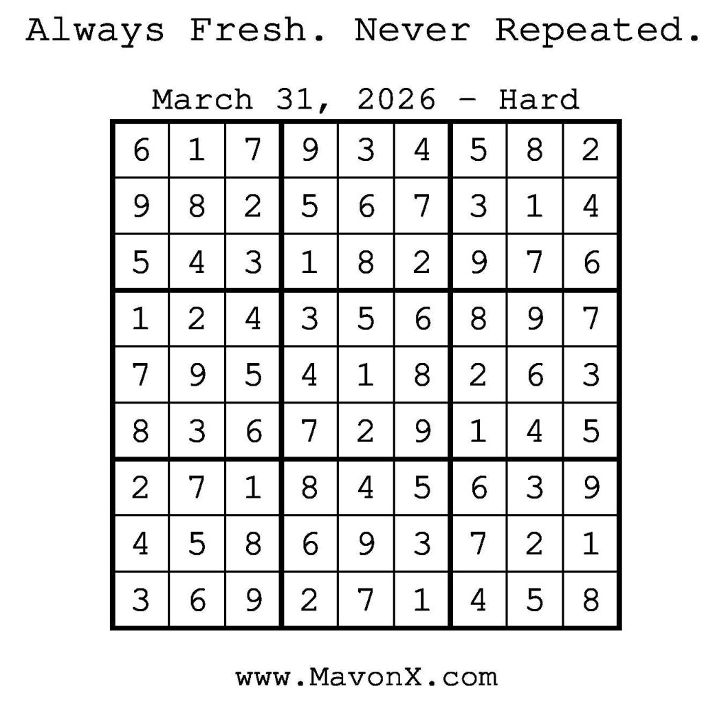Puzzles of the Day – March 31, 2026 Post author:admin Post published:March 29, 2026 Post category:Free Stuff / Puzzle of the Day / Puzzle of the Day Solutions / Solutions Post comments:0 Comments Check out our books on Amazon! Check out our books on Barnes and Noble! Check out our books on Etsy! Easy Sudoku Coach Link Medium Sudoku Coach Link Hard Sudoku Coach Link Show Solution You Might Also Like Puzzles of the Day – December 16, 2024 December 15, 2024 Puzzles of the Day – June 3, 2025 June 2, 2025 Puzzles of the Day – September 20, 2025 September 19, 2025 Leave a Reply Cancel replyCommentEnter your name or username to comment Enter your email address to comment Enter your website URL (optional) Save my name, email, and website in this browser for the next time I comment.