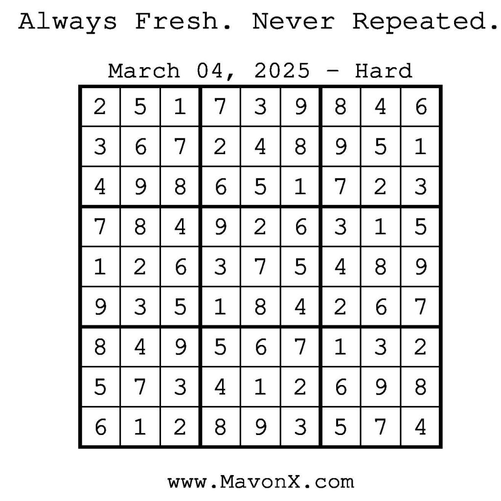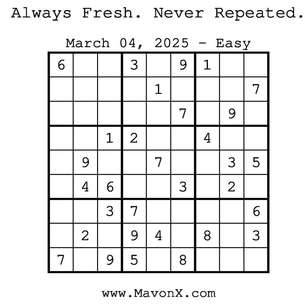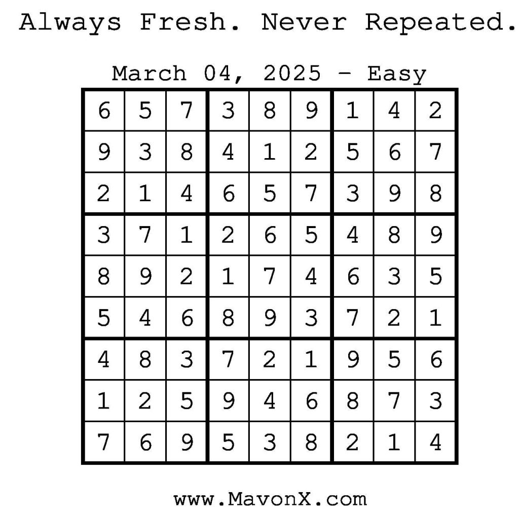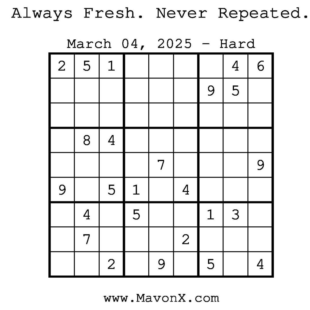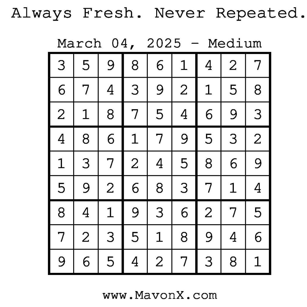 Puzzles of the Day – March 4, 2025 Post author:admin Post published:March 3, 2025 Post category:Free Stuff / Puzzle of the Day / Puzzle of the Day Solutions / Solutions Post comments:0 Comments Check out our books on Amazon! Check out our books on Barnes and Noble! Check out our books on Etsy! Easy Sudoku Coach Link Medium Sudoku Coach Link Hard Sudoku Coach Link Show Solution You Might Also Like Puzzles of the Day – May 18, 2025 May 17, 2025 Puzzles of the Day – February 12, 2025 February 13, 2025 Puzzles of the Day – February 19, 2026 February 18, 2026 Leave a Reply Cancel replyCommentEnter your name or username to comment Enter your email address to comment Enter your website URL (optional) Save my name, email, and website in this browser for the next time I comment.