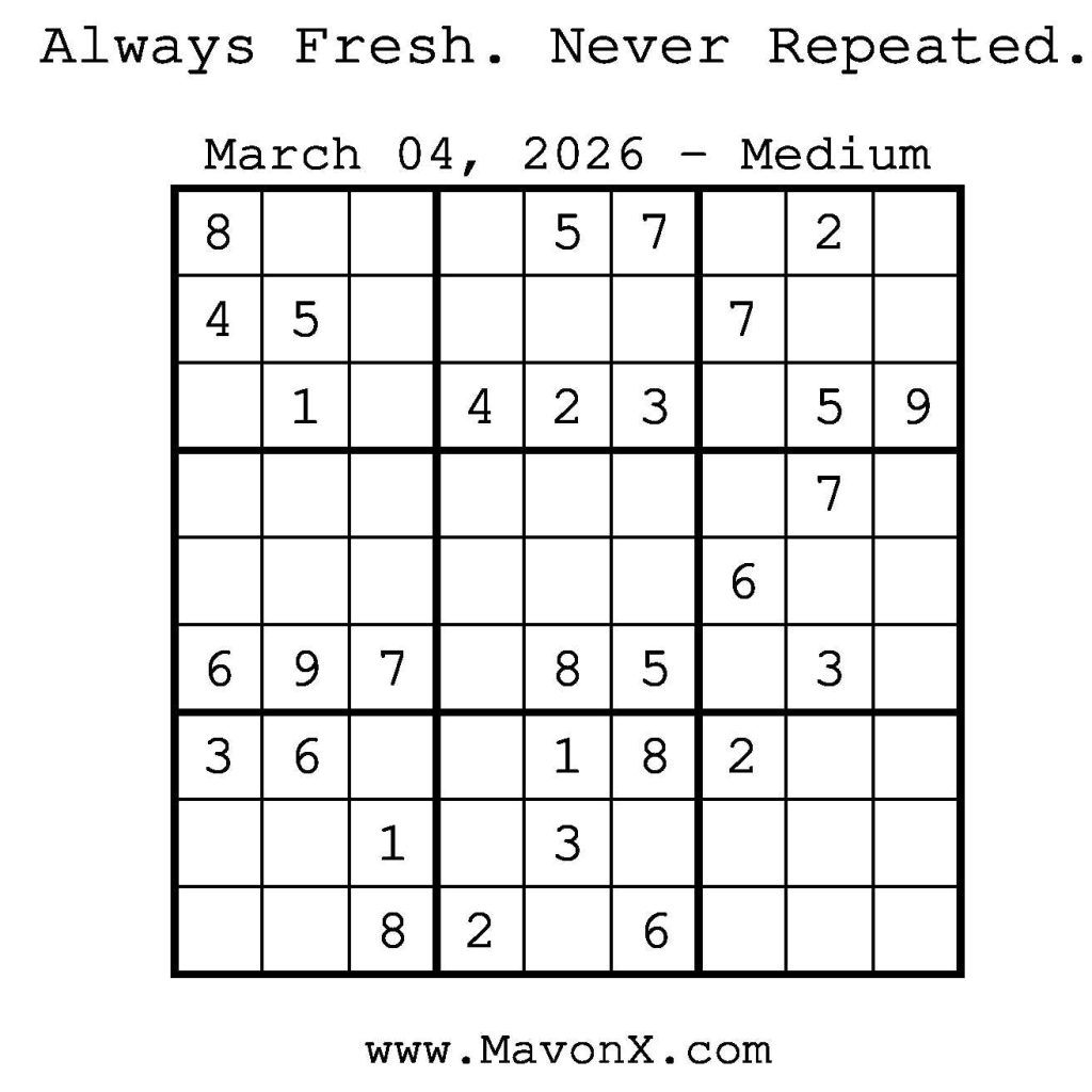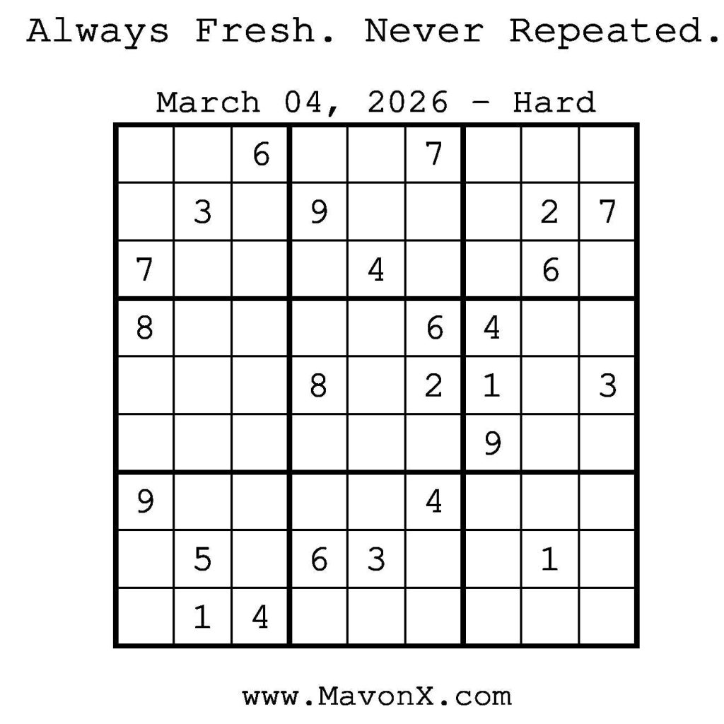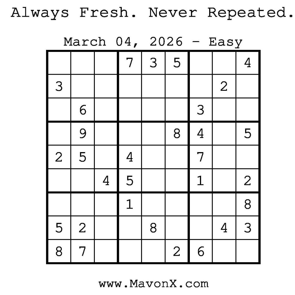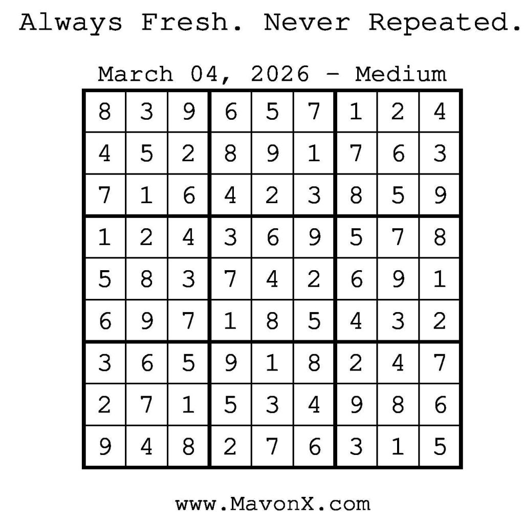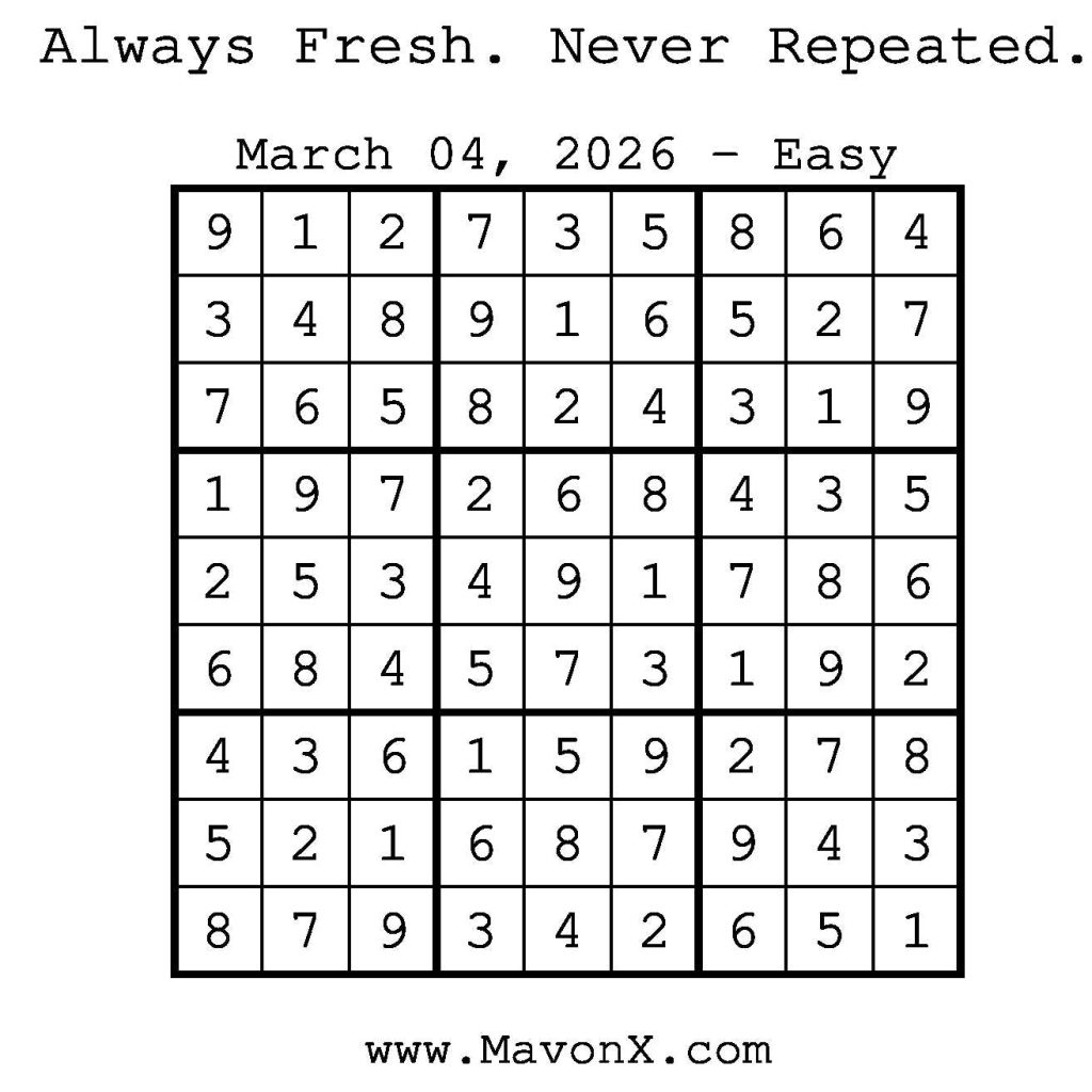 Puzzles of the Day – March 4, 2026 Post author:admin Post published:March 4, 2026 Post category:Free Stuff / Puzzle of the Day / Puzzle of the Day Solutions / Solutions Post comments:0 Comments Check out our books on Amazon! Check out our books on Barnes and Noble! Check out our books on Etsy! Easy Sudoku Coach Link Medium Sudoku Coach Link Hard Sudoku Coach Link Show Solution You Might Also Like Puzzles of the Day – November 20, 2024 November 19, 2024 Puzzles of the Day – September 7, 2025 September 6, 2025 Puzzles of the Day – March 6, 2025 March 6, 2025 Leave a Reply Cancel replyCommentEnter your name or username to comment Enter your email address to comment Enter your website URL (optional) Save my name, email, and website in this browser for the next time I comment.
