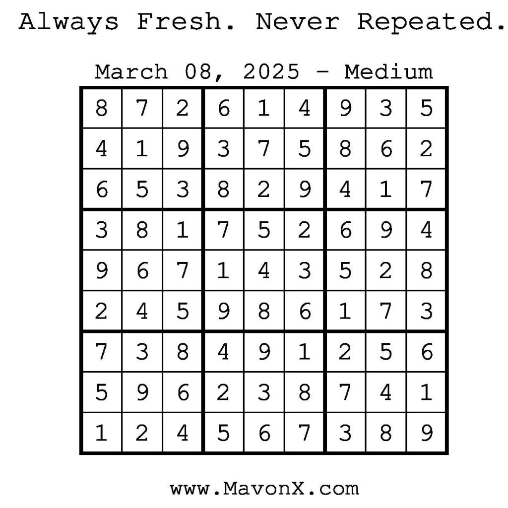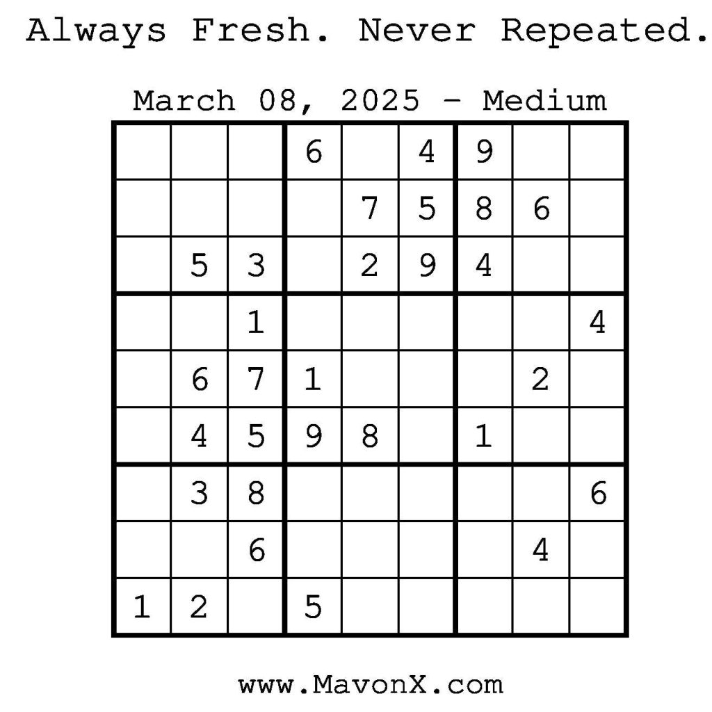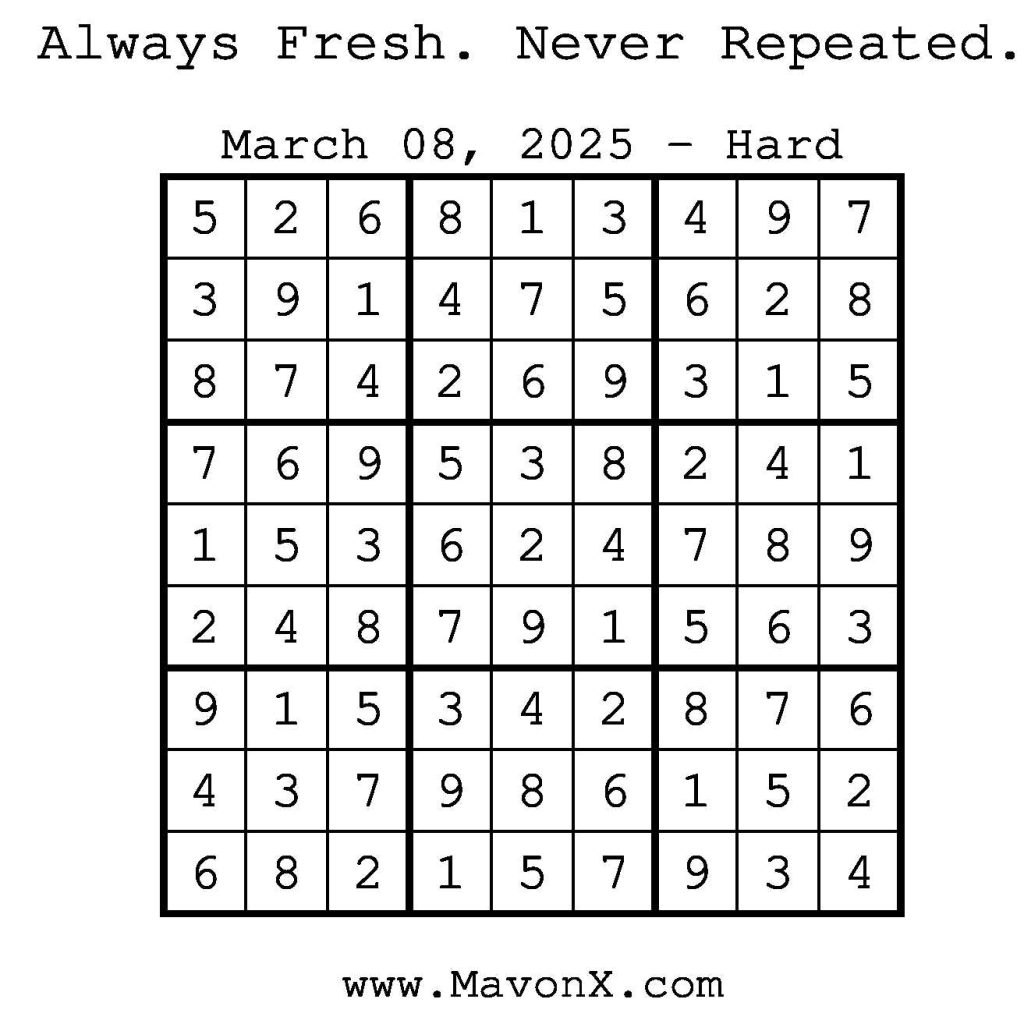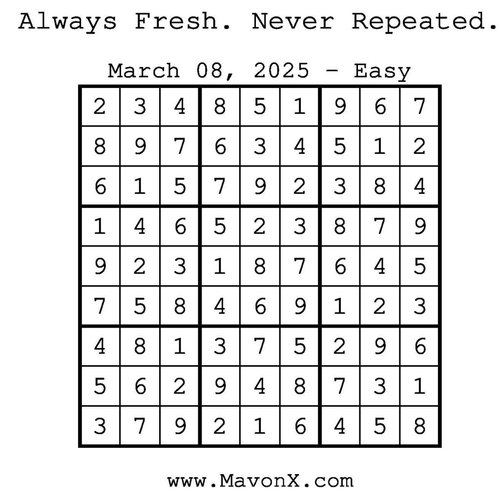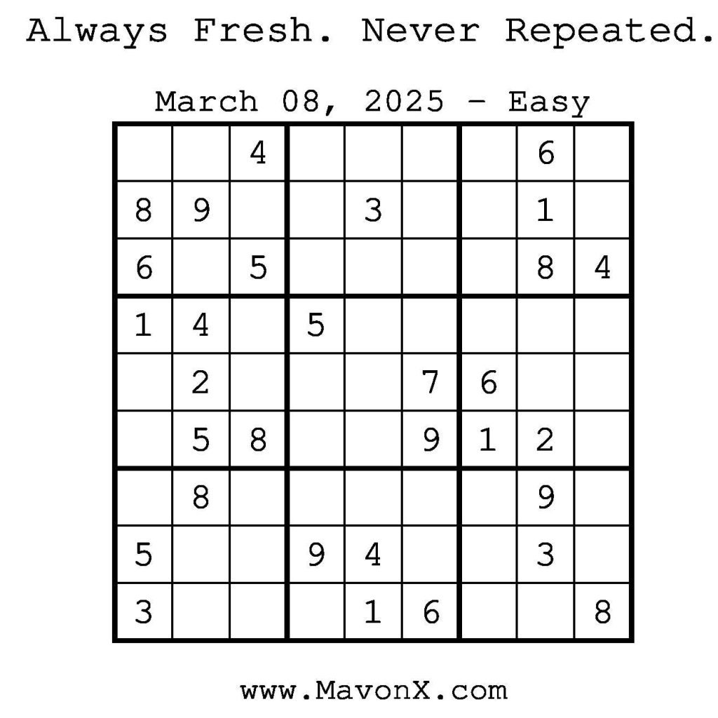 Puzzles of the Day – March 8, 2025 Post author:admin Post published:March 7, 2025 Post category:Free Stuff / Puzzle of the Day / Puzzle of the Day Solutions / Solutions Post comments:0 Comments Check out our books on Amazon! Check out our books on Barnes and Noble! Check out our books on Etsy! Easy Sudoku Coach Link Medium Sudoku Coach Link Hard Sudoku Coach Link Show Solution You Might Also Like Puzzles of the Day – February 21, 2025 February 21, 2025 Puzzles of the Day – September 16, 2025 September 15, 2025 Puzzles of the Day – December 25, 2025 December 24, 2025 Leave a Reply Cancel replyCommentEnter your name or username to comment Enter your email address to comment Enter your website URL (optional) Save my name, email, and website in this browser for the next time I comment.