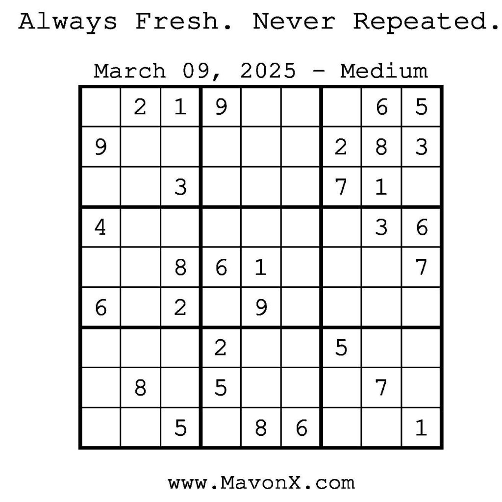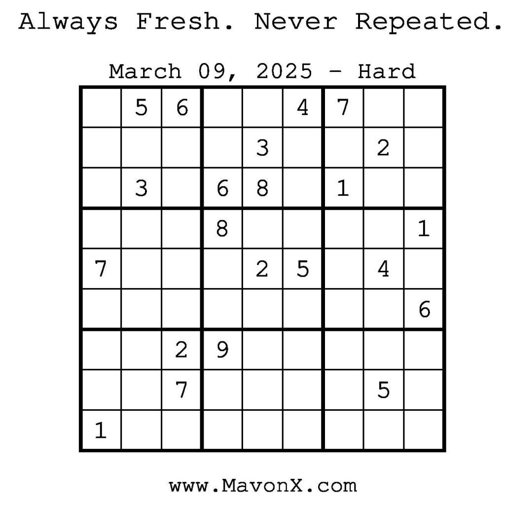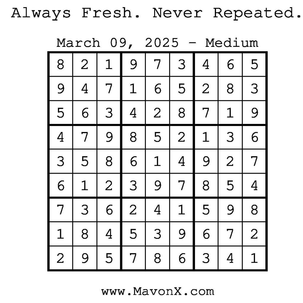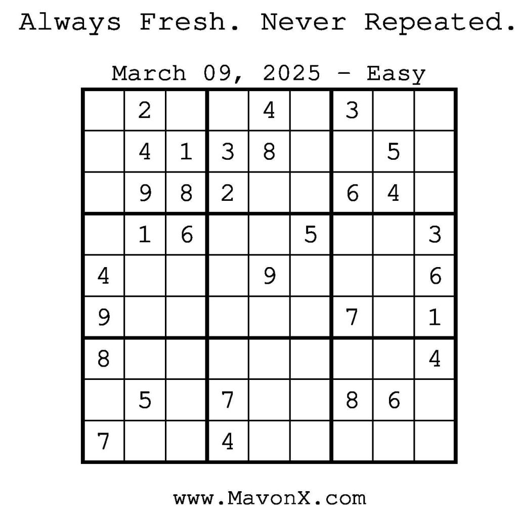Puzzles of the Day – March 9, 2025 Post author:admin Post published:March 8, 2025 Post category:Free Stuff / Puzzle of the Day / Puzzle of the Day Solutions / Solutions Post comments:0 Comments Check out our books on Amazon! Check out our books on Barnes and Noble! Check out our books on Etsy! Easy Sudoku Coach Link Medium Sudoku Coach Link Hard Sudoku Coach Link Show Solution You Might Also Like Puzzles of the Day – February 4, 2025 February 3, 2025 Puzzles of the Day – August 20, 2024 August 20, 2024 Puzzles of the Day – April 6, 2025 April 6, 2025 Leave a Reply Cancel replyCommentEnter your name or username to comment Enter your email address to comment Enter your website URL (optional) Save my name, email, and website in this browser for the next time I comment.