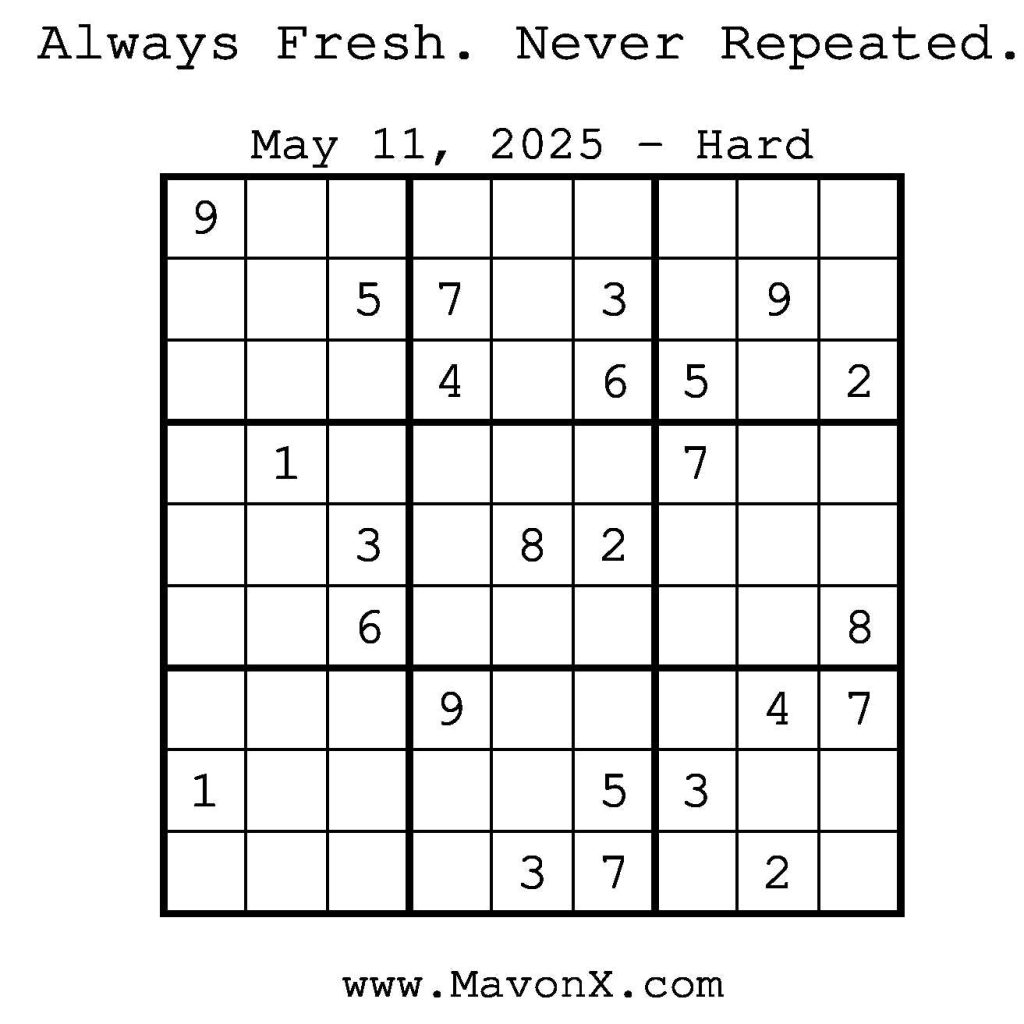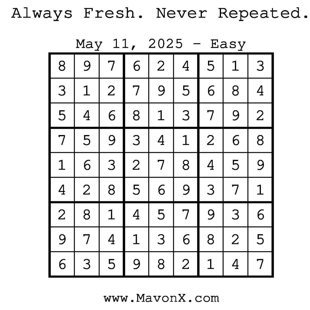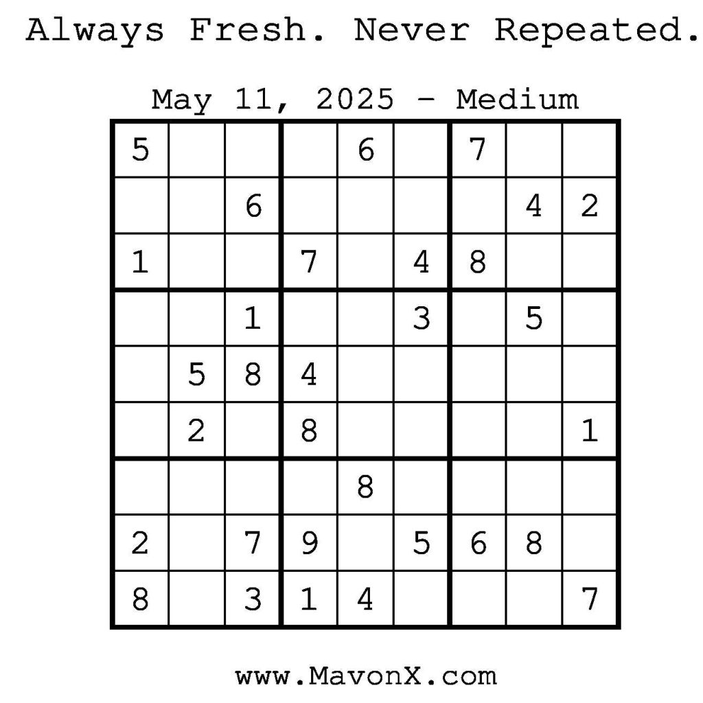 Puzzles of the Day – May 11, 2025 Post author:admin Post published:May 10, 2025 Post category:Free Stuff / Puzzle of the Day / Puzzle of the Day Solutions / Solutions Post comments:0 Comments Check out our books on Amazon! Check out our books on Barnes and Noble! Check out our books on Etsy! Easy Sudoku Coach Link Medium Sudoku Coach Link Hard Sudoku Coach Link Show Solution You Might Also Like Puzzles of the Day – April 14, 2025 April 14, 2025 Puzzles of the Day – May 26, 2025 May 26, 2025 Puzzles of the Day – December 30, 2024 December 30, 2024 Leave a Reply Cancel replyCommentEnter your name or username to comment Enter your email address to comment Enter your website URL (optional) Save my name, email, and website in this browser for the next time I comment.