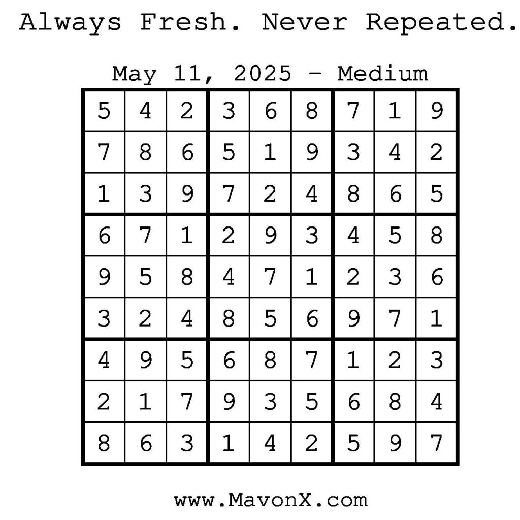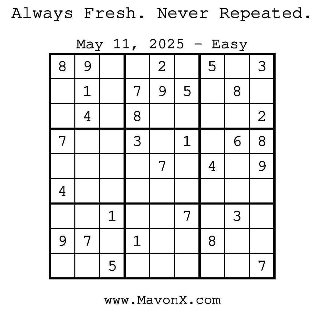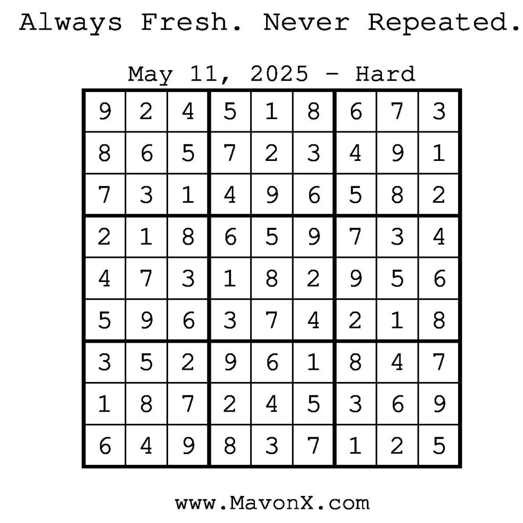 Puzzles of the Day – May 11, 2025 Post author:admin Post published:May 10, 2025 Post category:Free Stuff / Puzzle of the Day / Puzzle of the Day Solutions / Solutions Post comments:0 Comments Check out our books on Amazon! Check out our books on Barnes and Noble! Check out our books on Etsy! Easy Sudoku Coach Link Medium Sudoku Coach Link Hard Sudoku Coach Link Show Solution You Might Also Like Puzzles of the Day – April 14, 2025 April 14, 2025 Puzzles of the Day – May 26, 2025 May 26, 2025 Puzzles of the Day – December 30, 2024 December 30, 2024 Leave a Reply Cancel replyCommentEnter your name or username to comment Enter your email address to comment Enter your website URL (optional) Save my name, email, and website in this browser for the next time I comment.